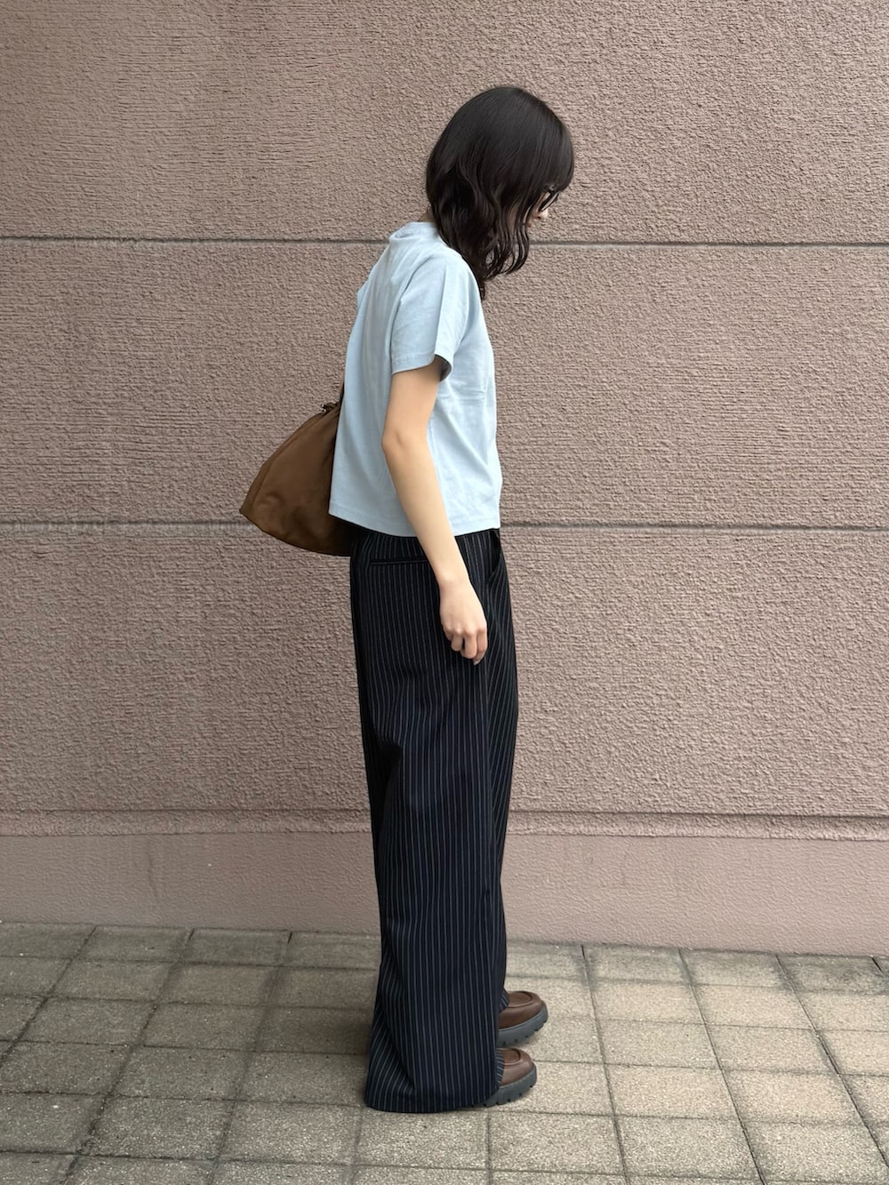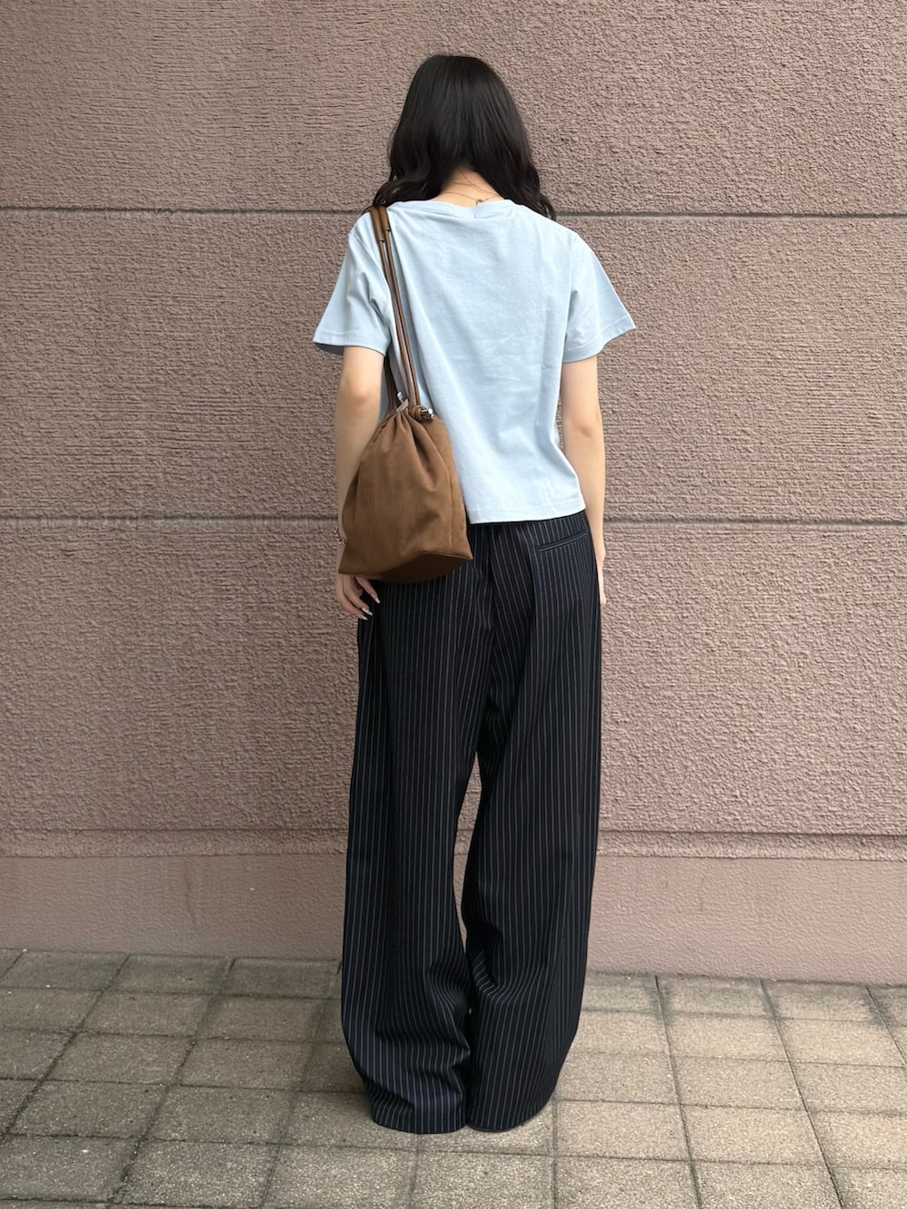 ボトムスはストレートパンツでシルエットとデザインが可愛いアイテムになっています!ネイビーに白のストライプが可愛いです!サイズを1つ大きくしてダボッと感を出してコーデしてみました!