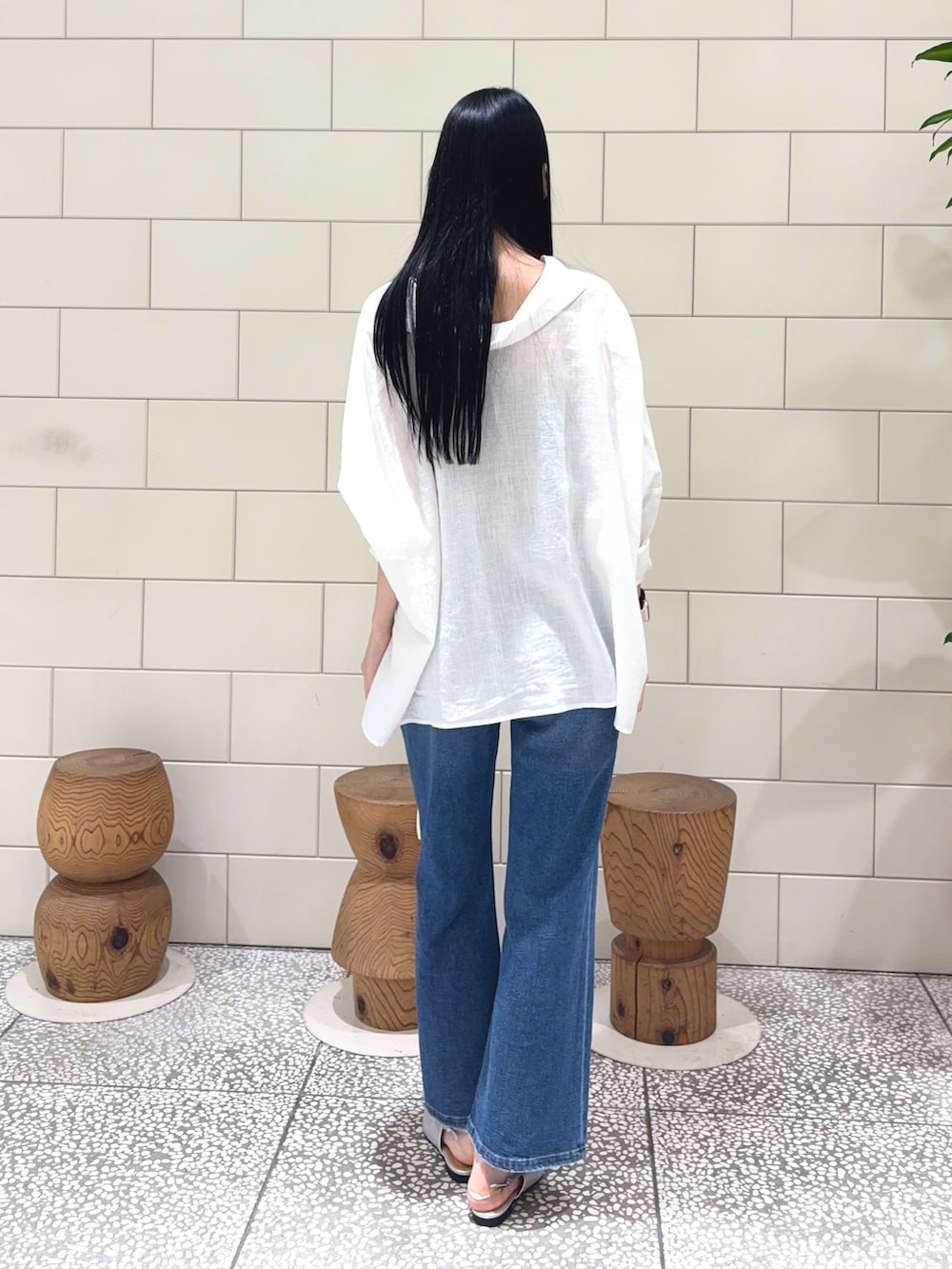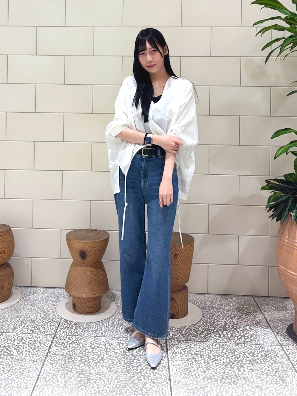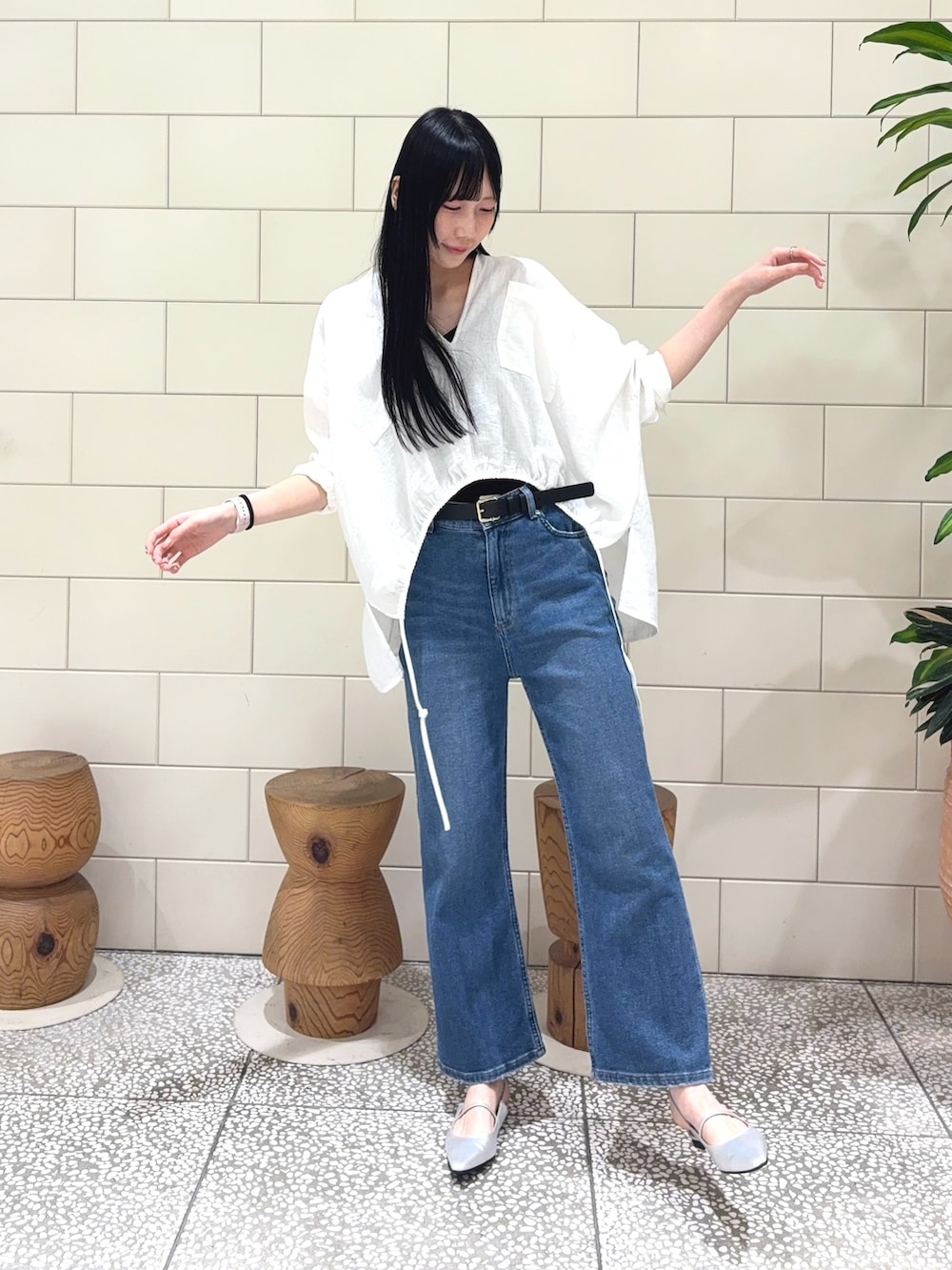トップスは丈が短くなっているのでタックインしなくてもこなれ感に着こなすことができさらに薄手の素材も抜け感が作れるのでとっても可愛いです!