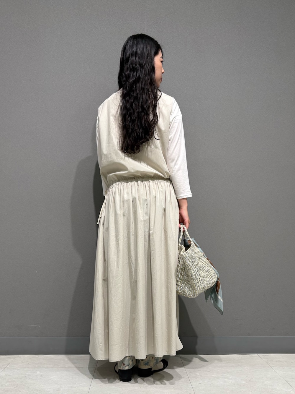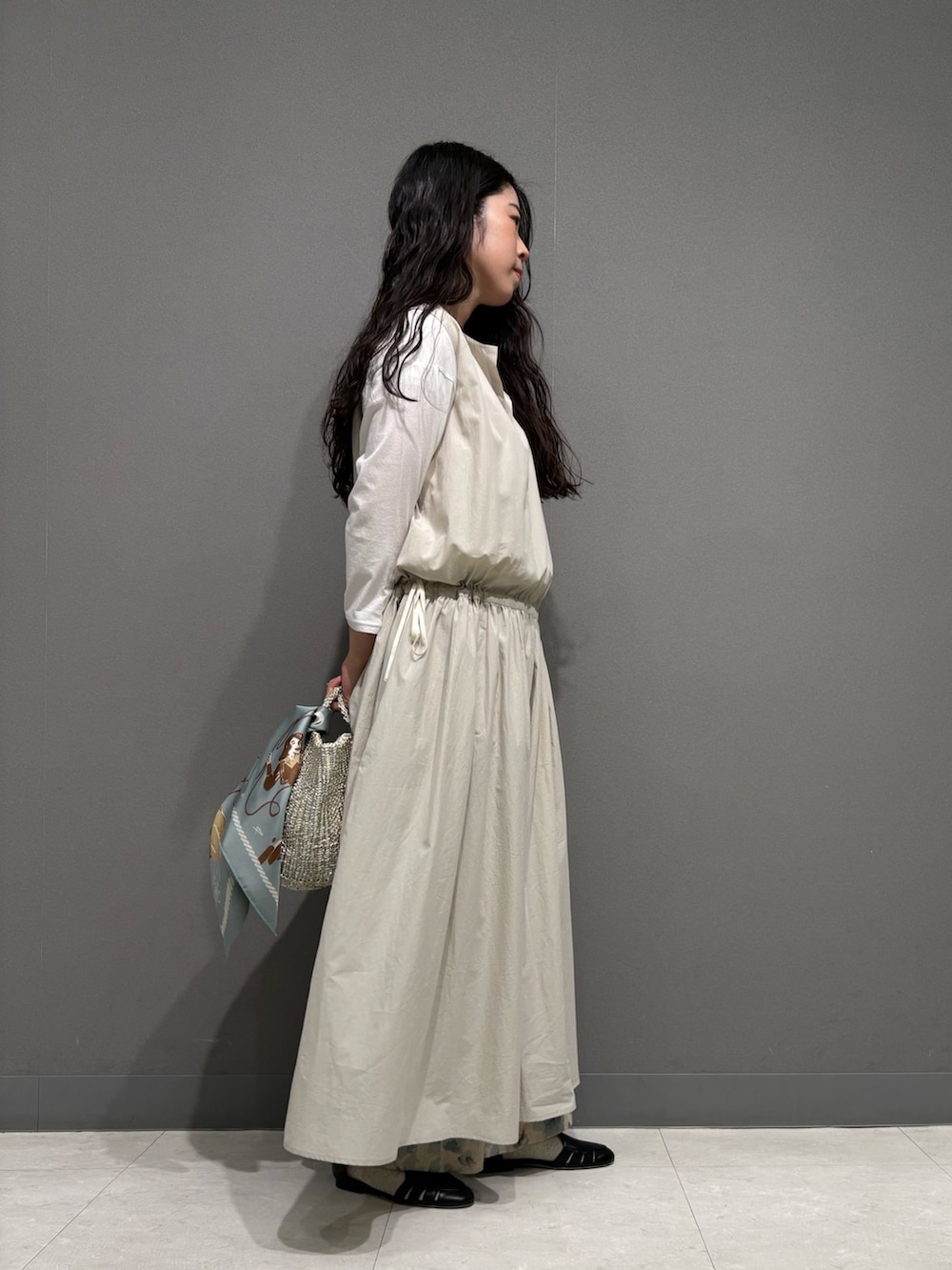 袖なしワンピースでとても軽く、腰で絞れるのでどなたでもスタイル良く決まりやすいです。