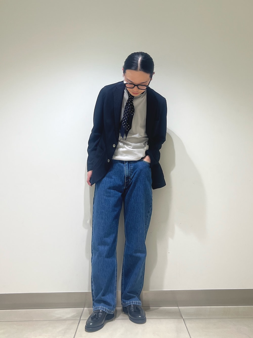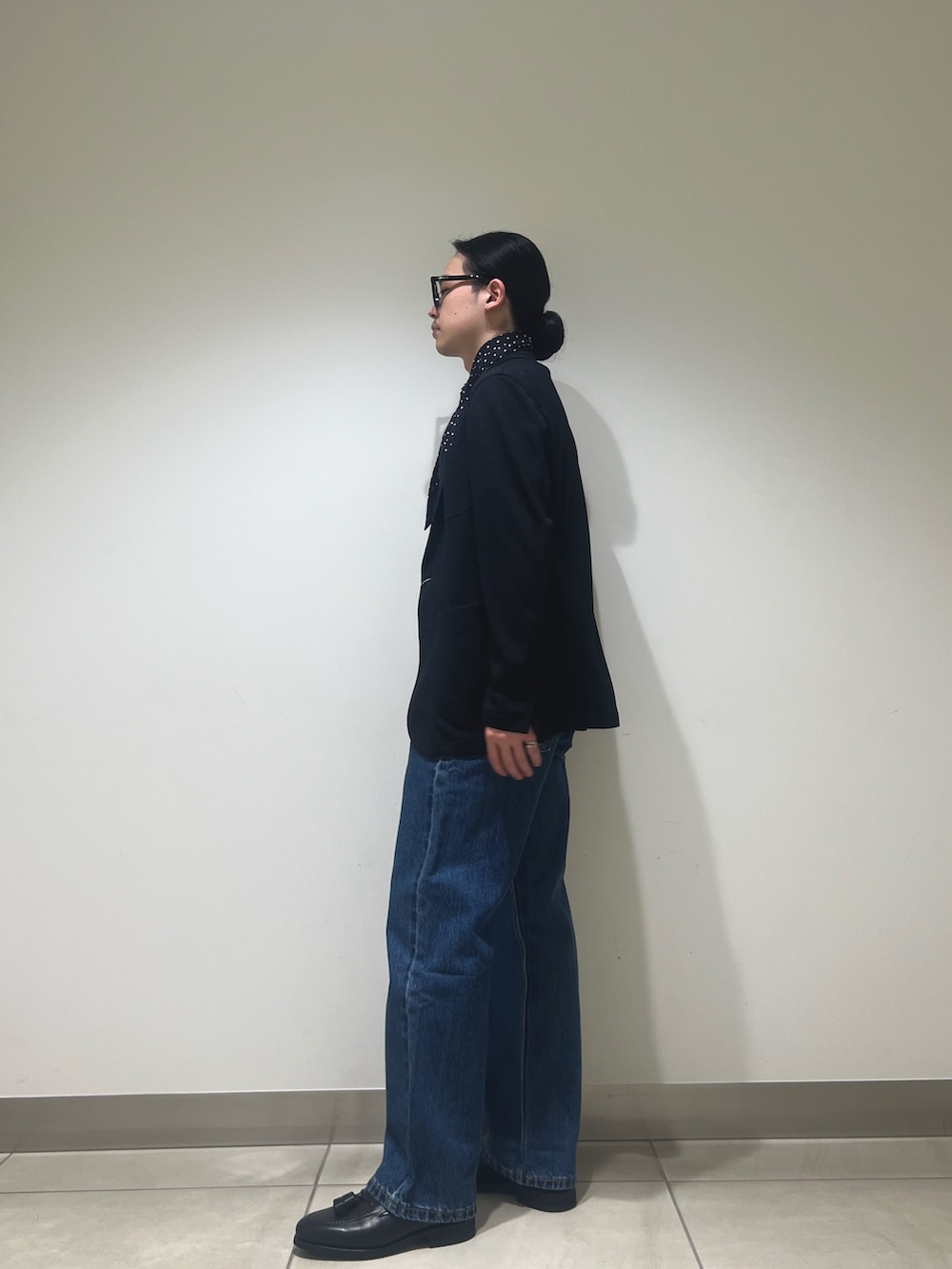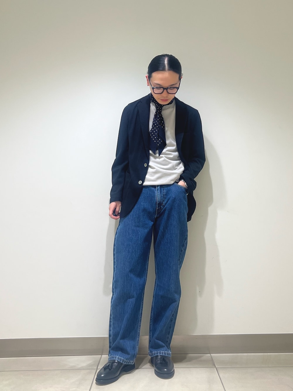 メランジのイージージャケットにハンカチーフで、少しカジュアルに落とし込んだジャケットスタイル