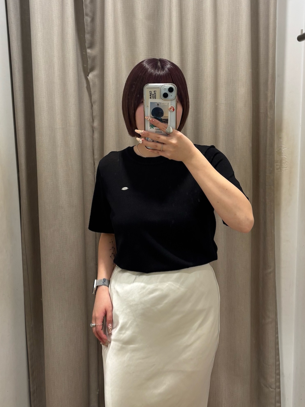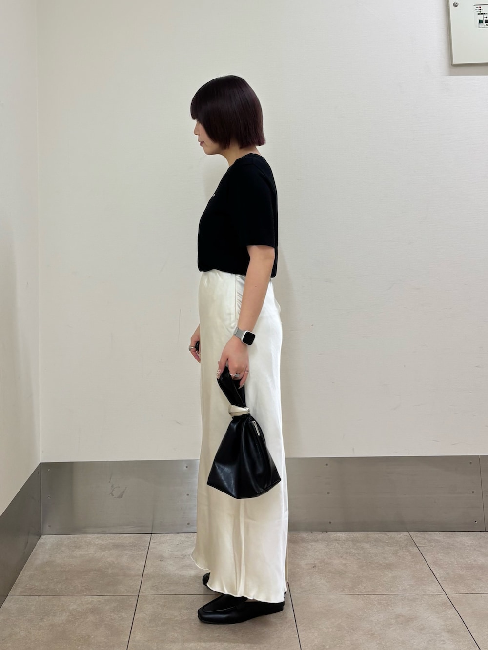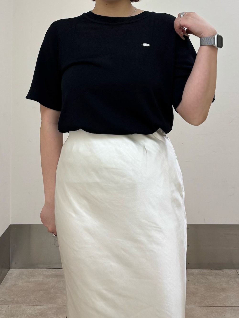 シンプルながらも胸元のプレートが上品さと高見えを演出してくれます!生地もサラッとして夏でも暑くないニット素材を使っているので、オフィスカジュアルなどでも着ていただけると思います🙆🏻♀️