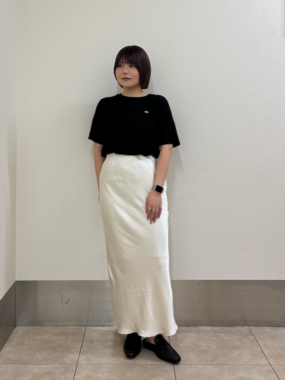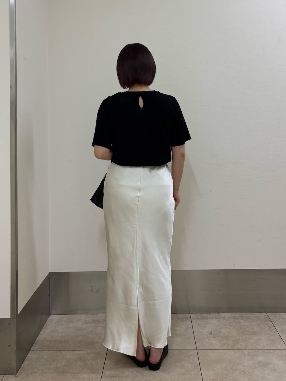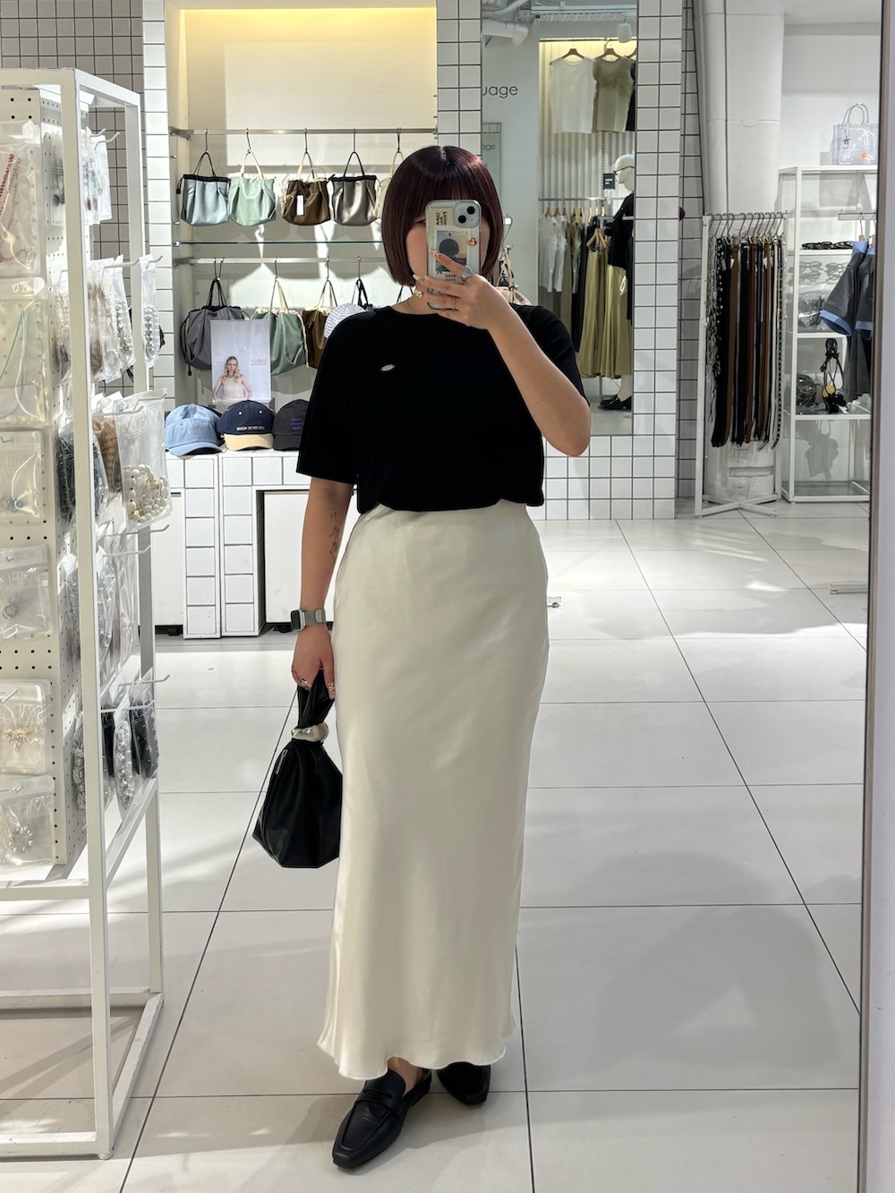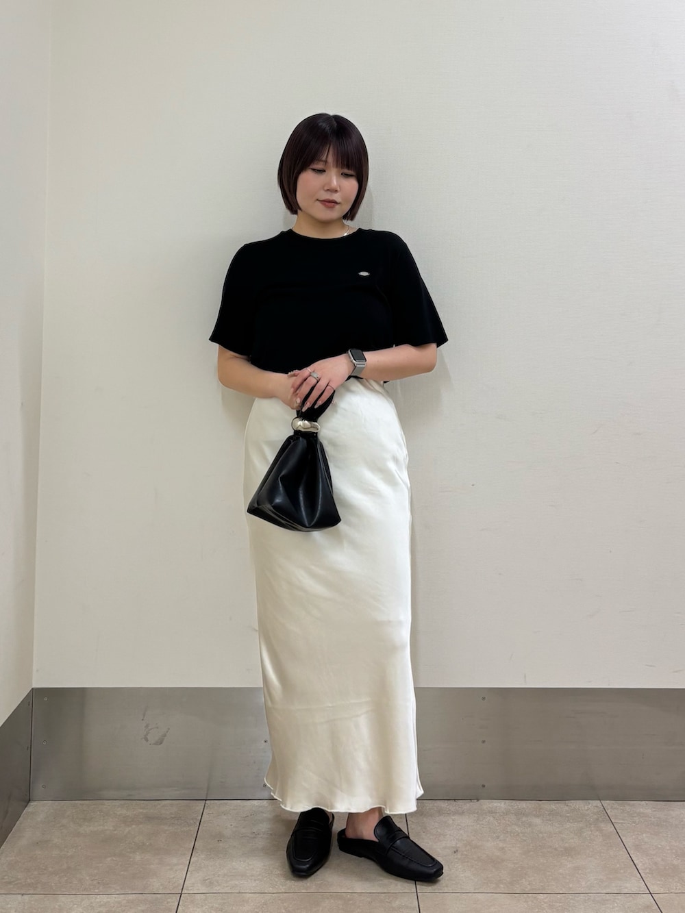 ・スカートが白で膨張色なので、他のアイテムは黒でまとめてなるべく着膨れしないように.ᐟ.ᐟ.ᐟ