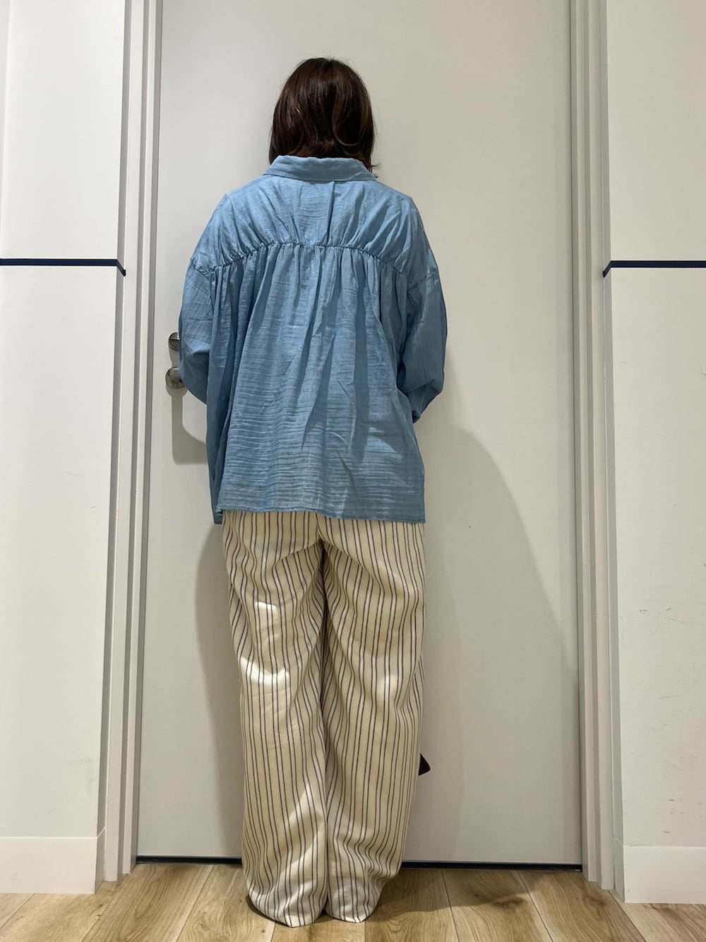 たっぷりと生地を使用したゆとりのあるシルエットと、ヨークに入ったシャーリングで後ろ姿にも洒落感をプラス。