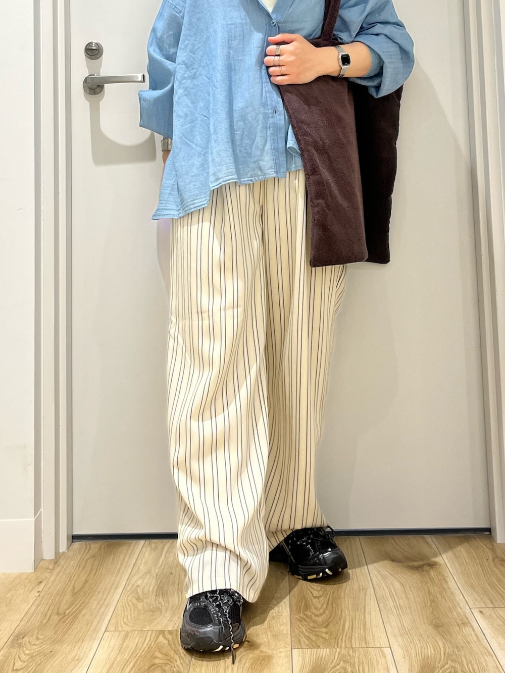 ランダムなストライプ柄が目を引くイージーパンツはデイリーコーデに取り入れやすいデザイン。