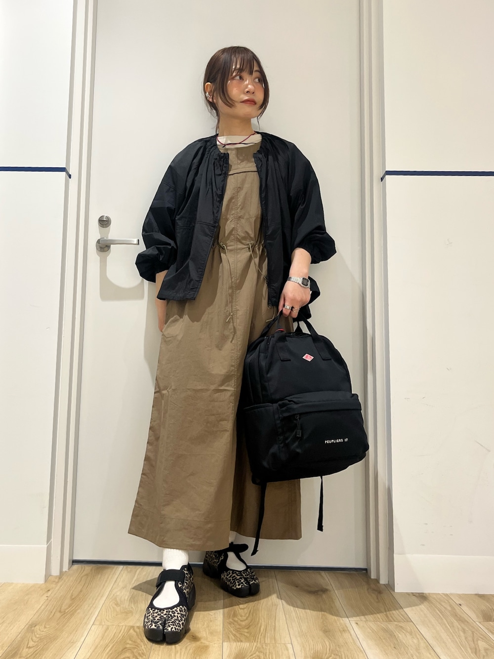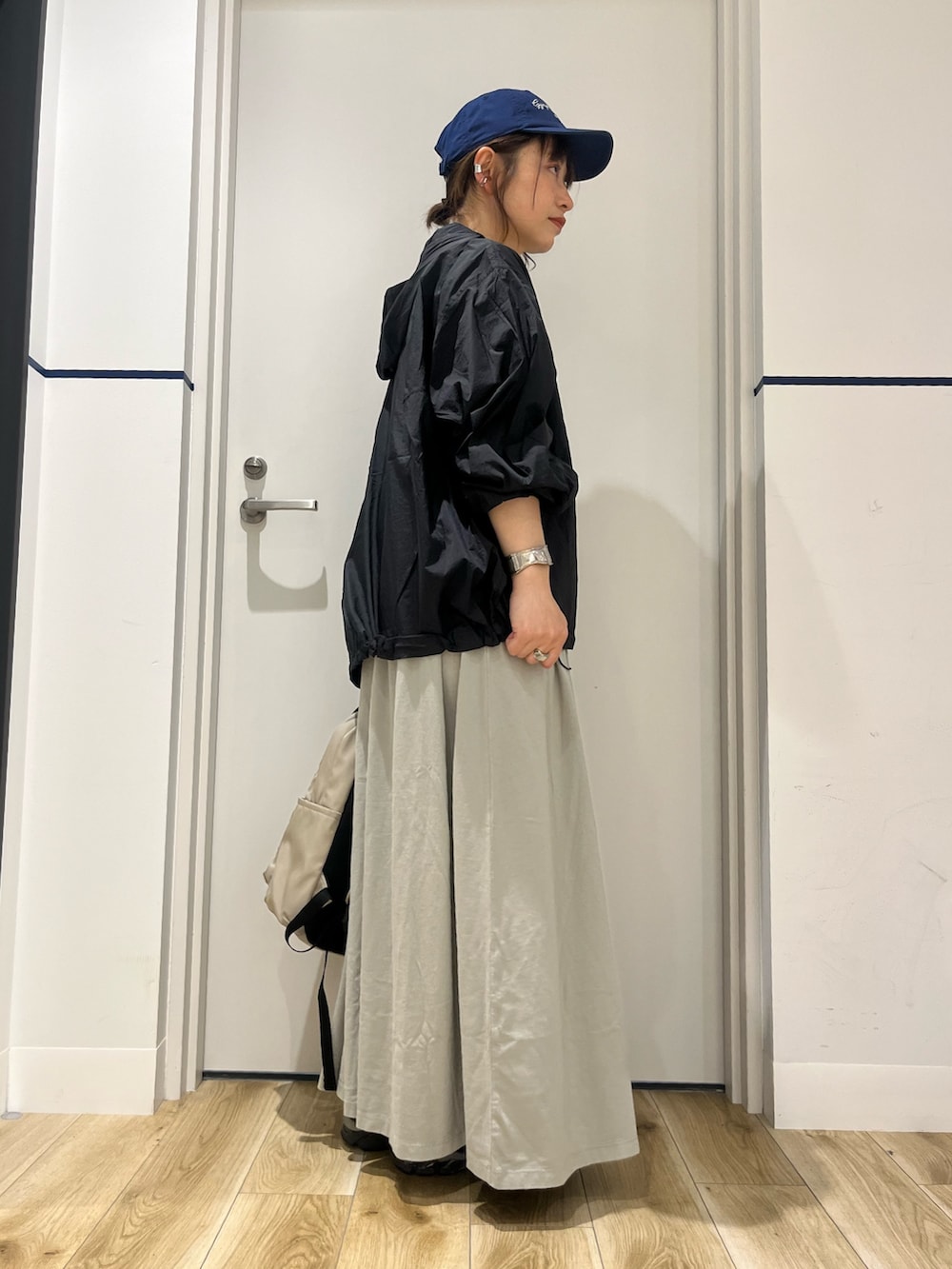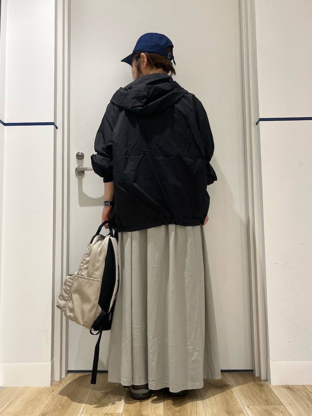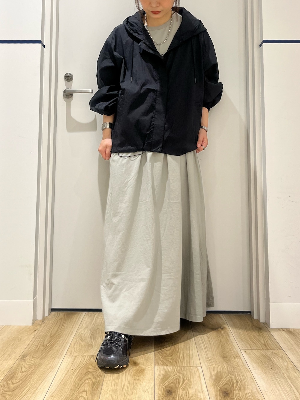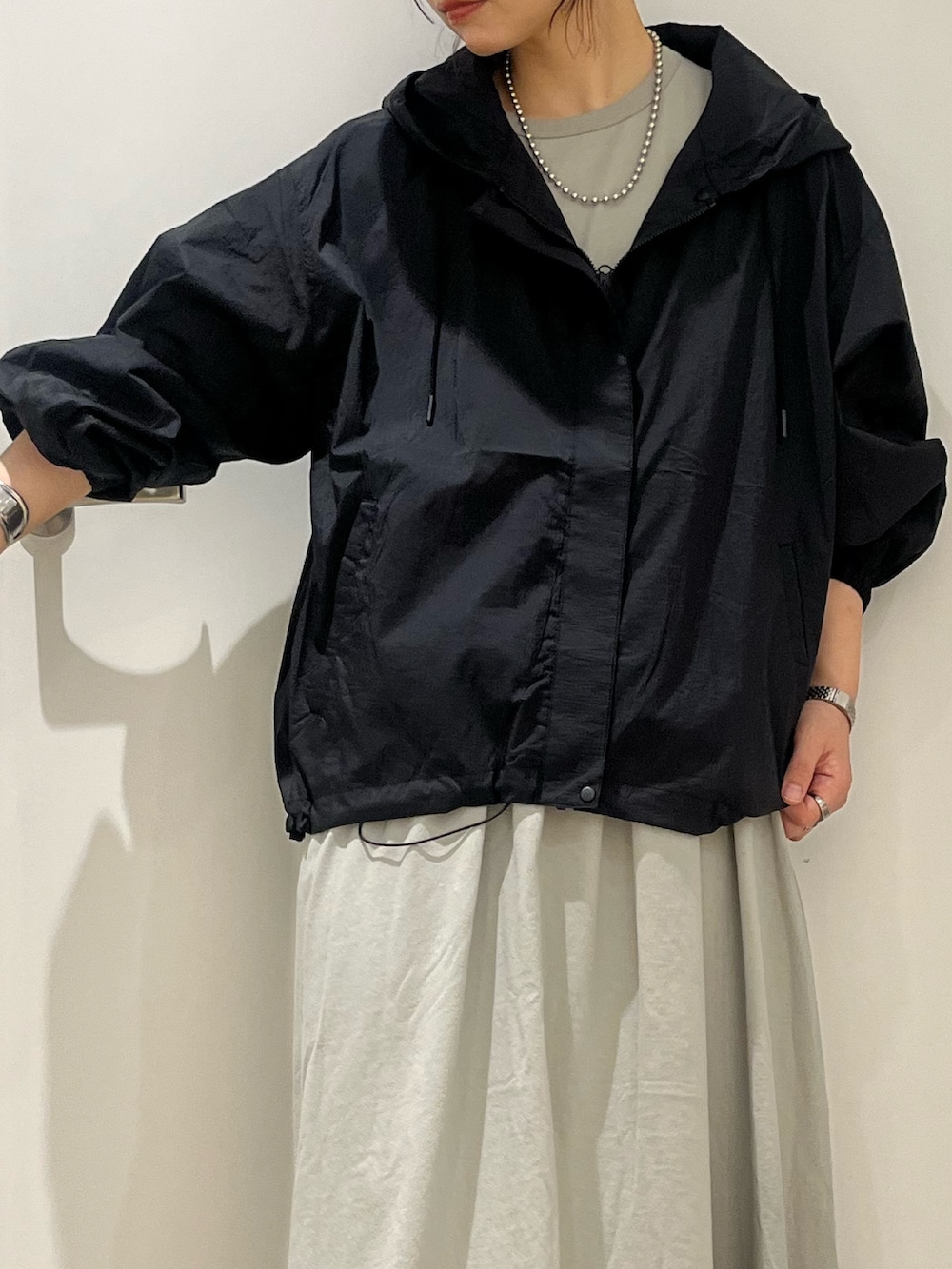 アウターは『UR TECH』ポケッタブル撥水フレアパーカー。