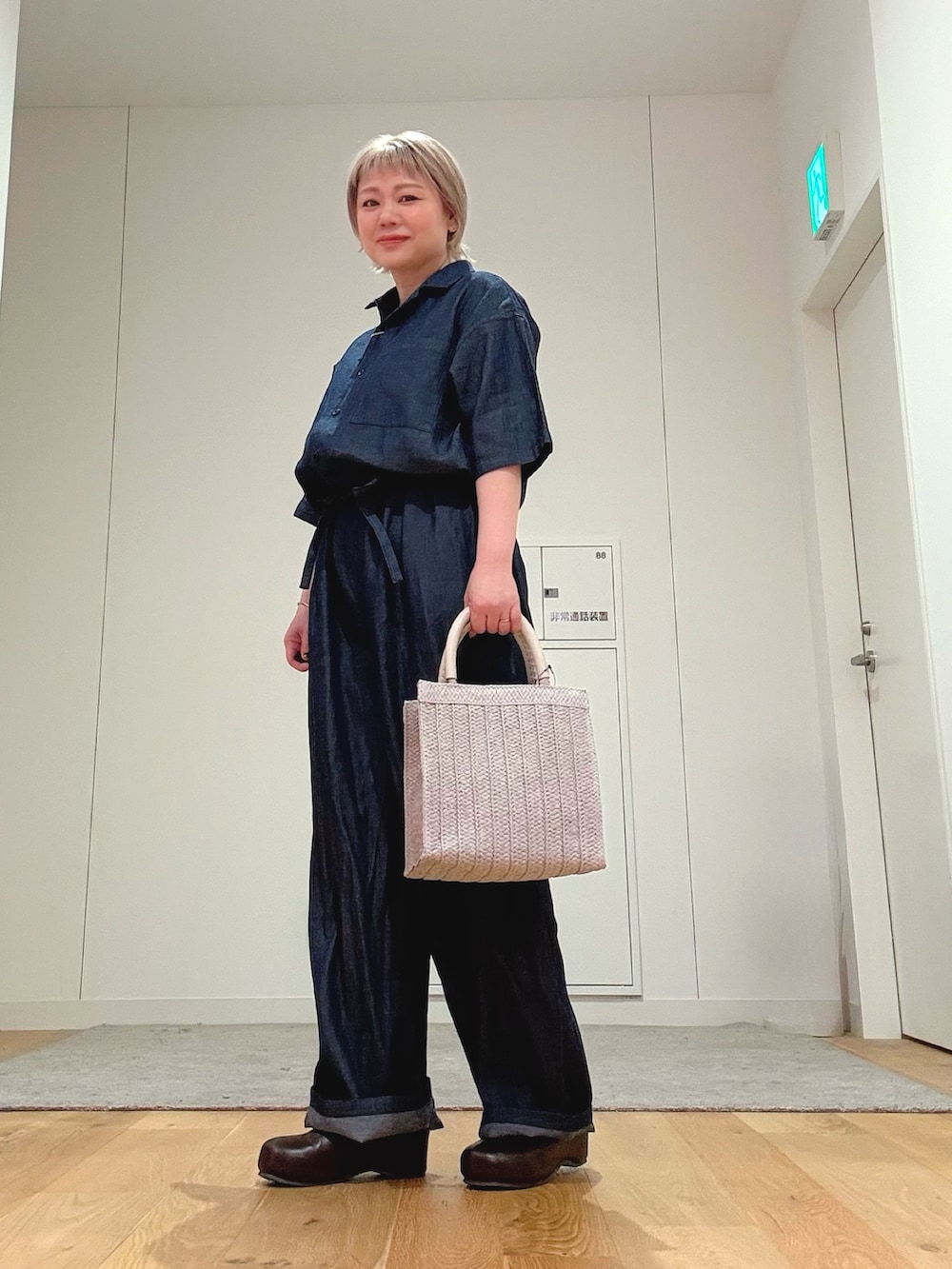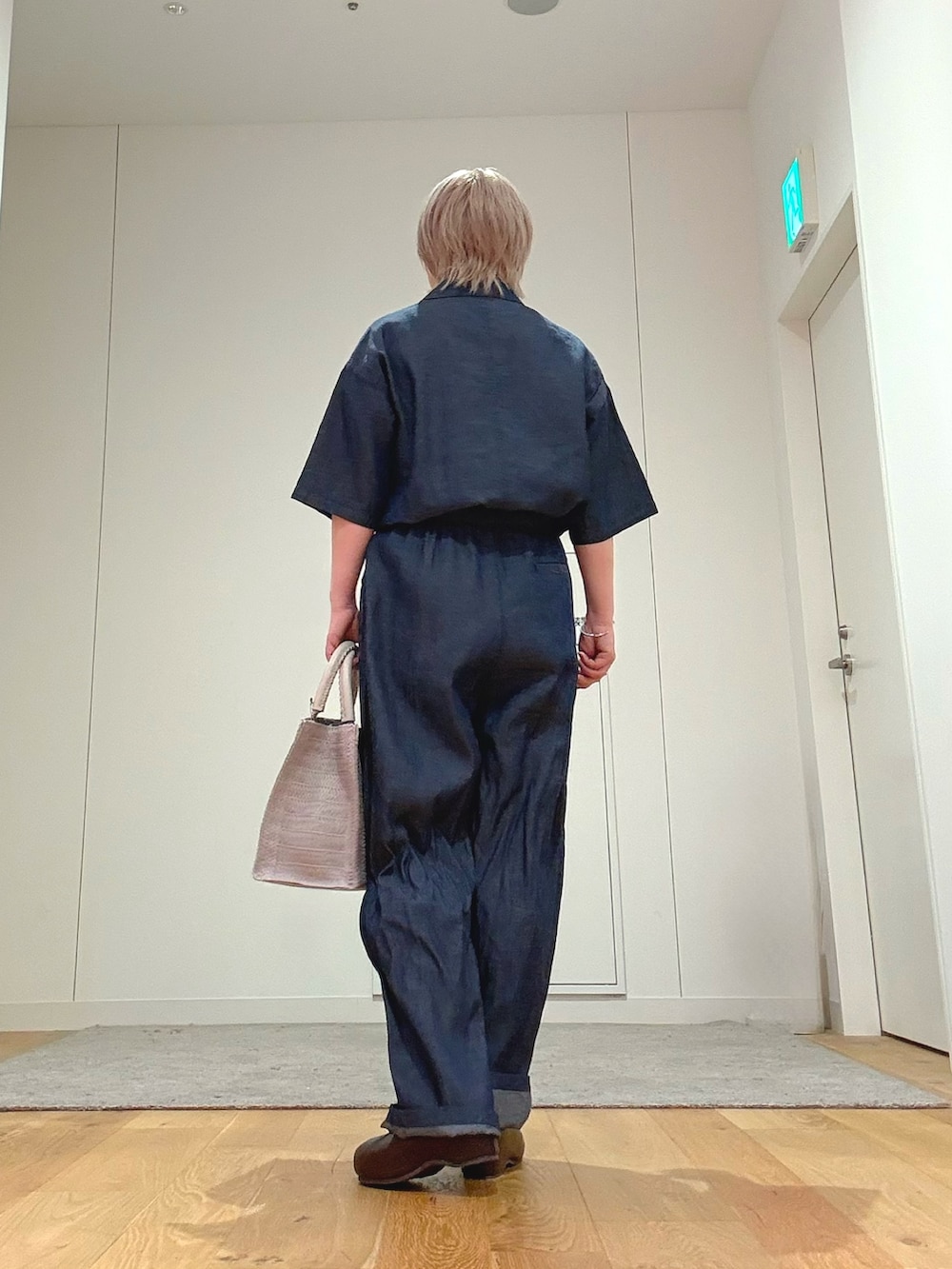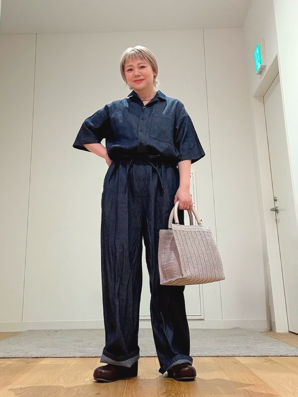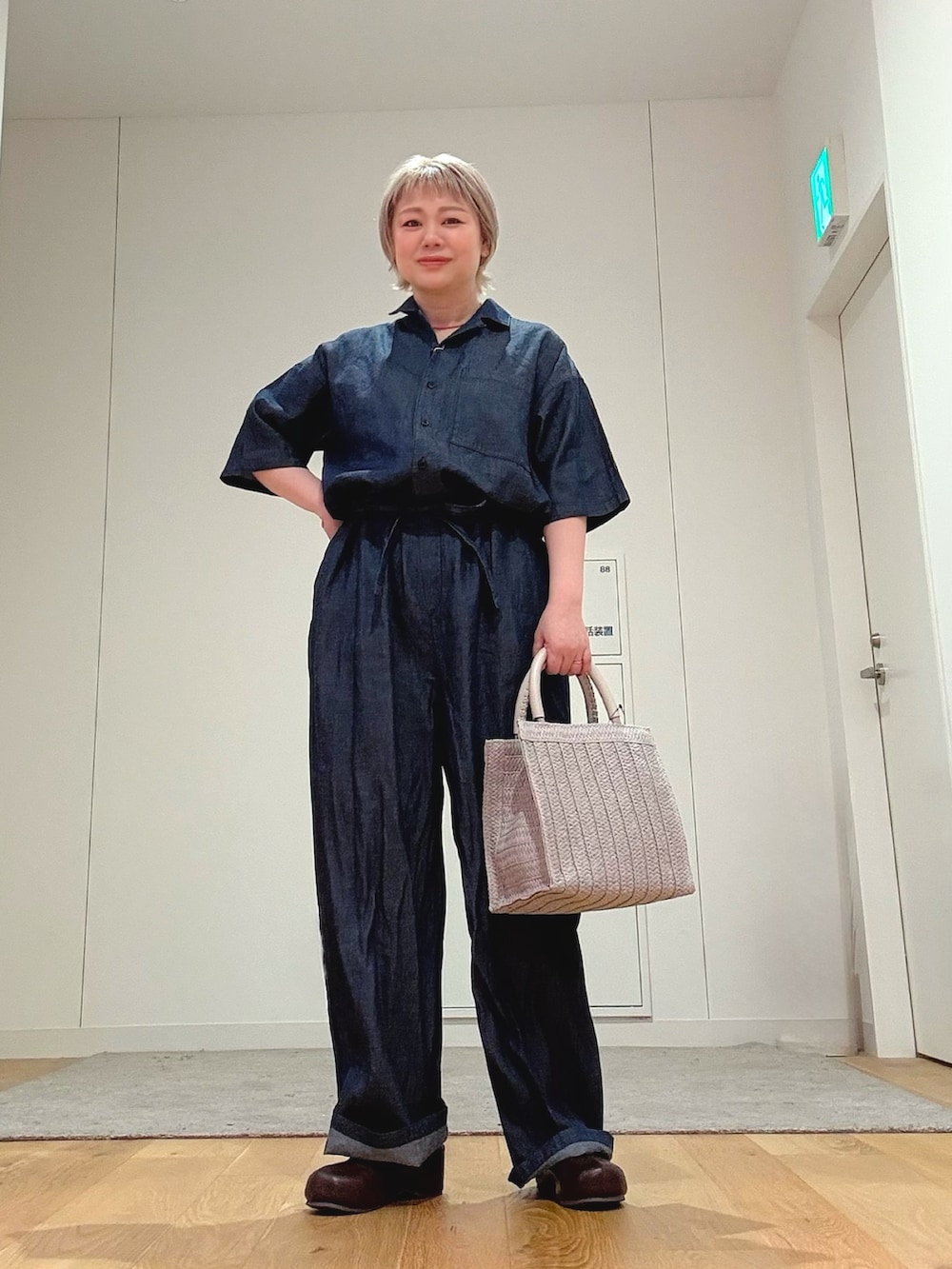 今回は柔らかいカラーのバッグを合わせて、抜け感のある大人カジュアルに仕上げました。