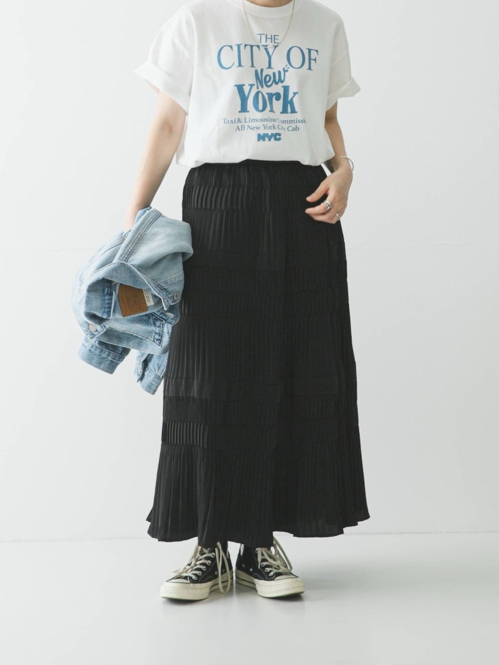 また、Tシャツなどシンプルになりがちなこれからの季節に、プリーツティアードデザインが良く映えます。