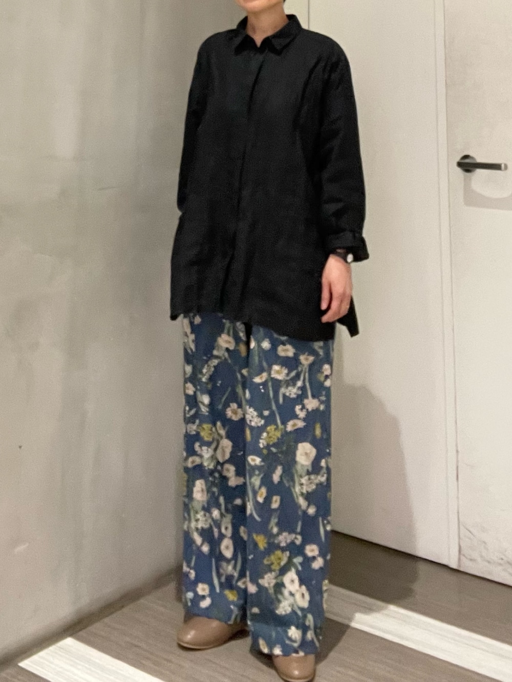 絵画のようなやわらかな柄が目を引く、コットンリネンプリントイージーパンツ。