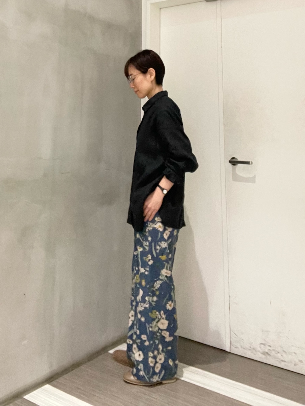 黒のリネンシャツを合わせ、すっきりと引き締めた印象に。