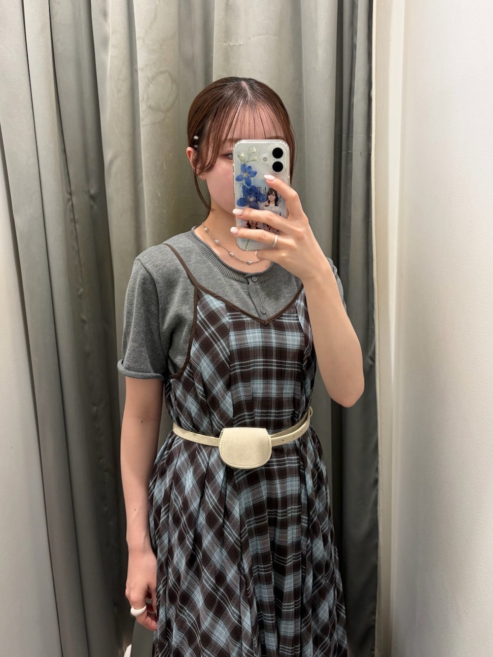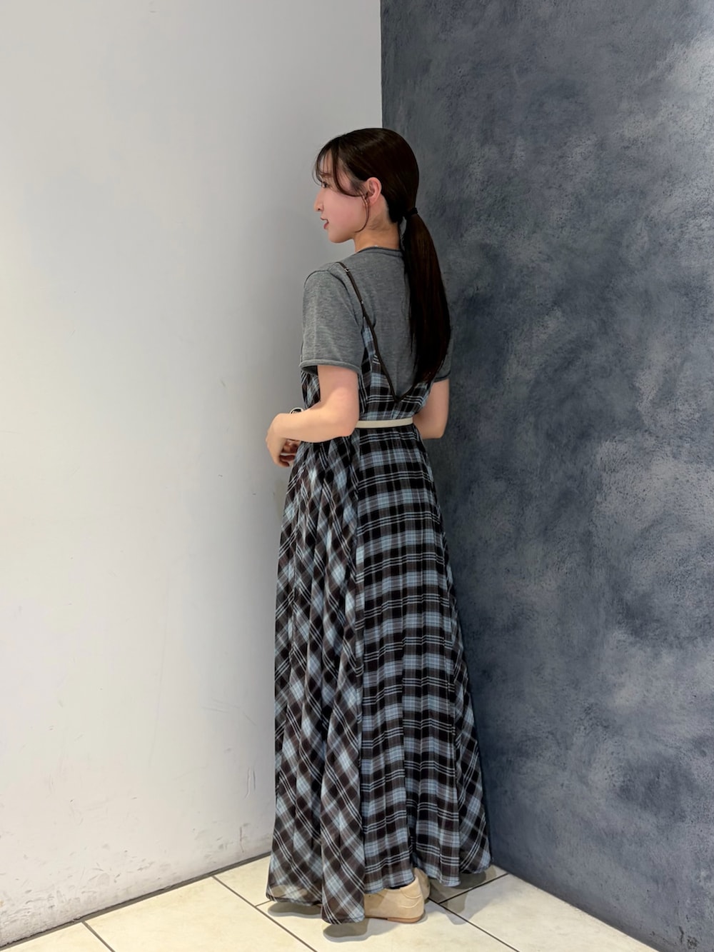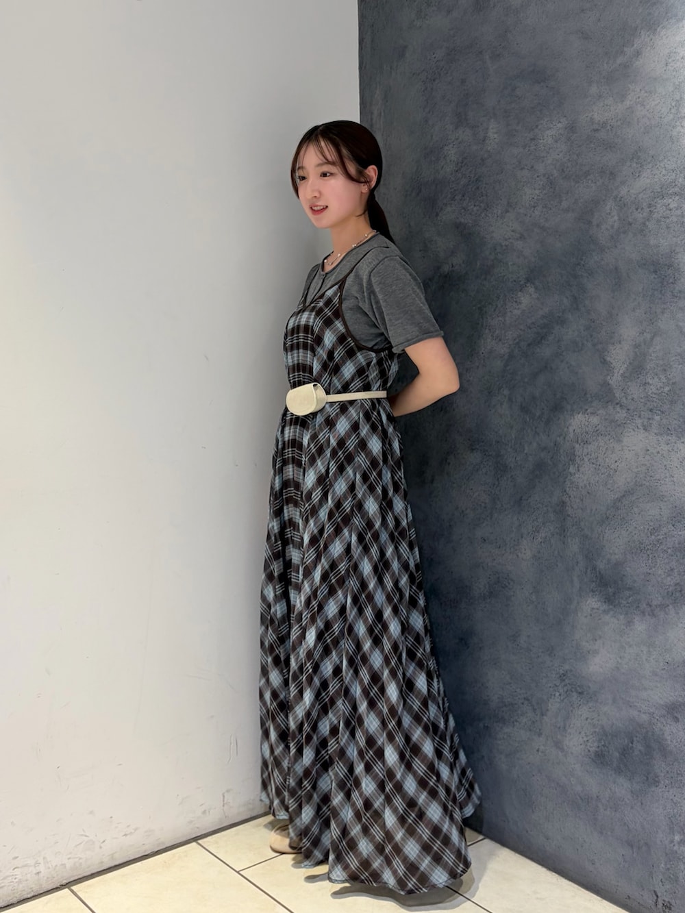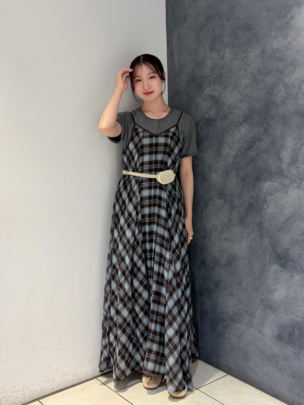 チェック柄ワンピースにグレーのトップスをレイヤードした、ナチュラルで落ち着いた印象のスタイリング🩶