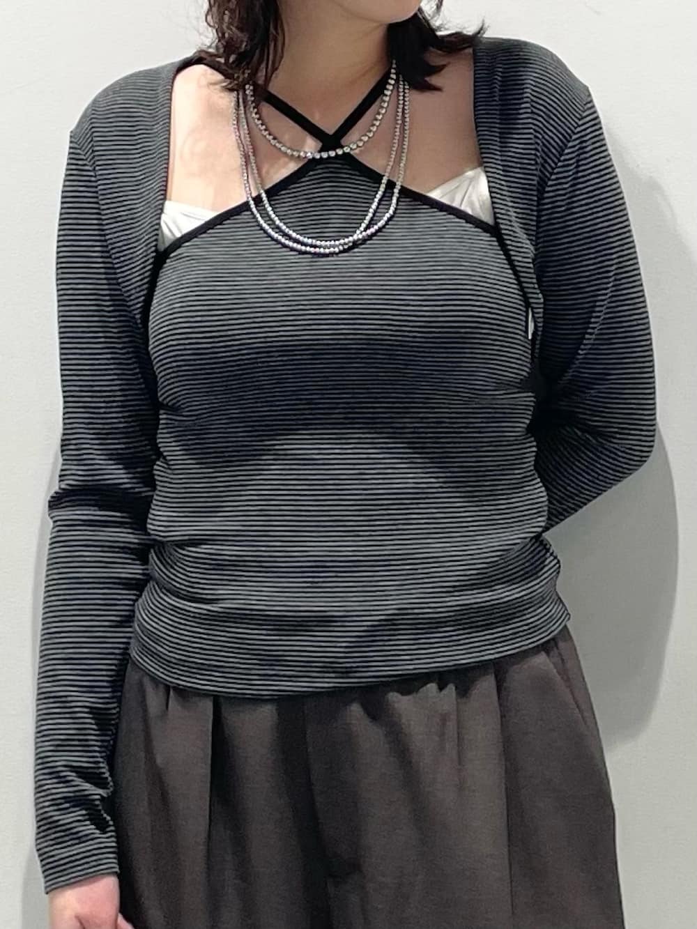 クロスしたようなキャミストラップで、アクセサリーをつけなくても、おしゃれに見えます!もちろんつけてもより華やかです!