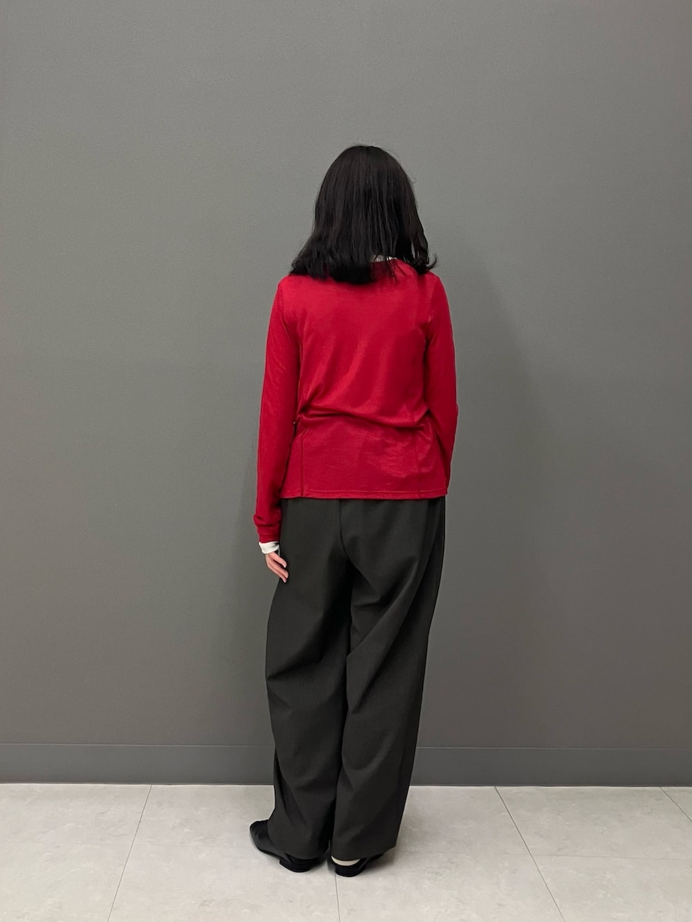 目を惹く赤のトップスも形選びや、綺麗め素材のボトムスと合わせることでスッキリと着こなすことが出来ます!