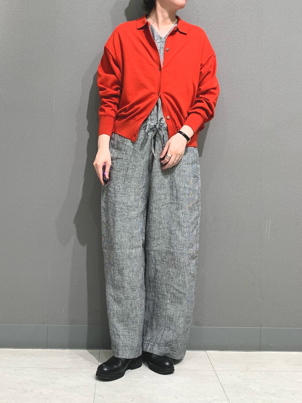千鳥格子柄のリネン素材が奥行きと品のある雰囲気があります。サラッとした着心地で春夏に涼しくお召しいただけます。サイズが3サイズ展開のためお好みの着方でお選びください。