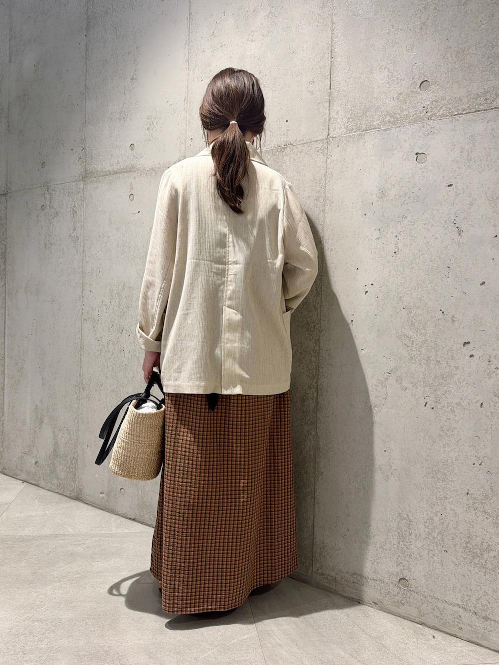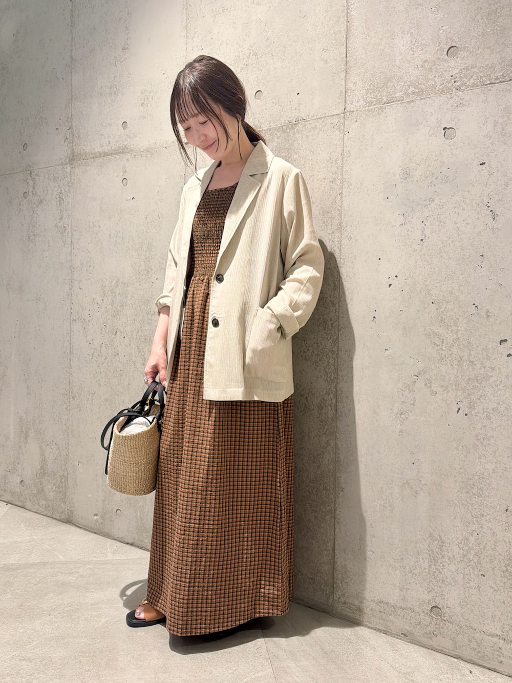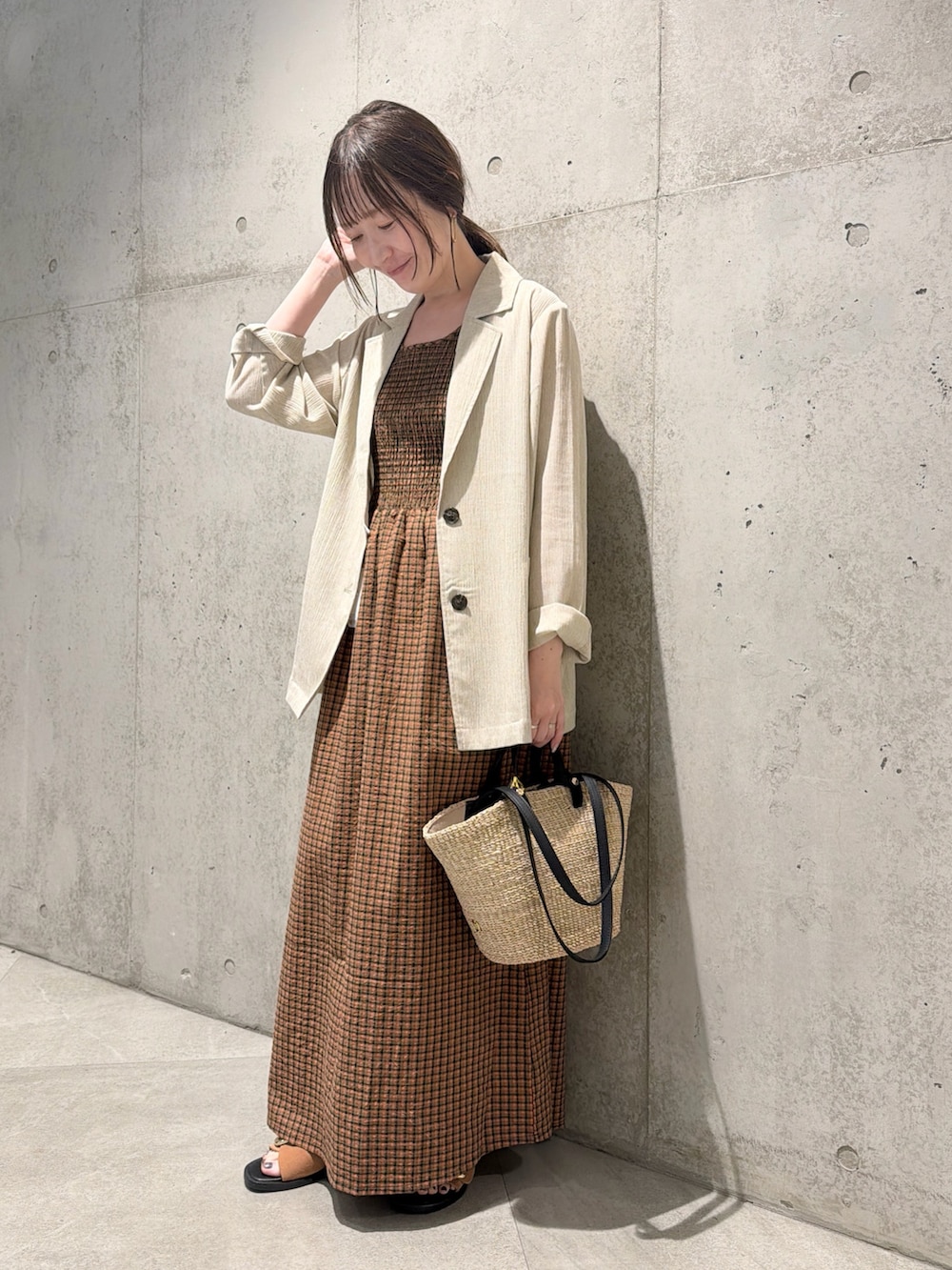 今回は、チェック柄のワンピースを合わせた、大人カジュアルコーディネートです。