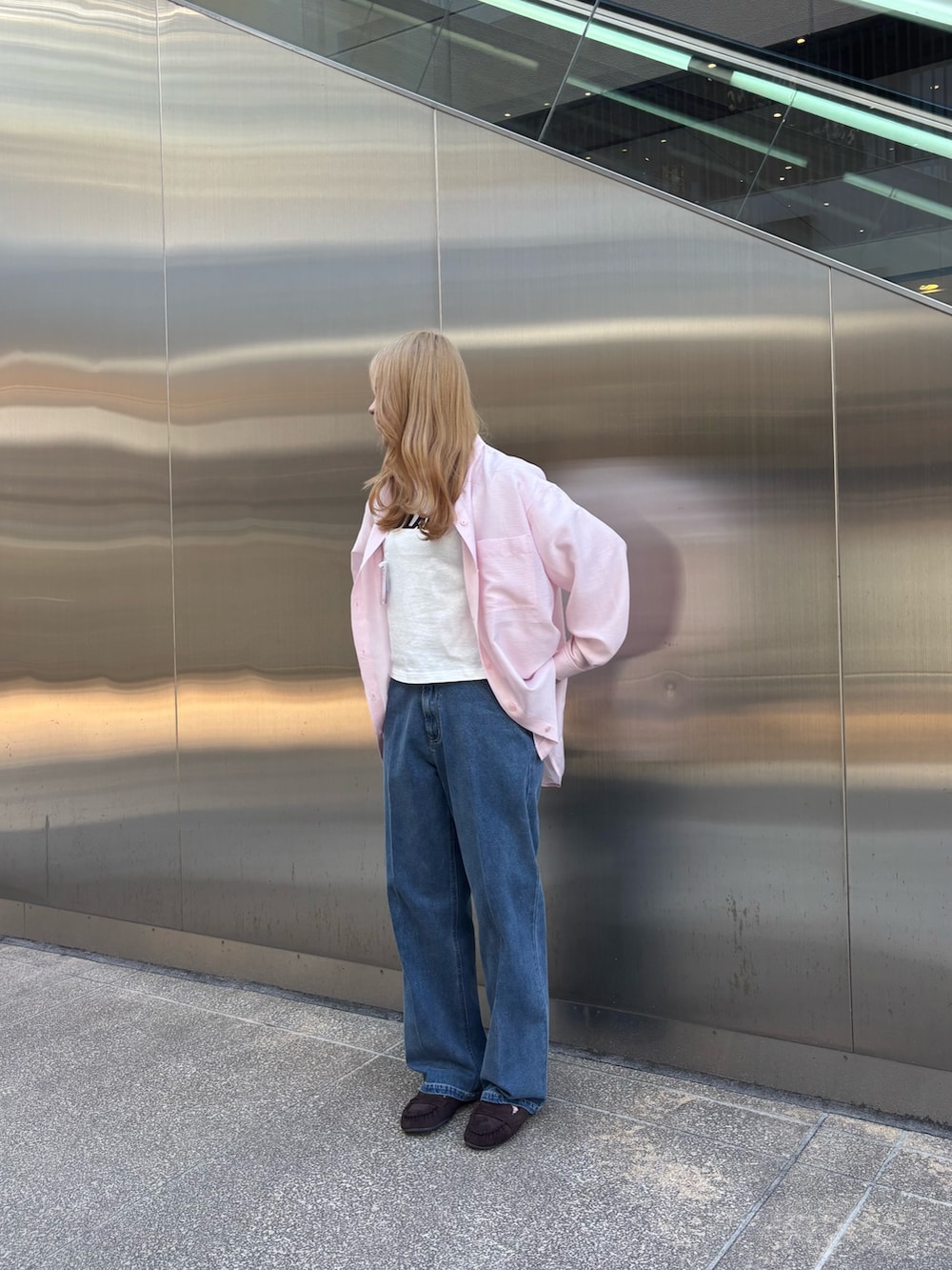 春らしくピンクのシャツを合わせて爽やかなコーディネートにしました