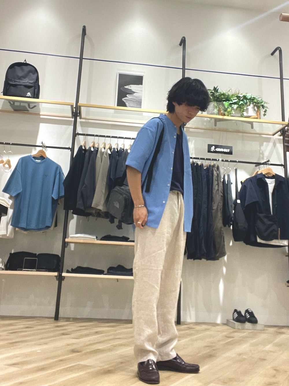夏らしさ満載のブルーシャツに白のリネンのパンツを合わせて清潔感あるコーデにしてみました!このシャツは吸水速乾、アンチピリング、防シワなど機能性盛りだくさんです!リネンも汗をかいてもすぐ乾いてくれるうえに、通気性もいいので夏にもってこいの素材となっております!ぜひ店頭でお試しください!