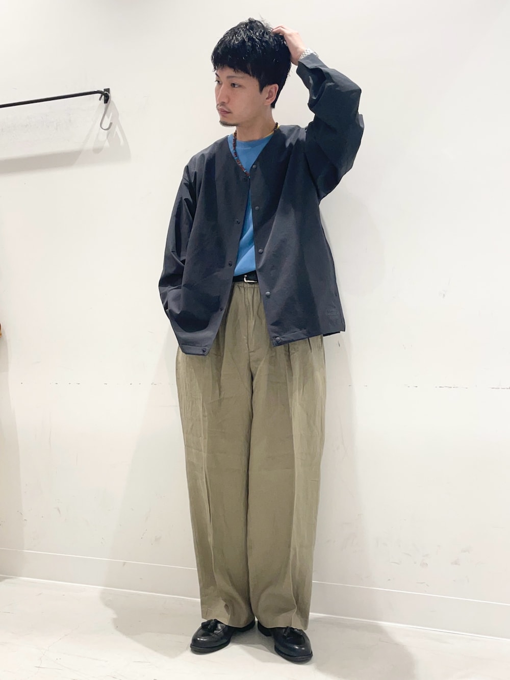 半袖Tシャツでも、襟付きシャツでも大丈夫です!それがノーカラーの良さ。
