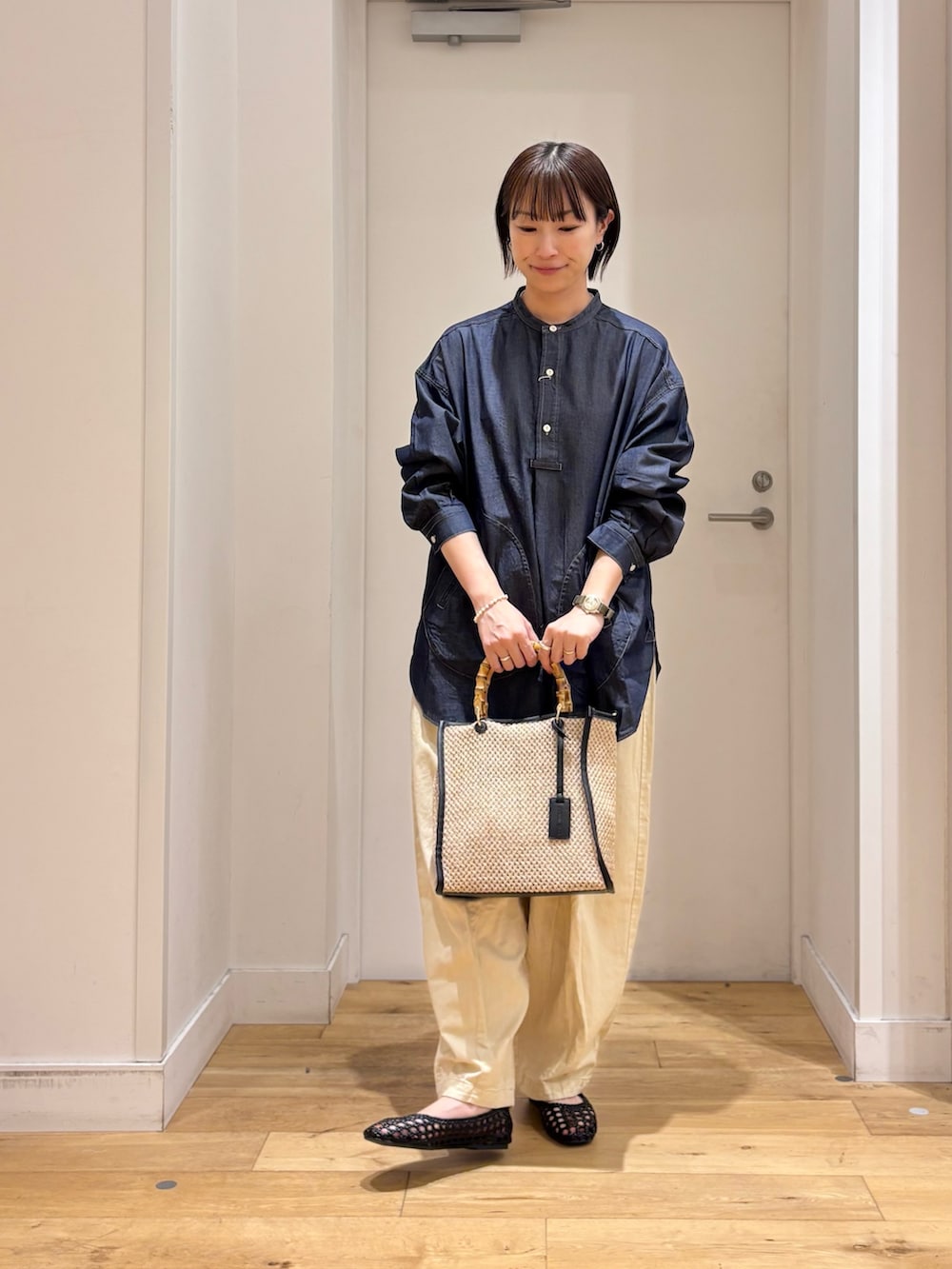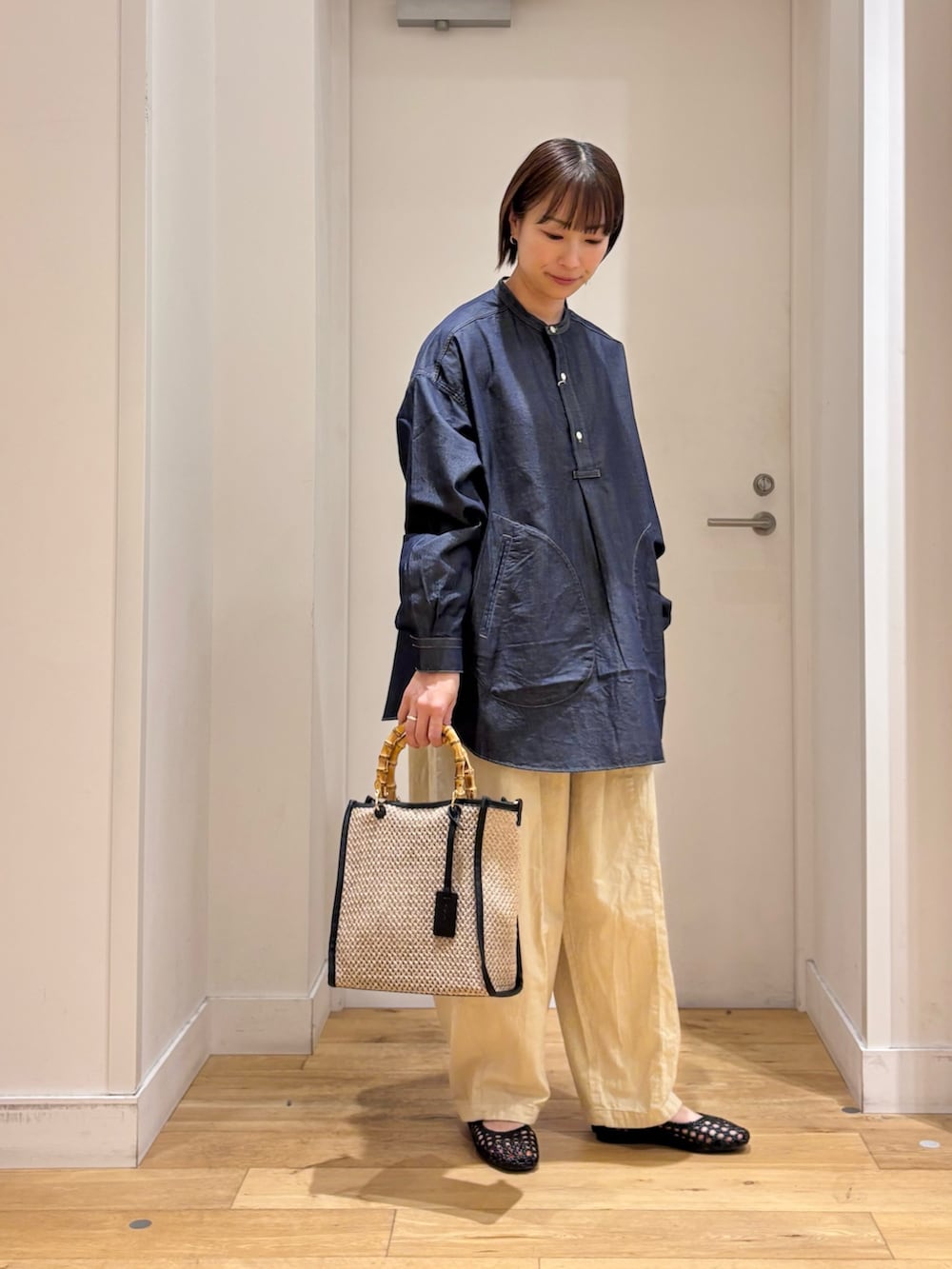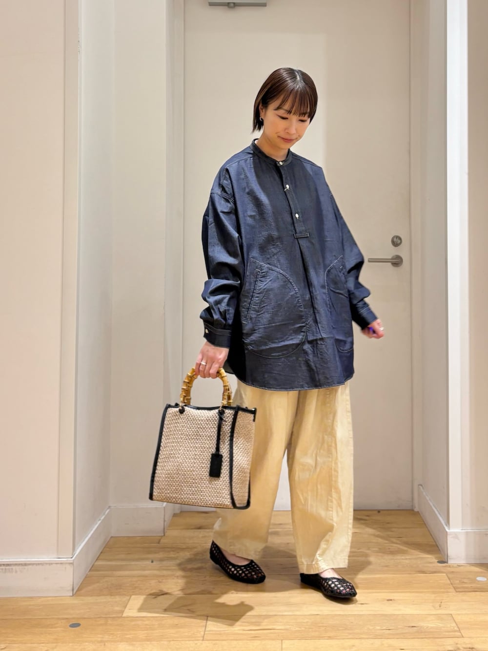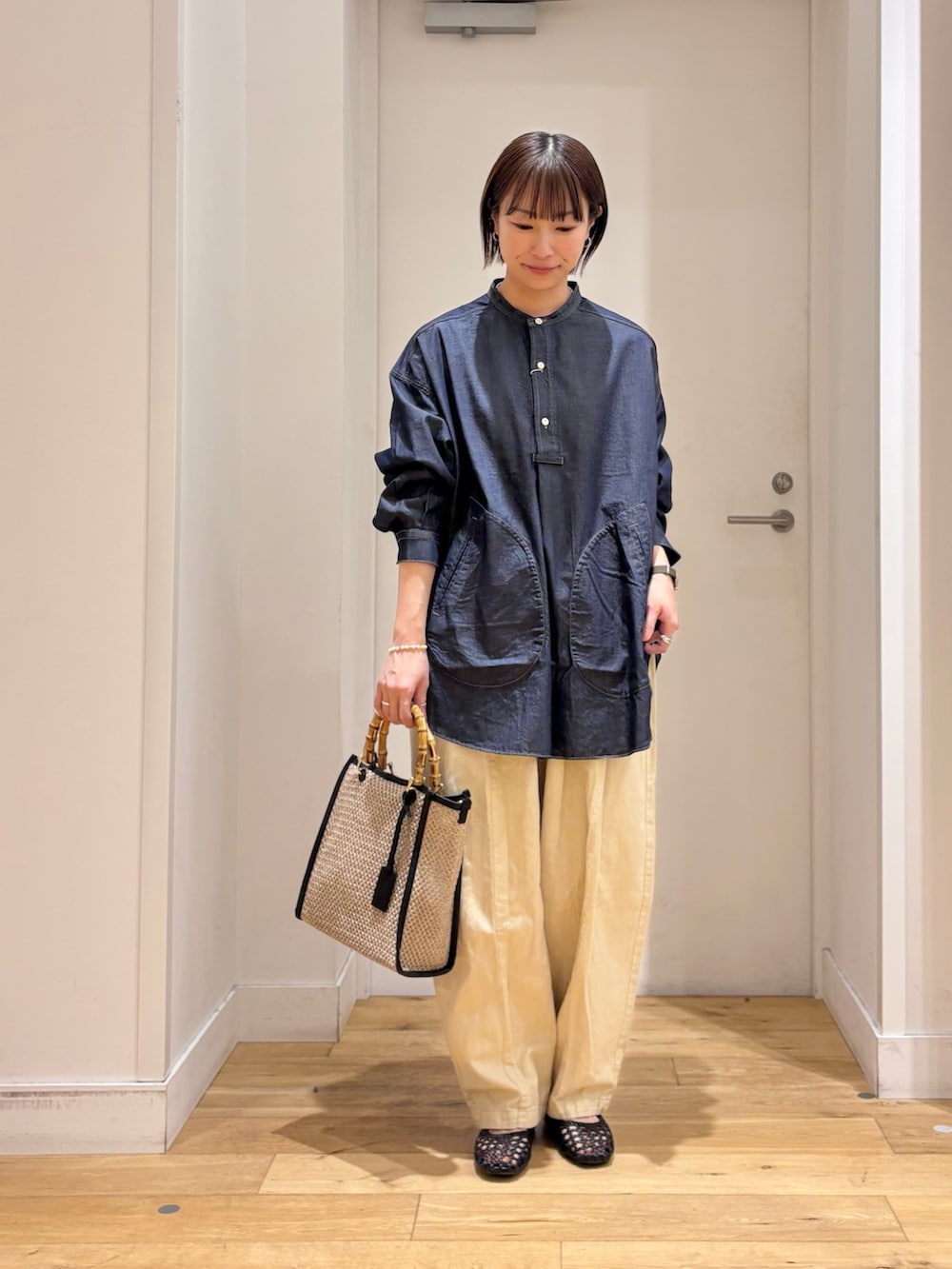 トップスはプルオーバーデザインのデニムシャツで、ボタンを開けてインナーを見せる着方も楽しめます♪