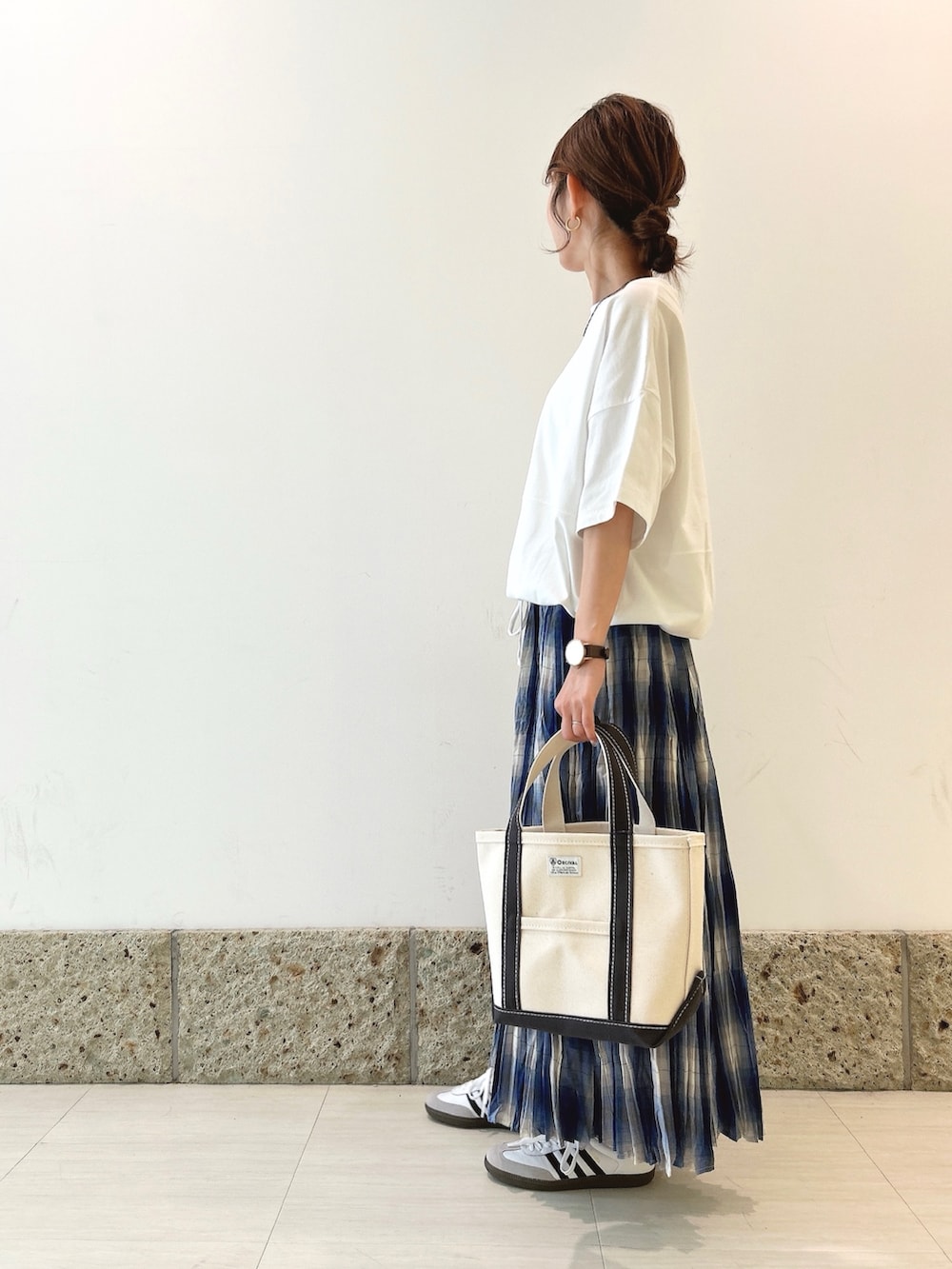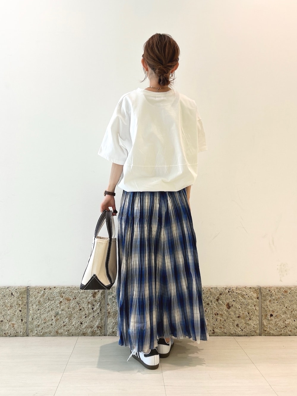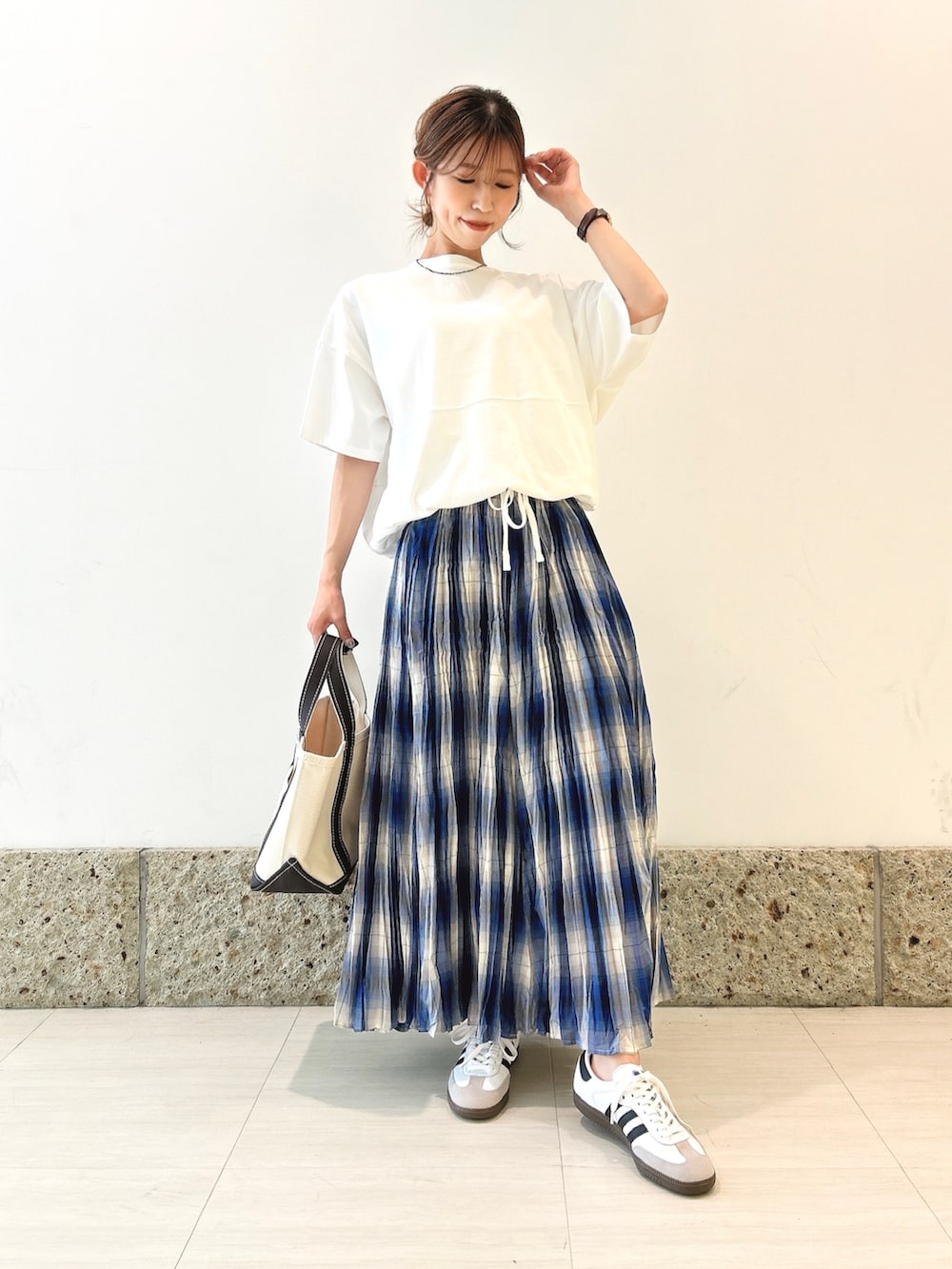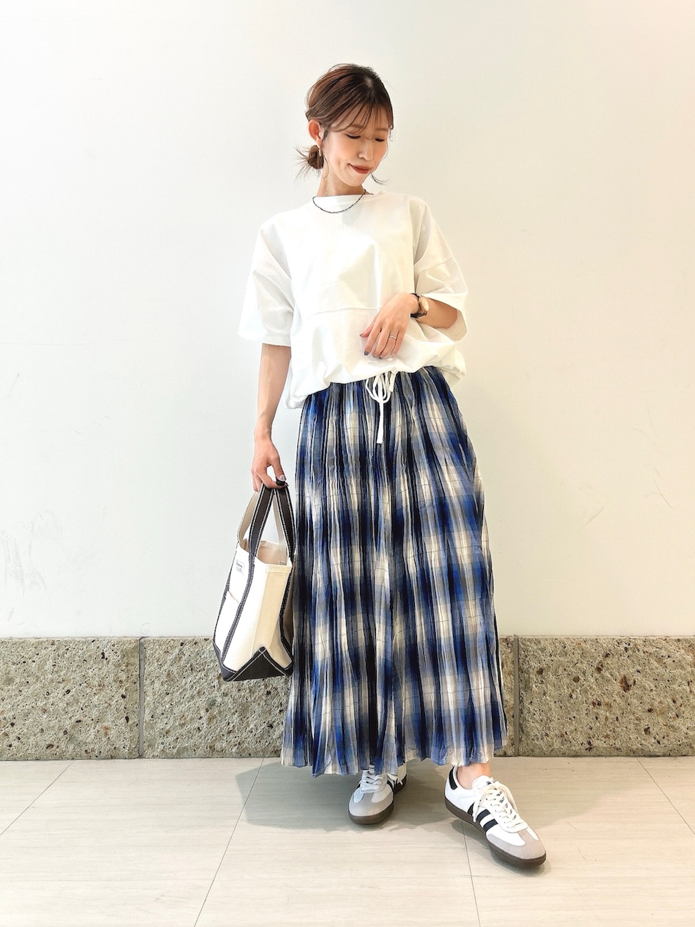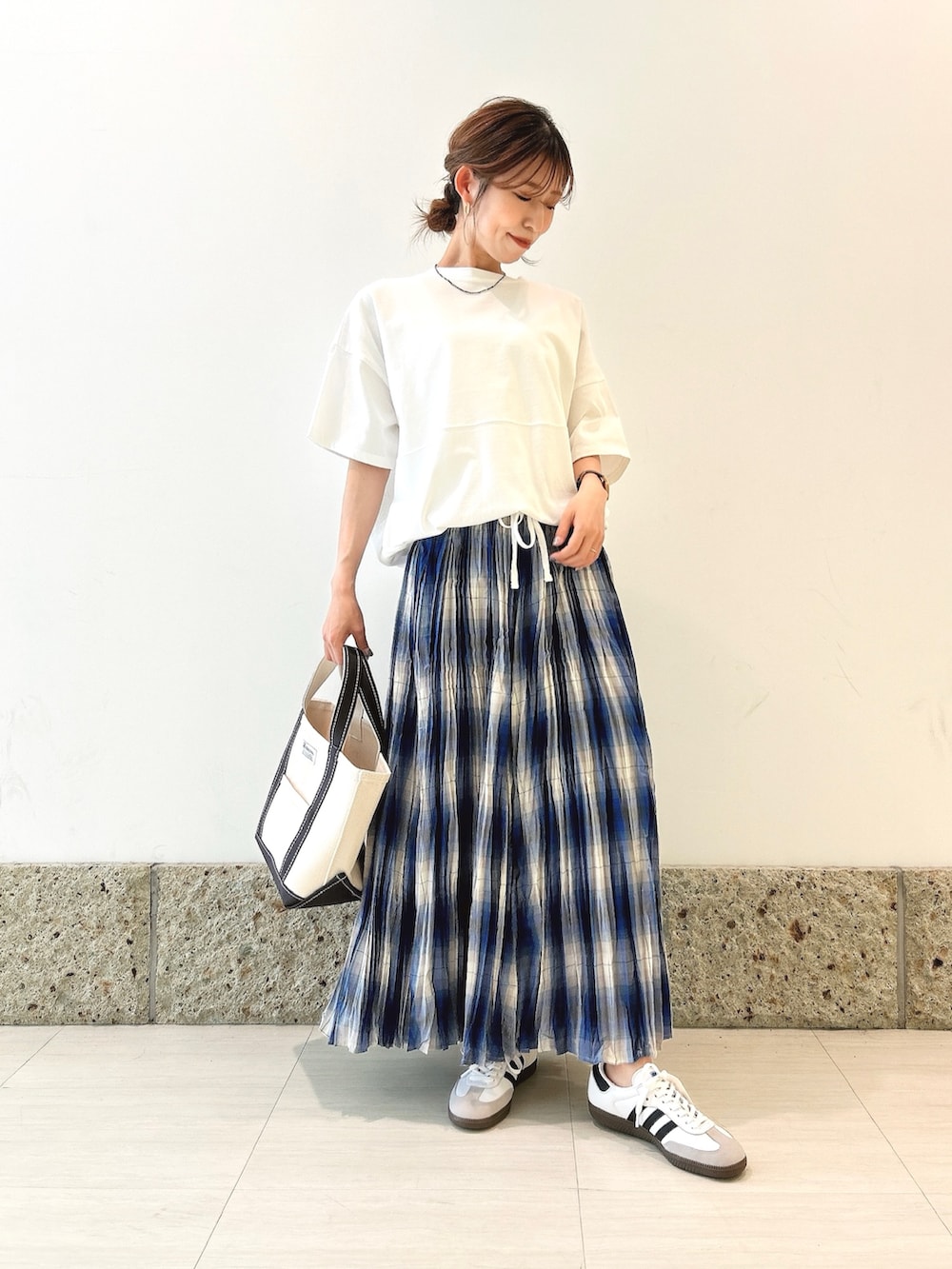 ボトムにはチェック柄のスカートを。