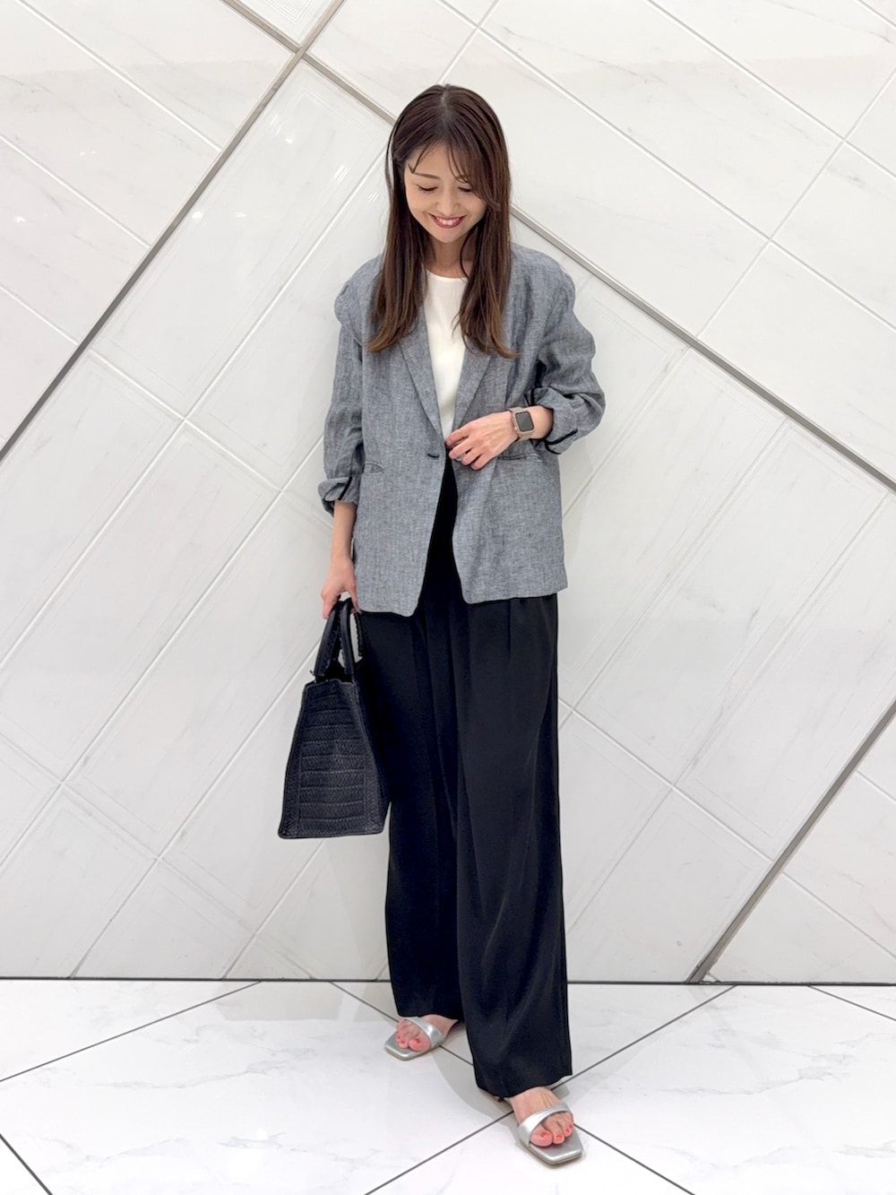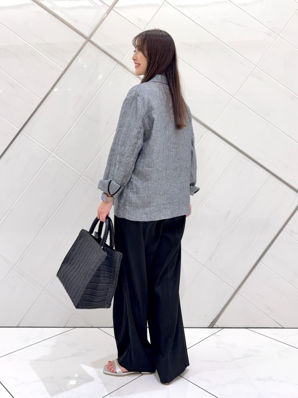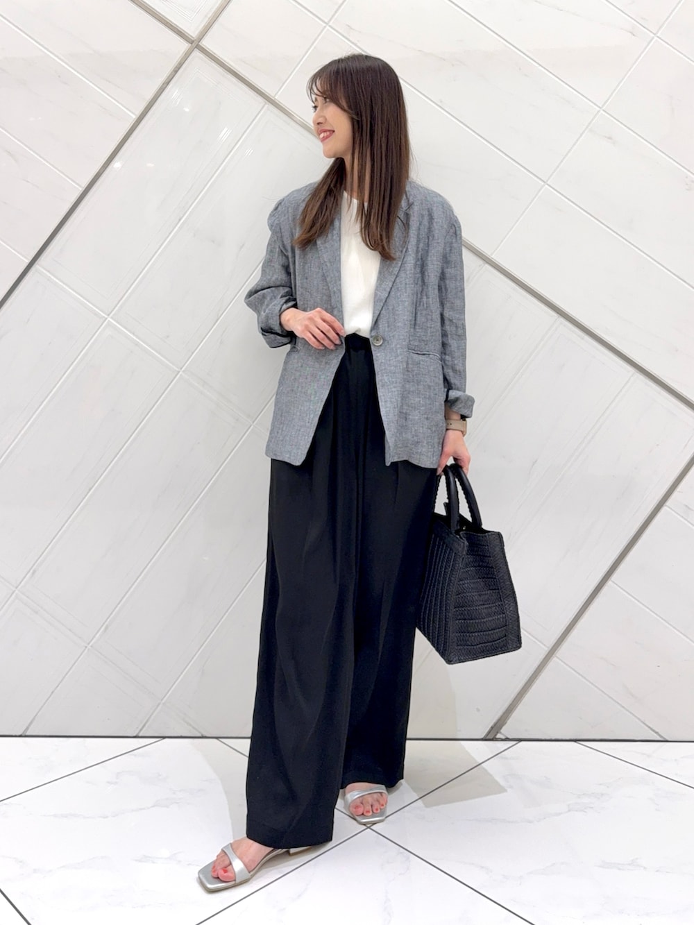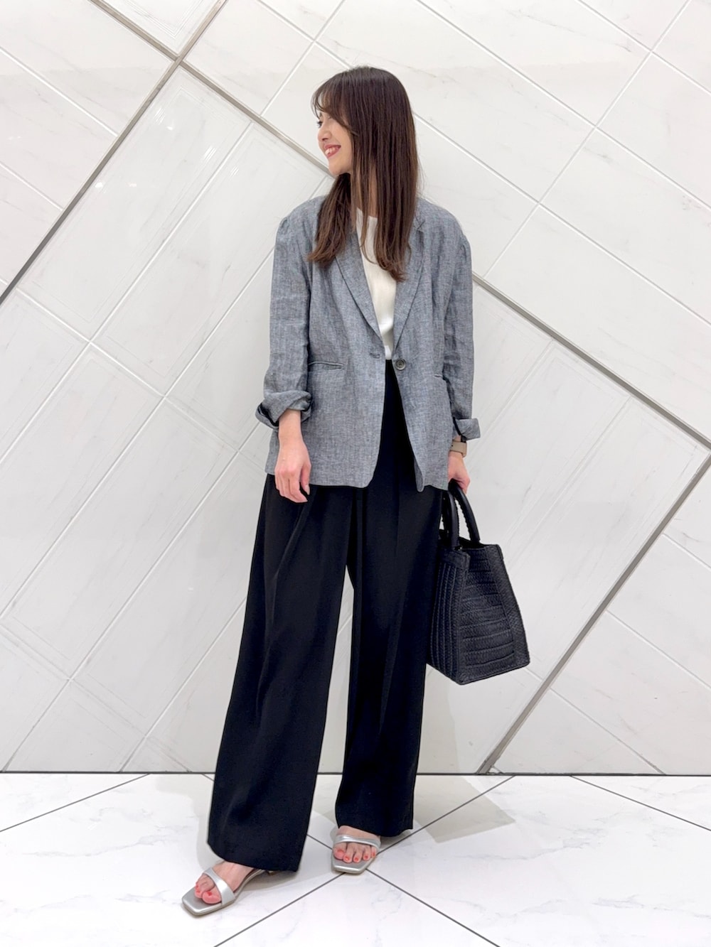 ジャケットの中に着ているトップスは楊柳生地でさらっとした軽い着心地でシアー感があり、涼しげな印象です。