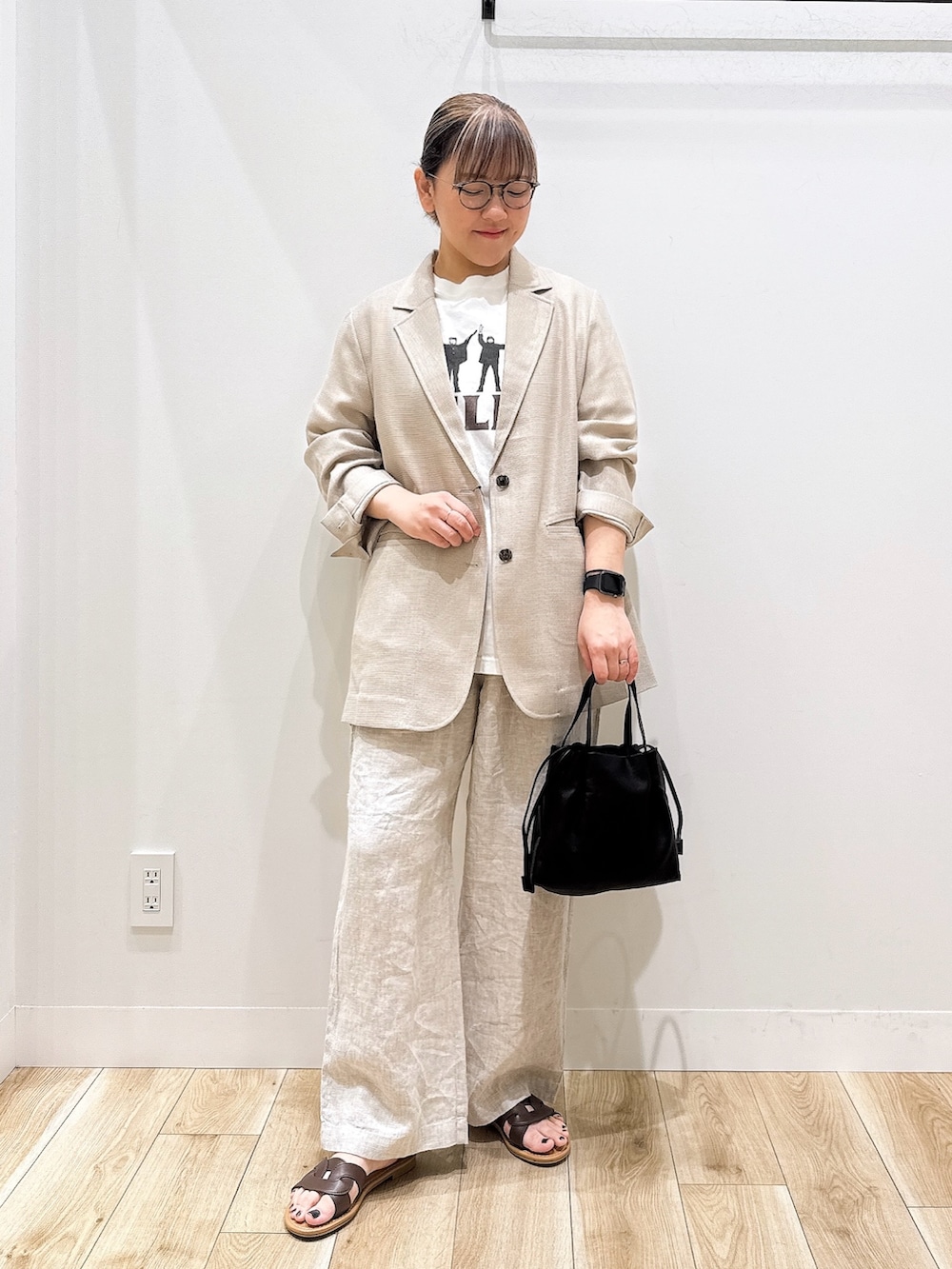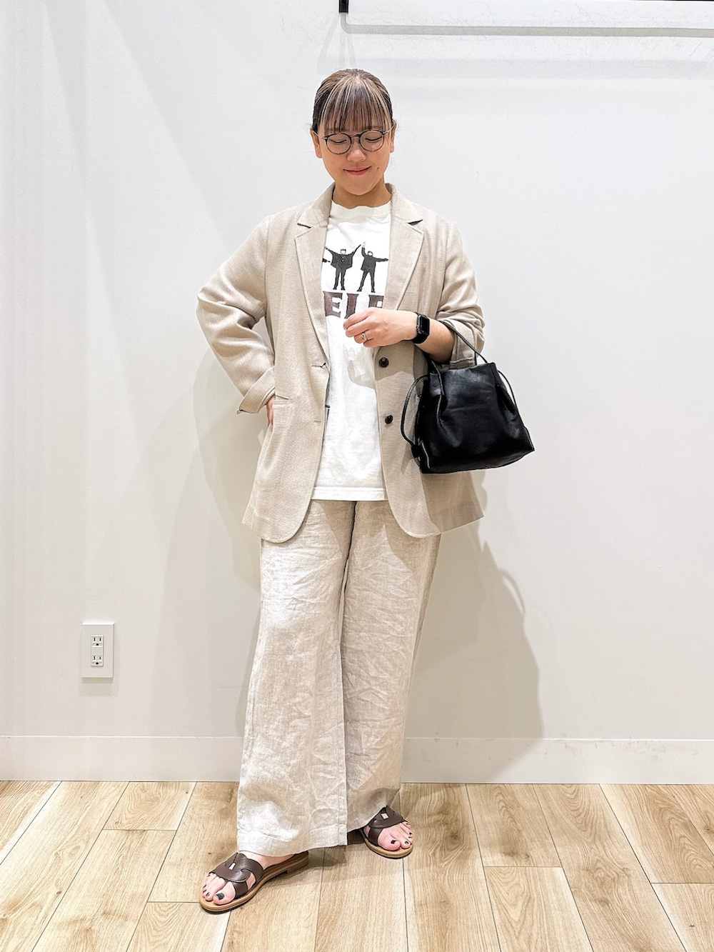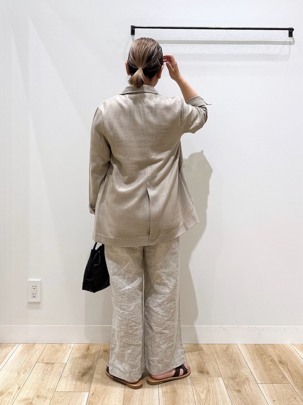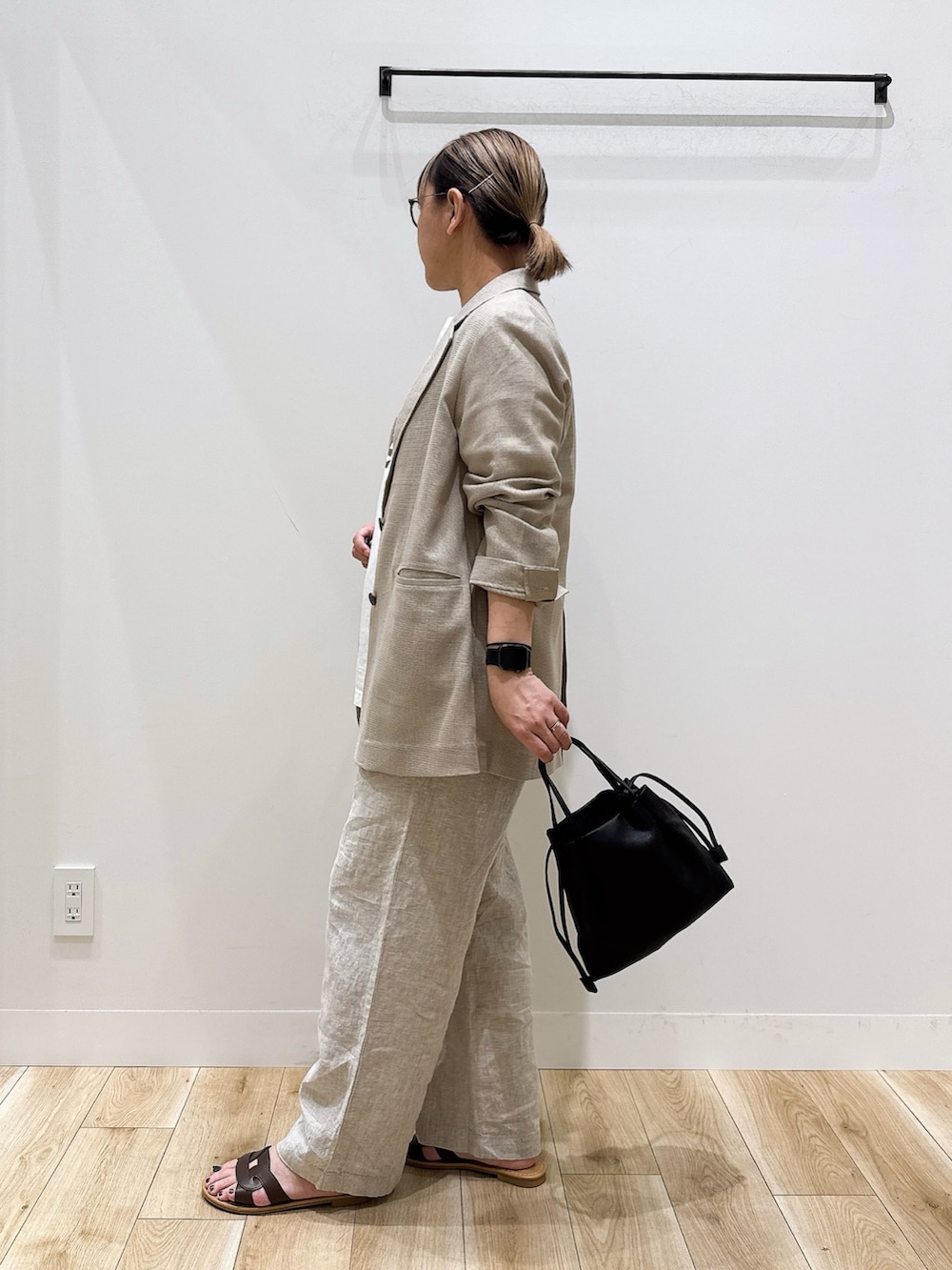 リネンのパンツはウエストオールゴムで