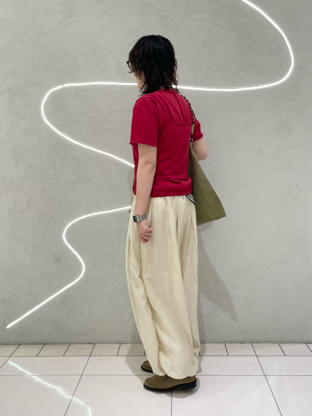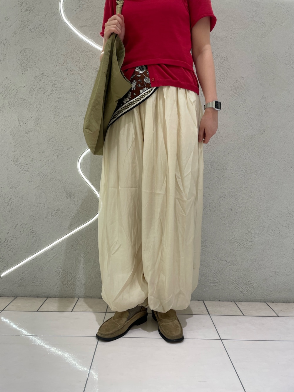 コンパクトなサイジングなのでボリューム感が可愛いシアーバルーンパンツと合わせてみました。ポイントに柄のあるスカーフを巻いてこなれ感をプラスすると◎