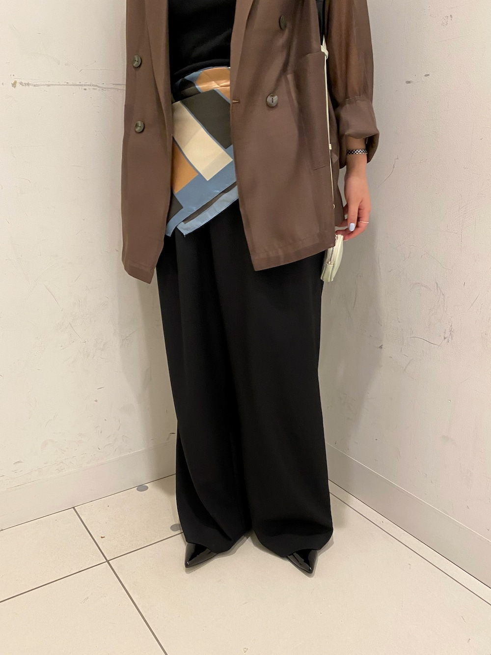 鮮やかな総柄デザインの大判スカーフは、スタイリングに華やかさをプラスしてくれます✨️