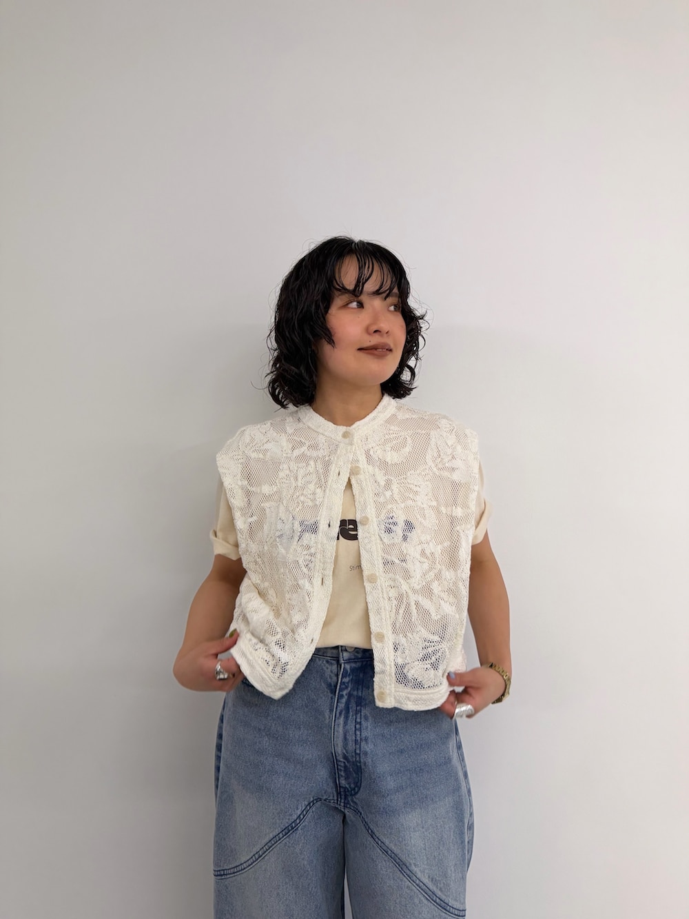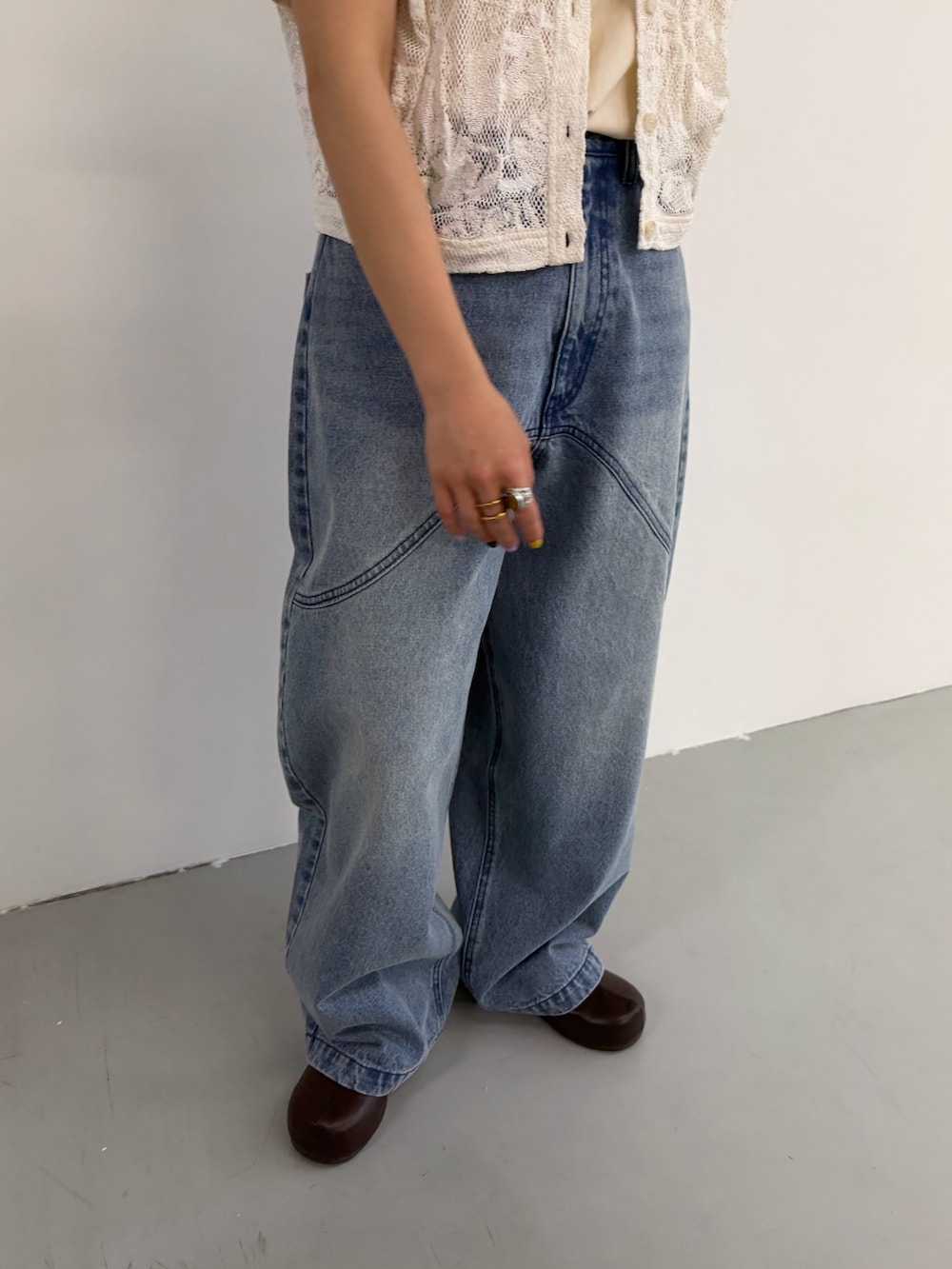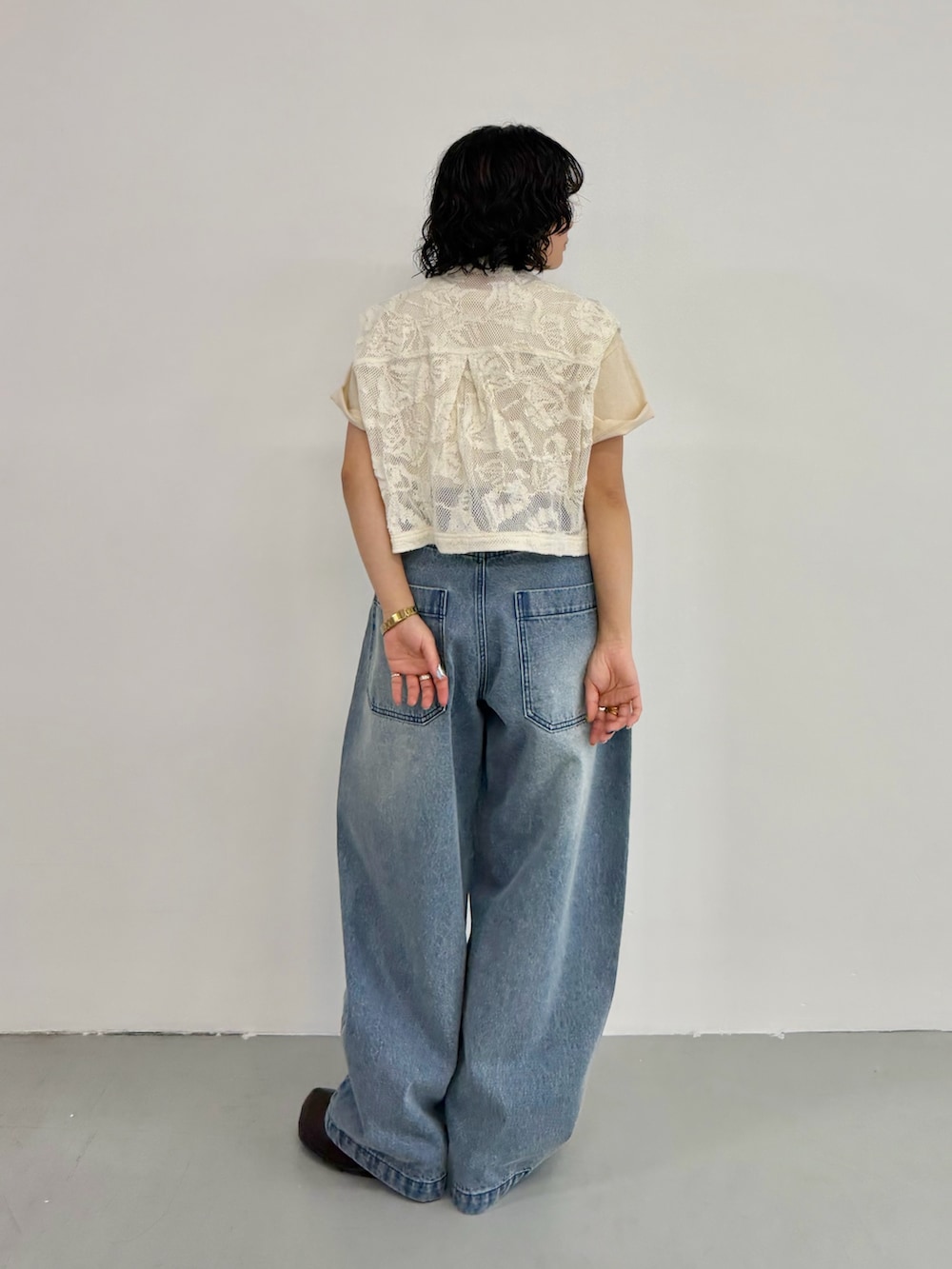 カーブデニムはコンパクトなトップスと合わせると、小柄な方もバランスを取っていただきやすくおすすめです〜