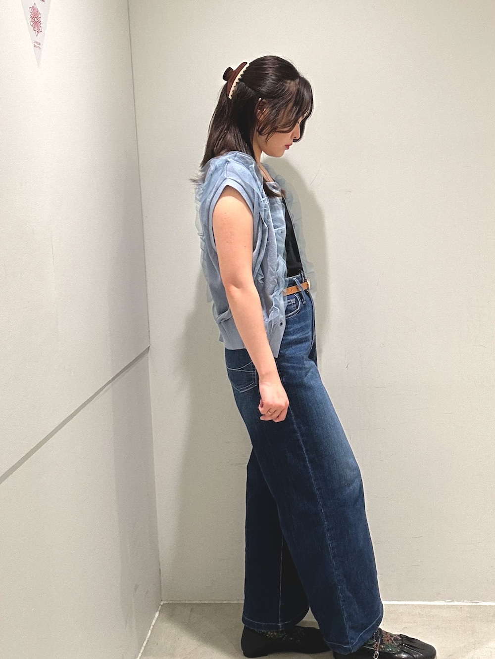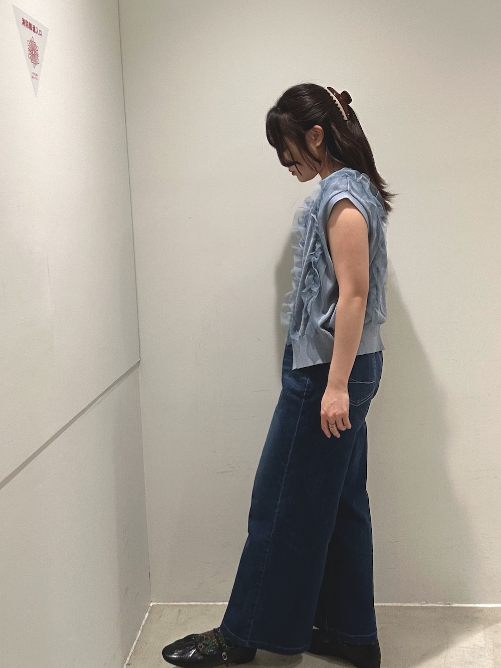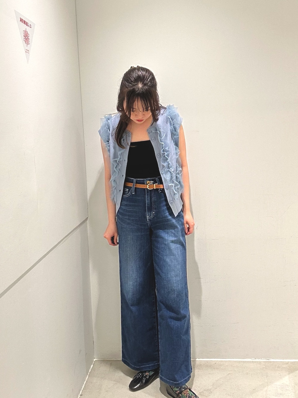 甘めなフリルのニットベストトップスも前を開けて、キャミソールを入れればカジュアルテイストで着られます!