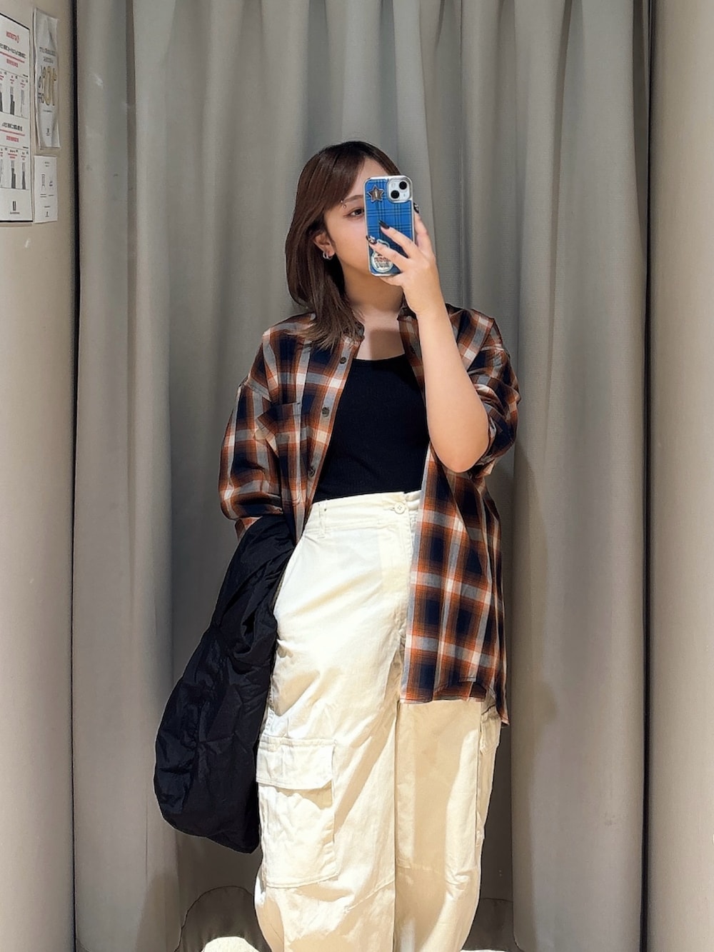チェックシャツをレイヤードして、イマドキ感も入れつつ、カジュアルなコーデです音符