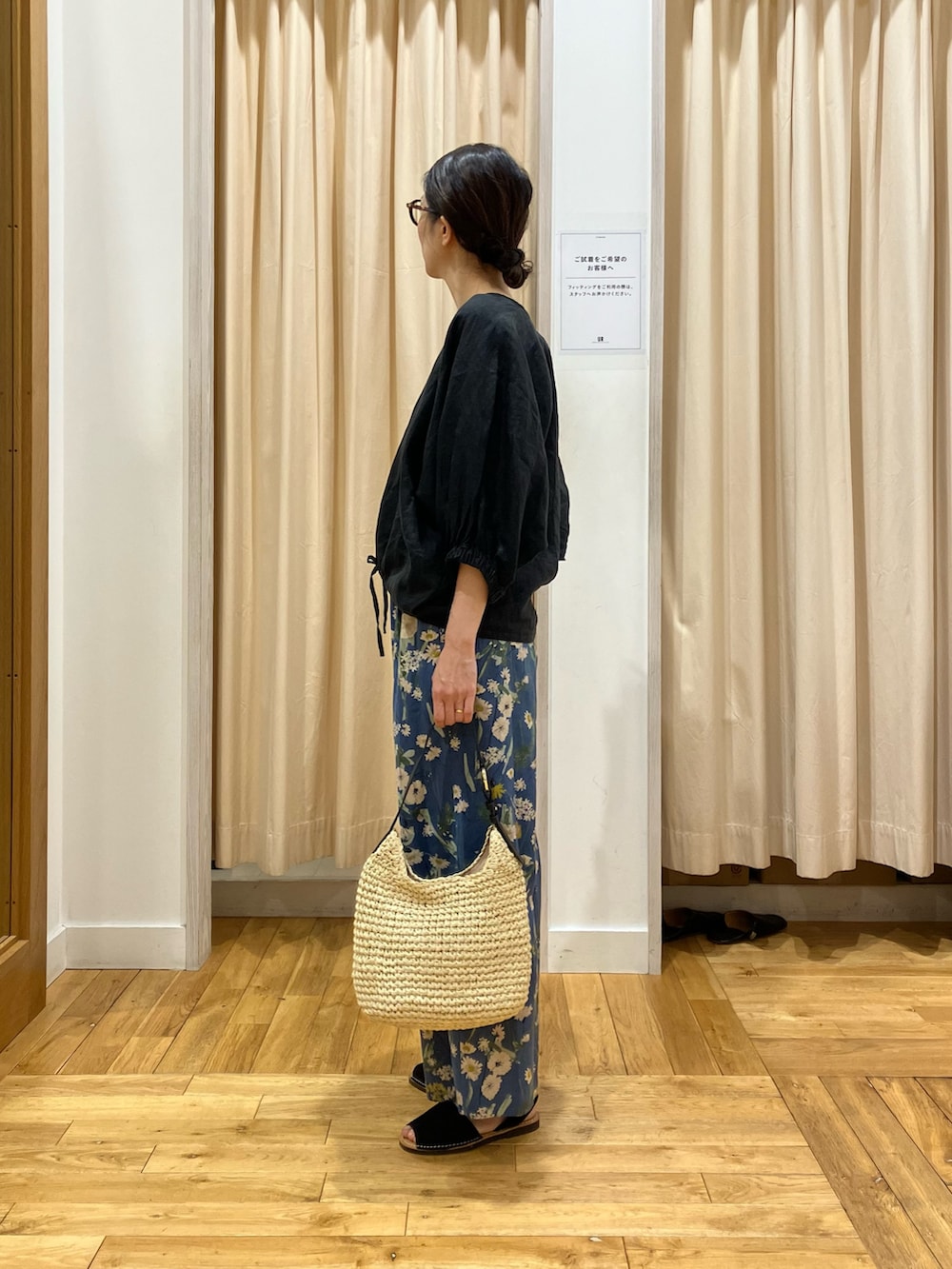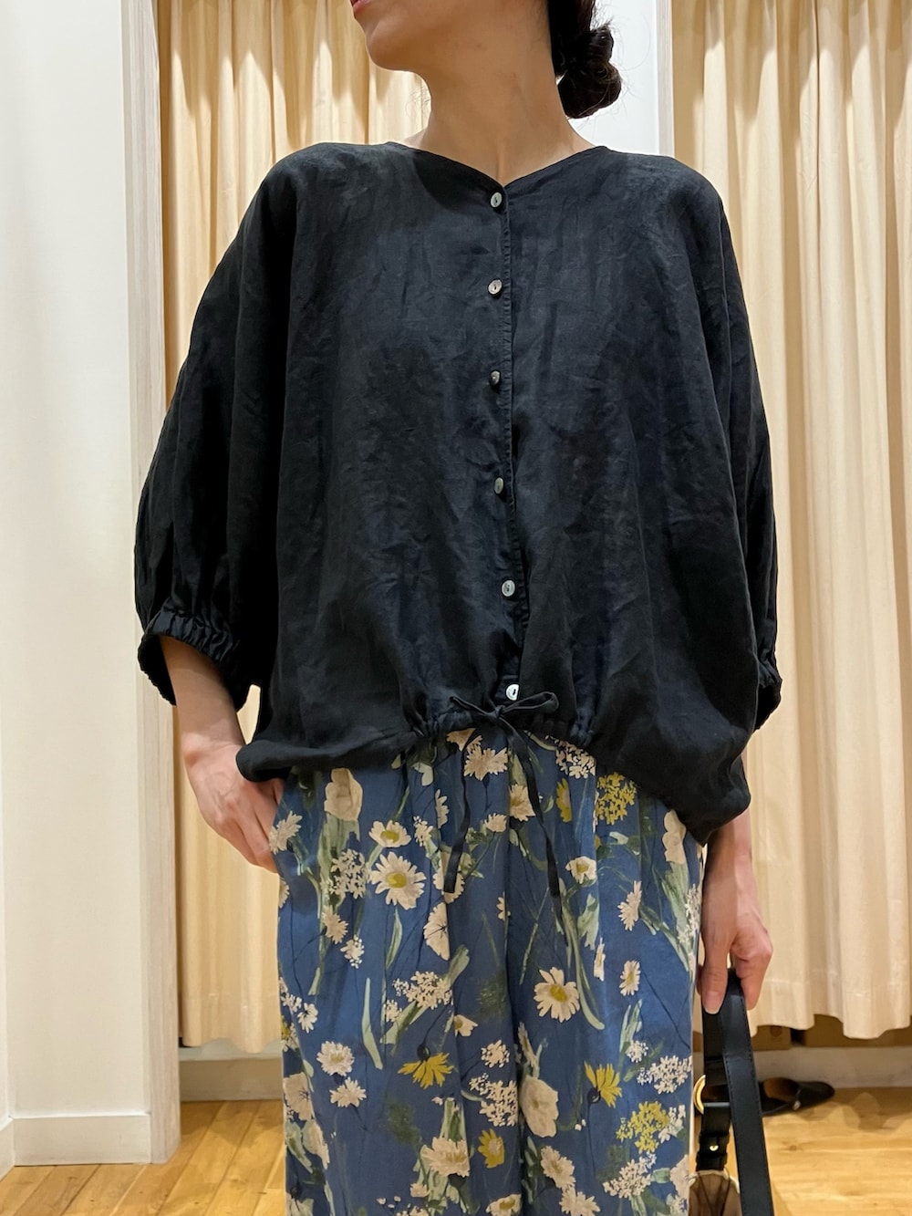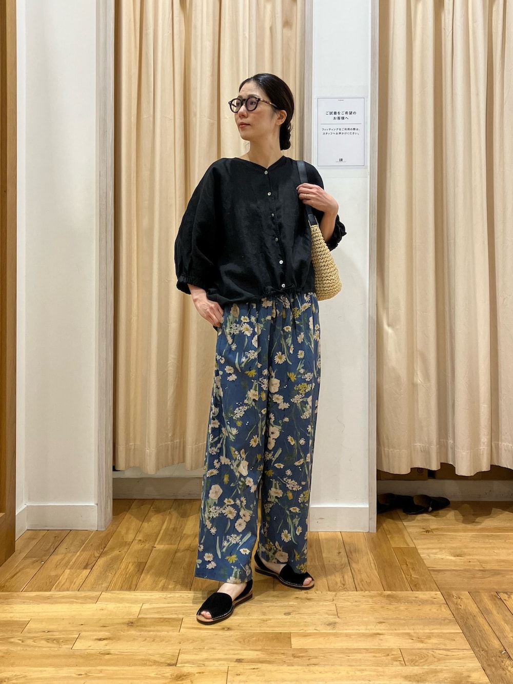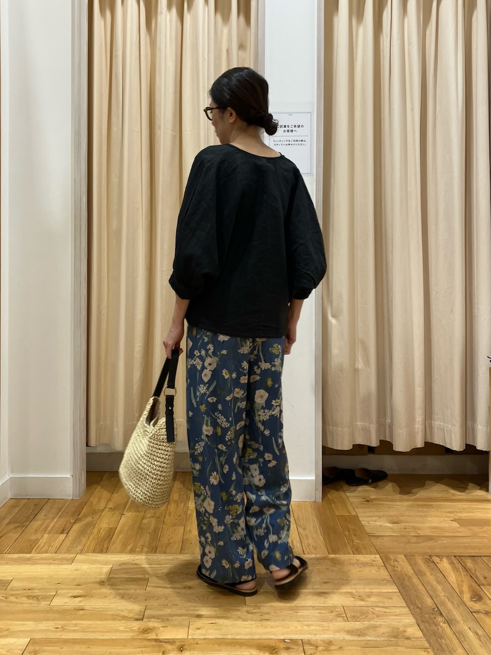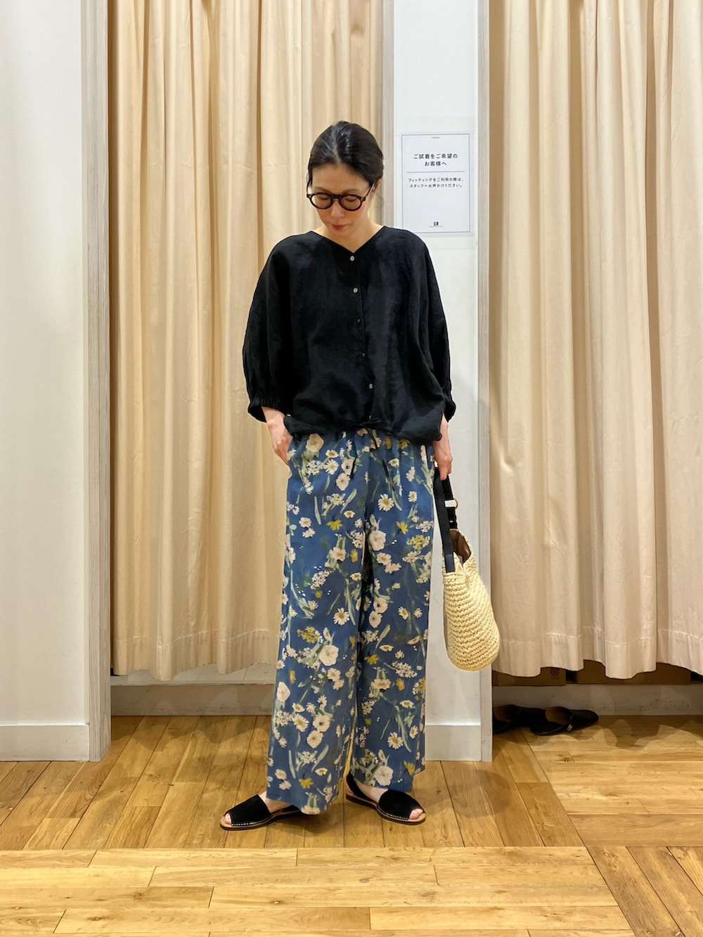 シンプルなトップスも華やかな印象になるかぐれコットンリネンプリントイージーパンツ。ワイドすぎないすっきりとしたストレートシルエットです。
