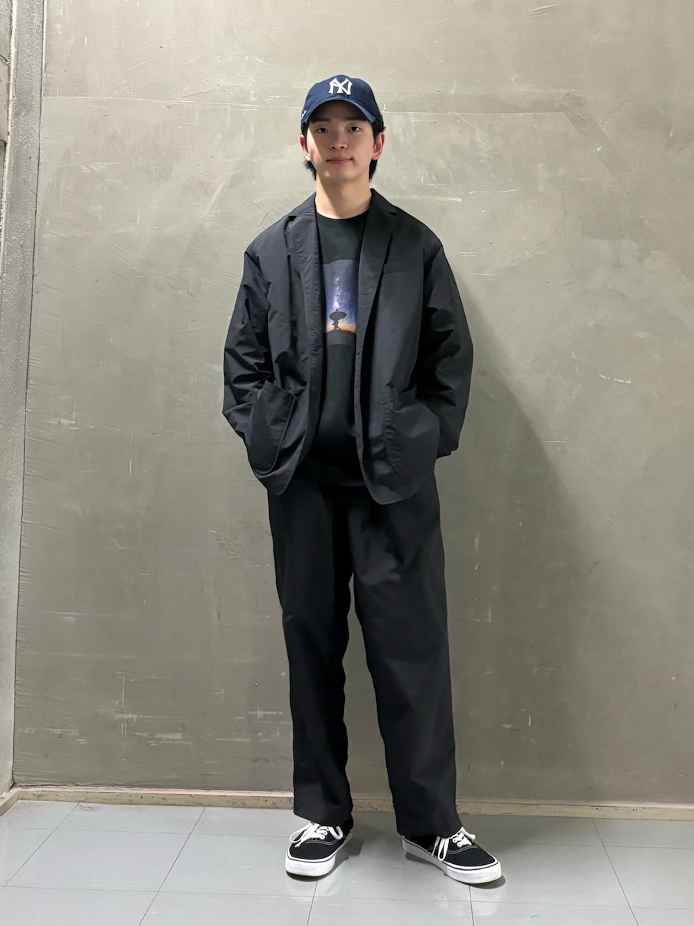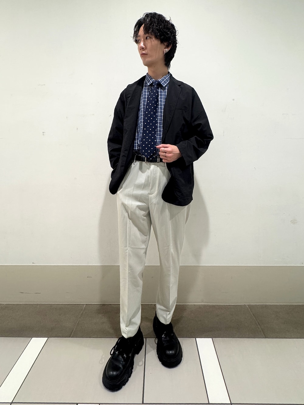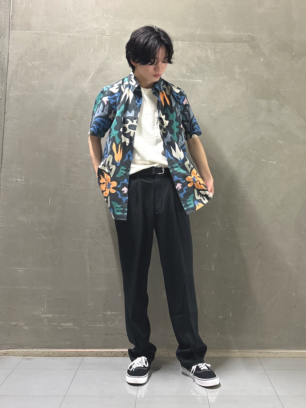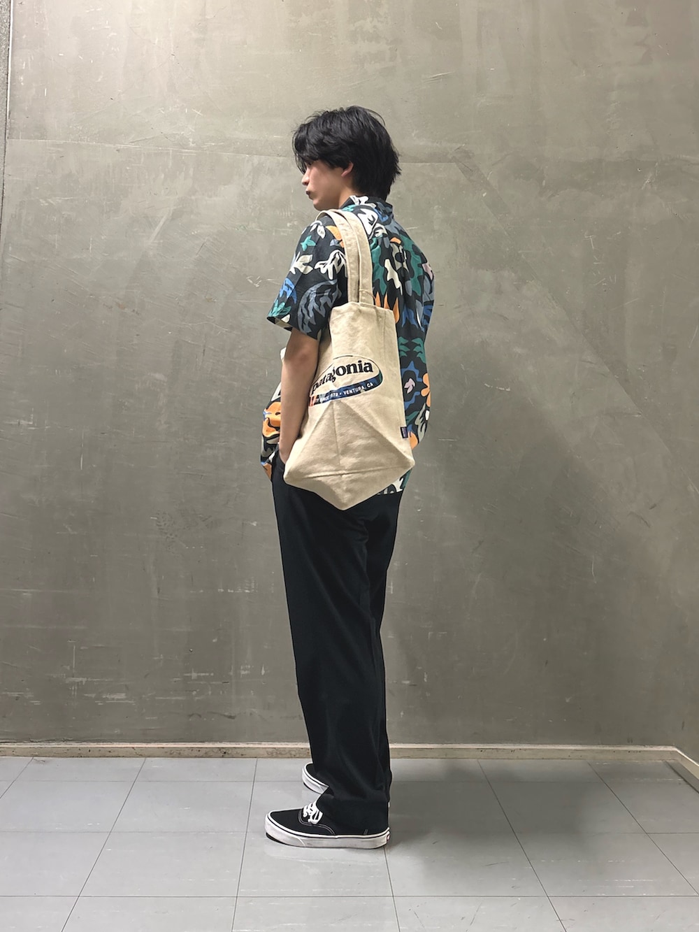 一見、主張が強く見える柄シャツですが、やや細身の黒パンツで引き締めることで、柄の良さを主役にしつつクリーンにまとめています。さらにアイボリーのトートバッグで明るさを取り入れ、全体が重くなりすぎない絶妙なバランスに仕上げました。
