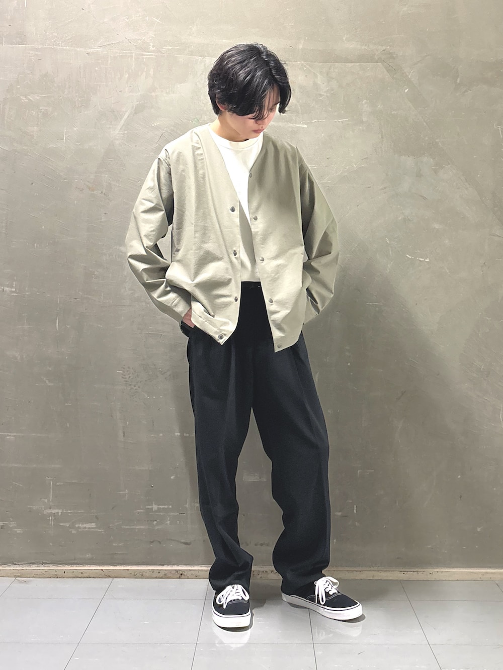 ボトムスには落ち着いたトーンのパンツを合わせることで、トップスの柔らかな色味を引き立てつつ、全体のシルエットを上品に引き締めています。