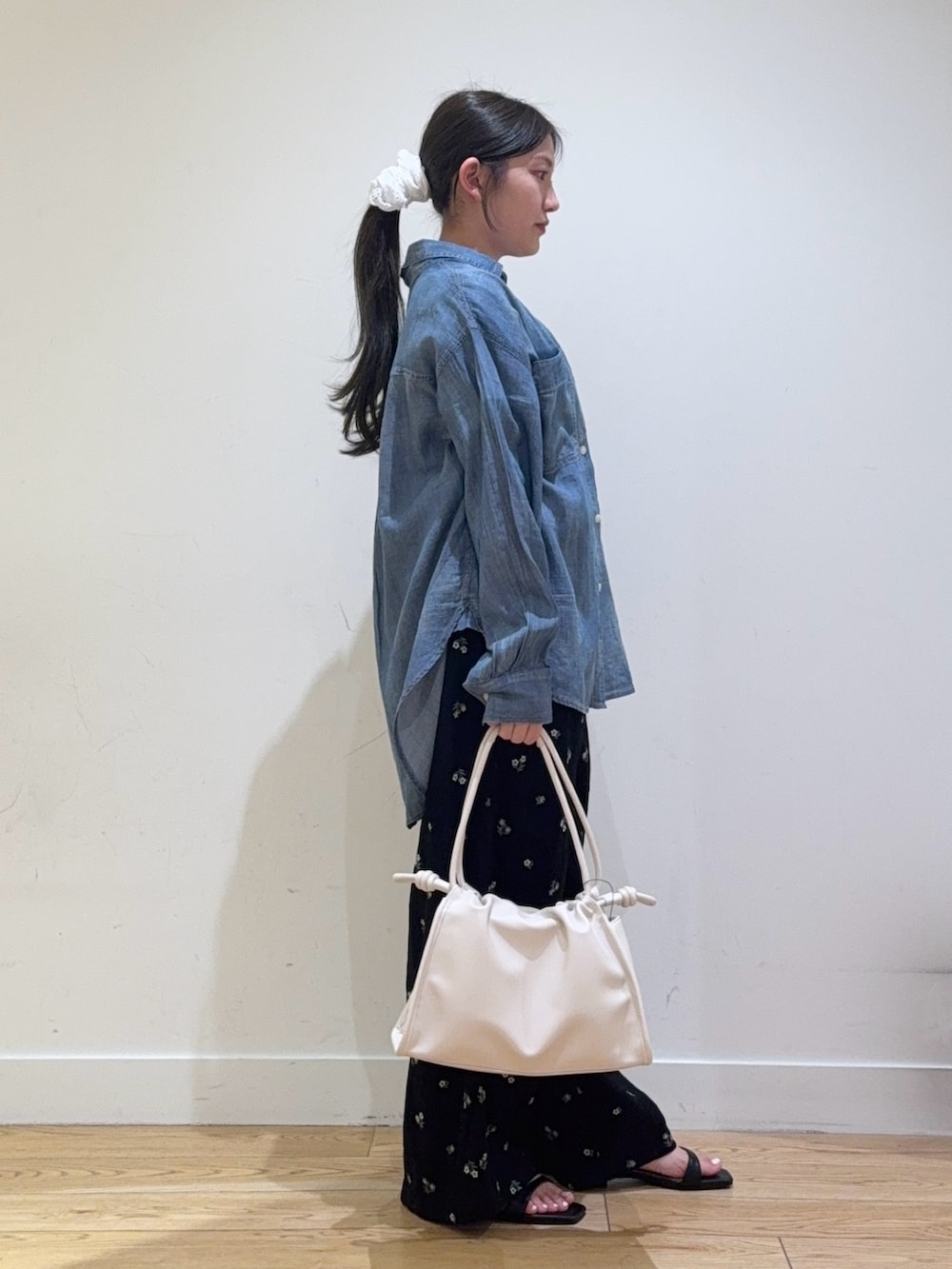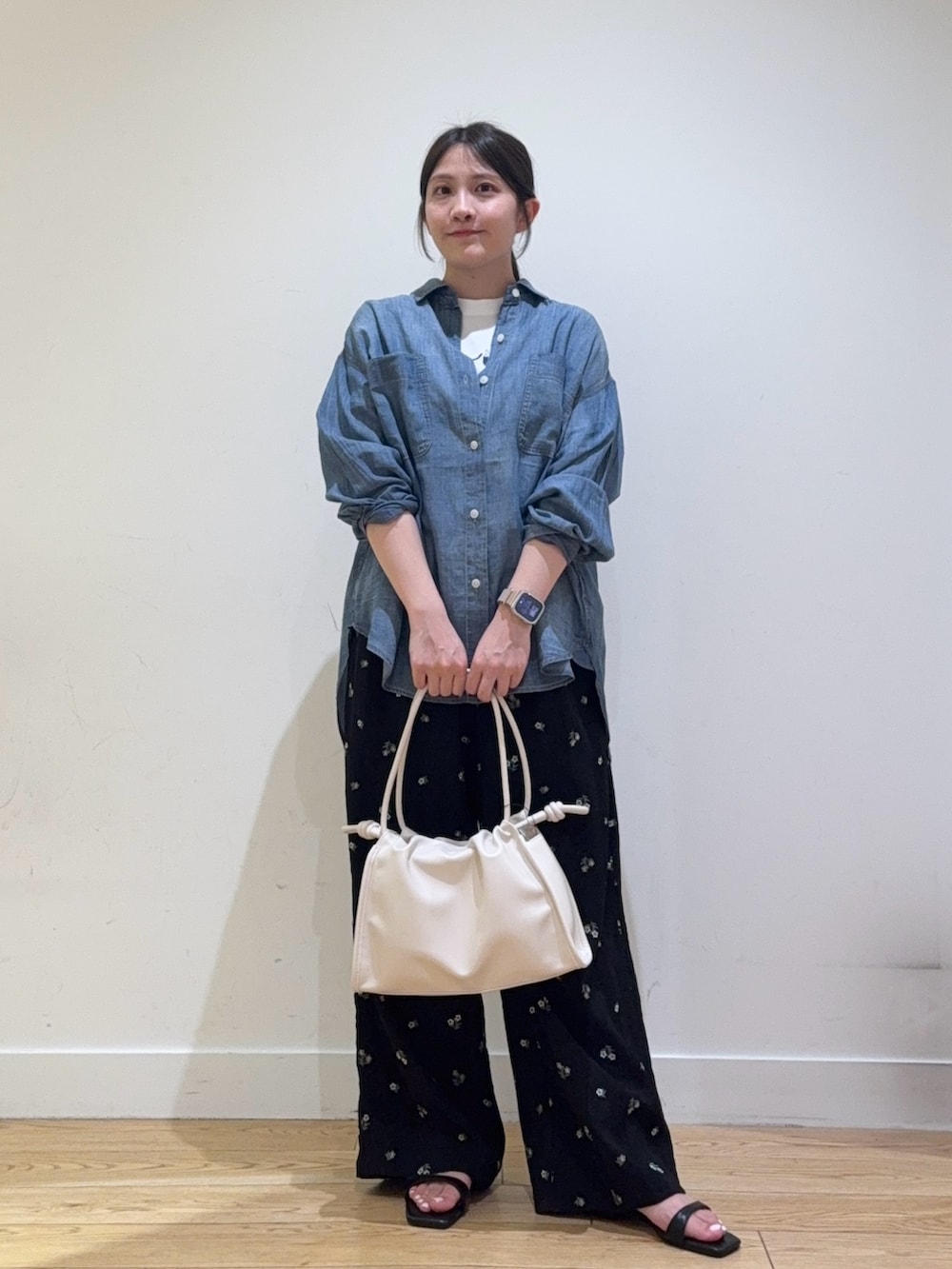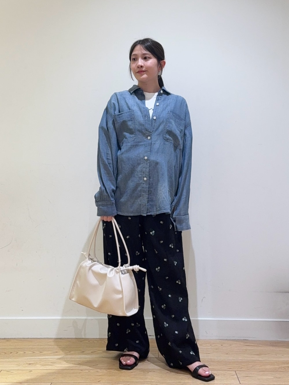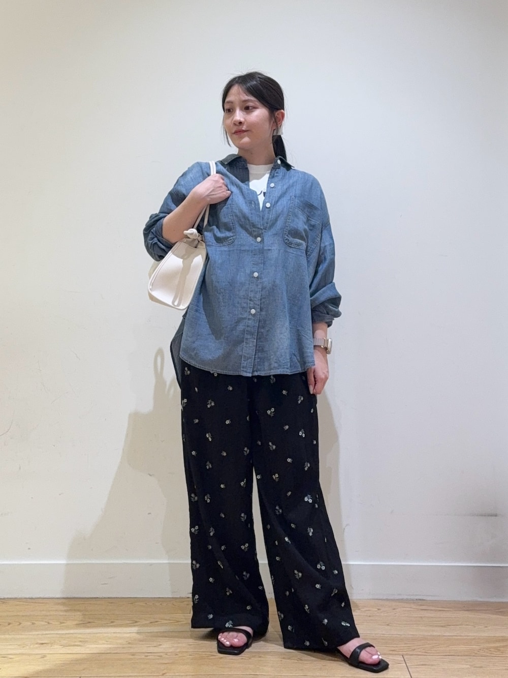 シアーデニムシャツは、羽織でもボタンをとめてトップスとして着てもかわいいです!