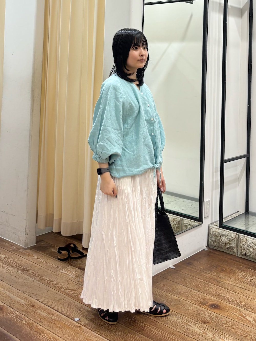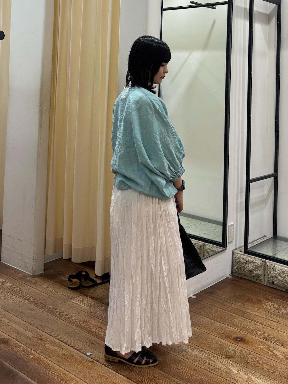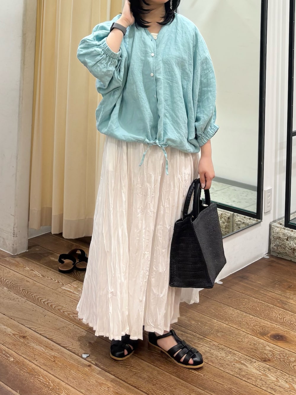季節の変わり目に主役として取り入れたい、ボリュームスリーブデザインのブラウスで、リネン特有の上品な風合いがあり、カジュアルなボトムスや小物と合わせてもきちんと感のある着こなしに仕上がります✨フロントが絞れるのでスカートやパンツ問わずバランスよく合わせていただけます◎