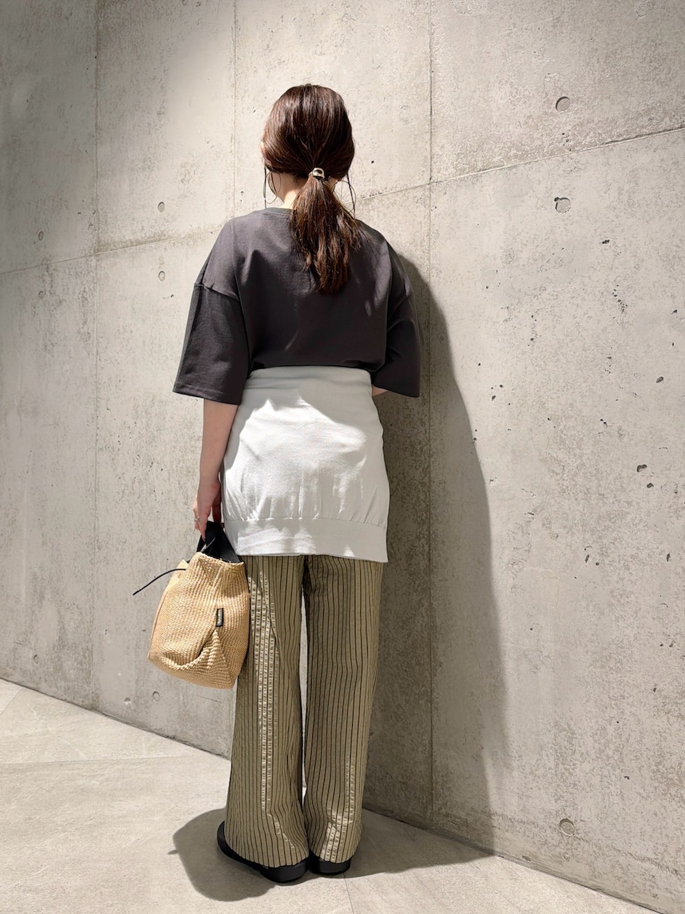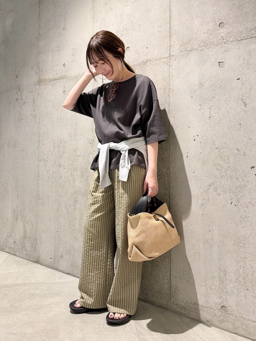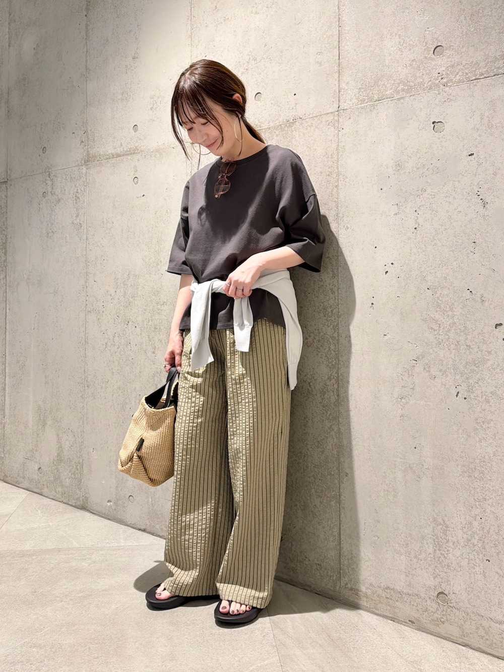 今回は、ストライプ柄のイージーパンツを合わせた、大人カジュアルコーディネートです。