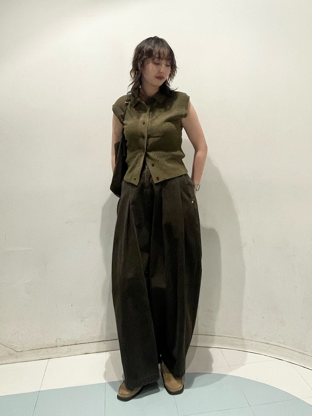 154cmの私は履き口をひと折りしてぺたんこ靴でギリギリ履けますが、少しヒールや厚底で合わせるのがおすすめな長め丈でした。
