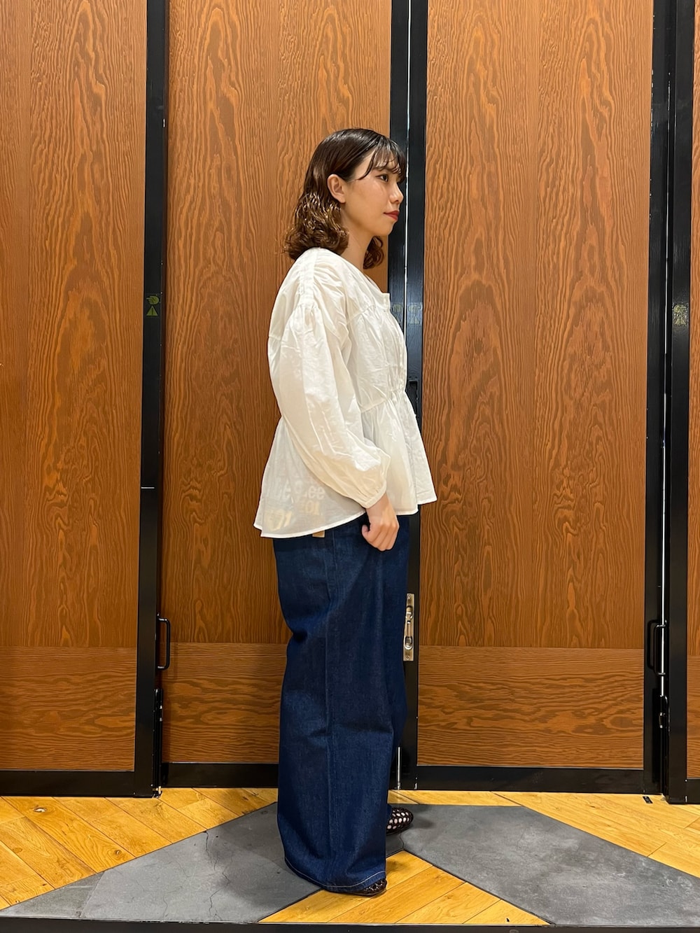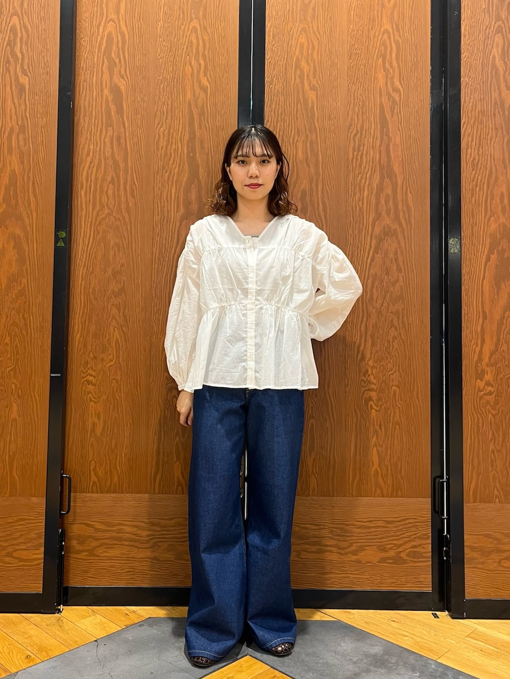 白いブラウスはシアー感があるので、これからの季節にとてもぴったりです!ボタンを開けて羽織でも使える優秀ブラウス!