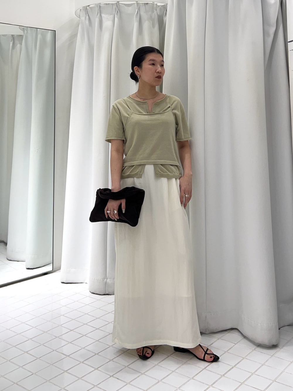 ビスチェとカーディガンがレイヤードされたトップスと合わせて、ワントーンのカジュアルコーデに^^