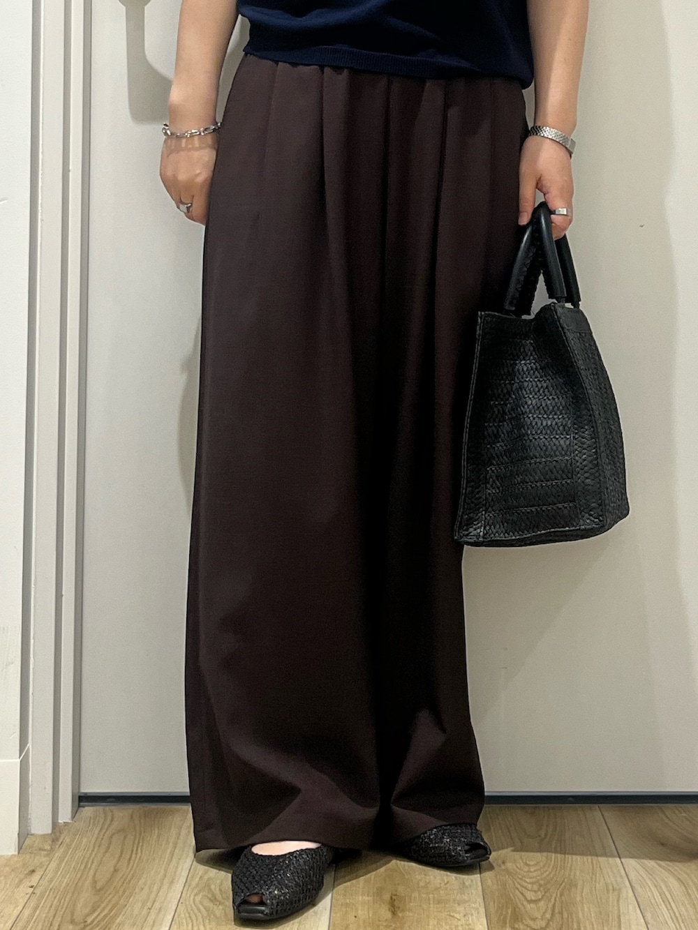 綺麗めな素材感なので、ON/OFF兼用で着用できます。