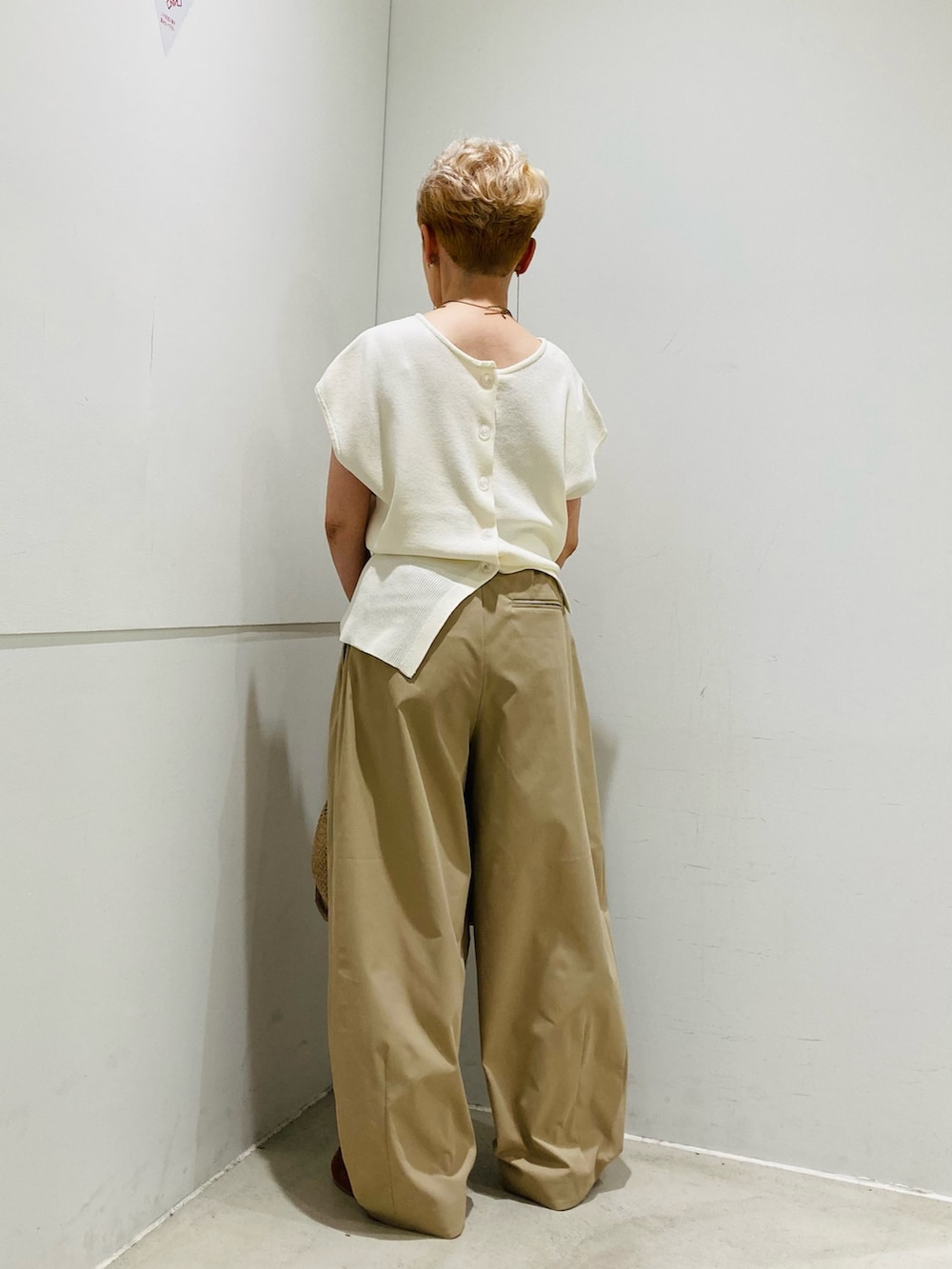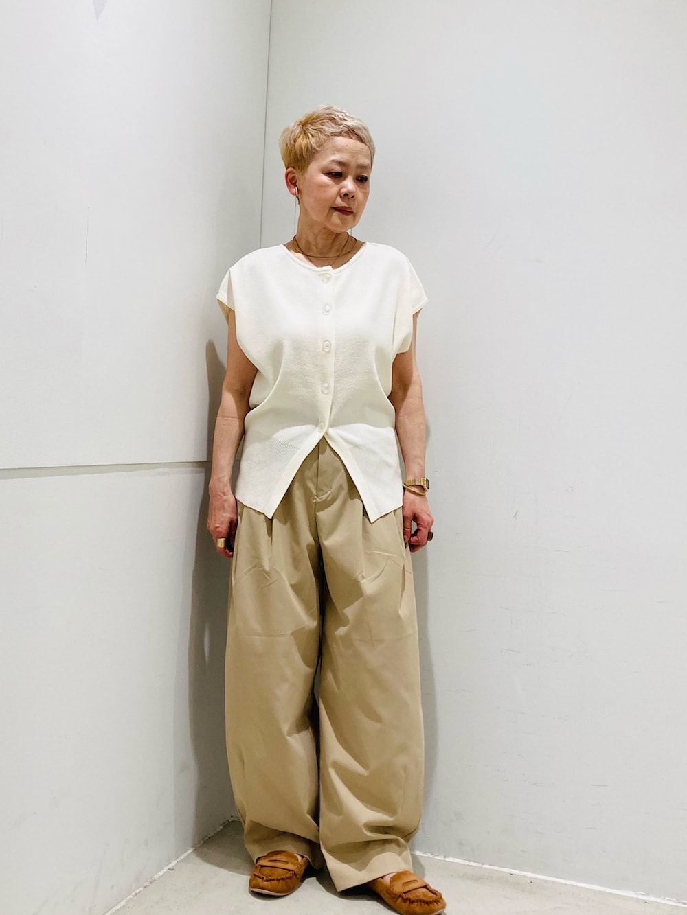 トップスは、お腹まわりのスッキリ見えるデザインで、袖口の落ち感が二の腕カバーにも👍