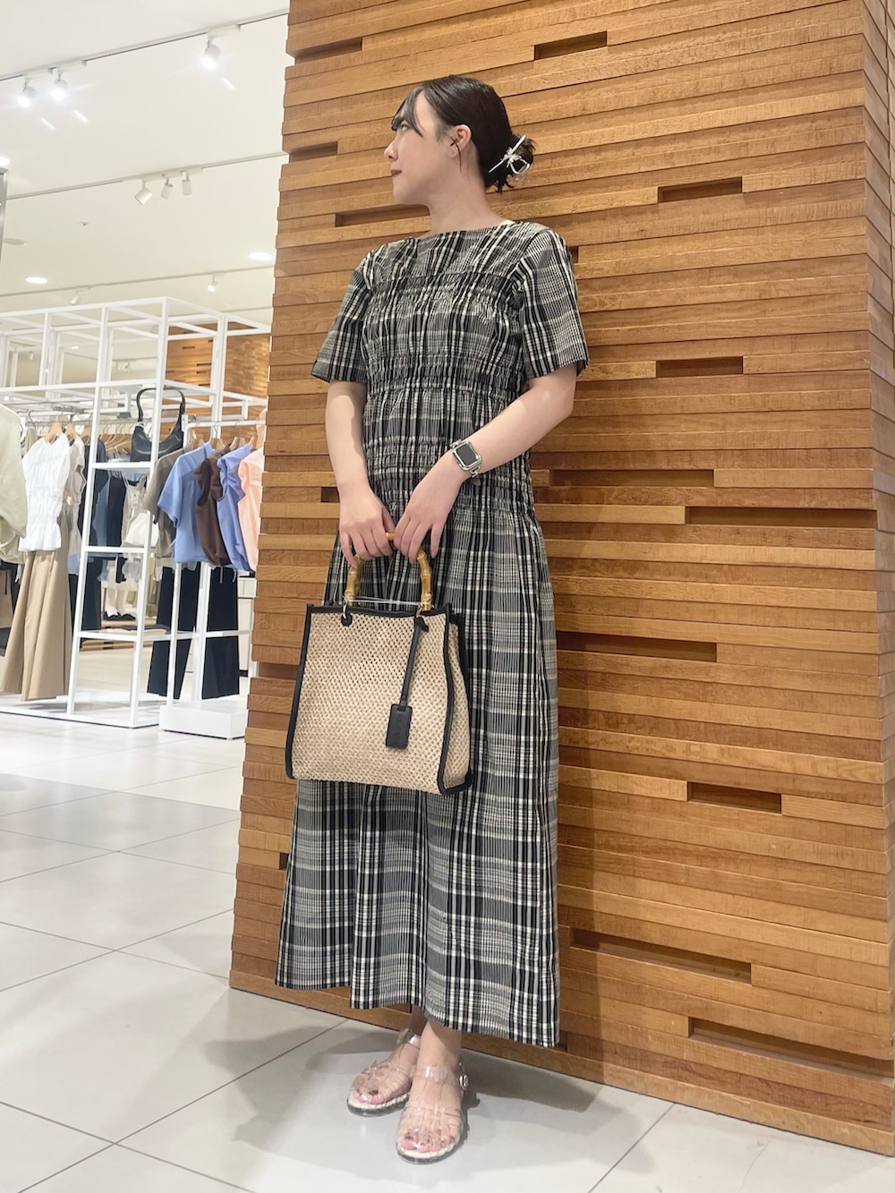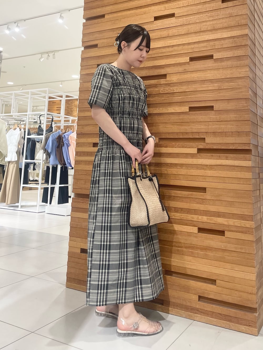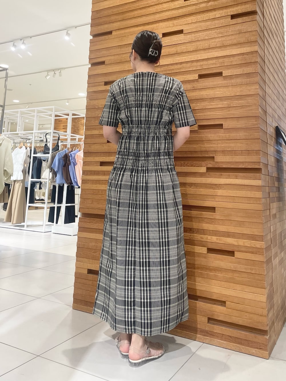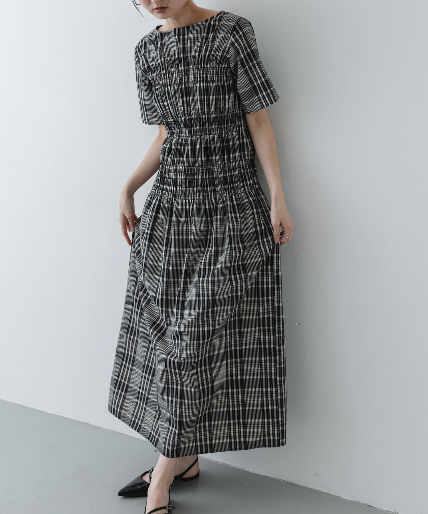 今回は視線を惹きつけるギャザーを効かせたチェックワンピースを着てみました