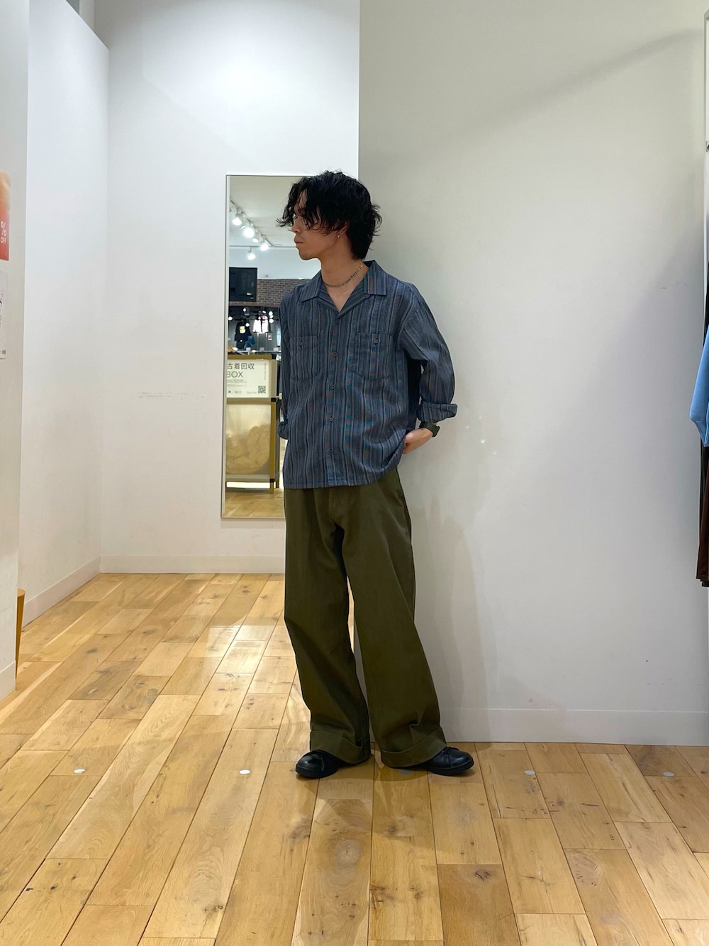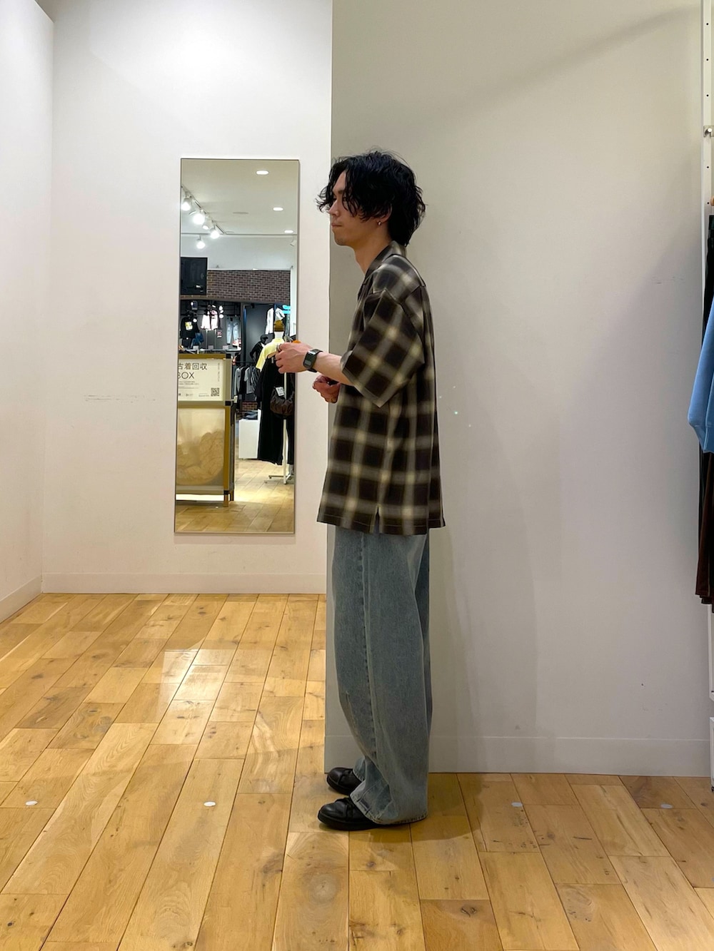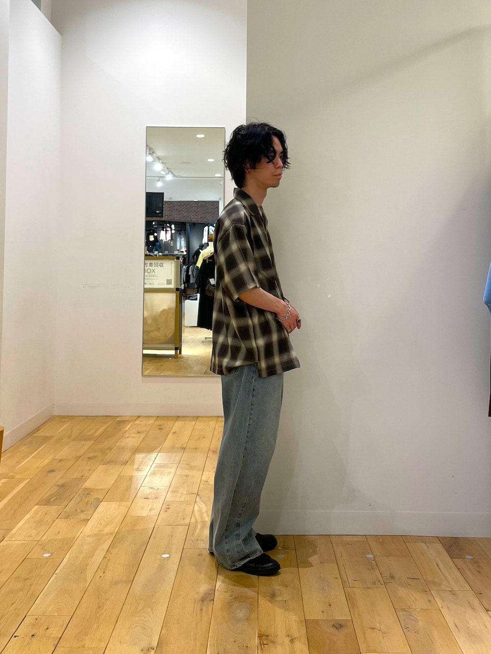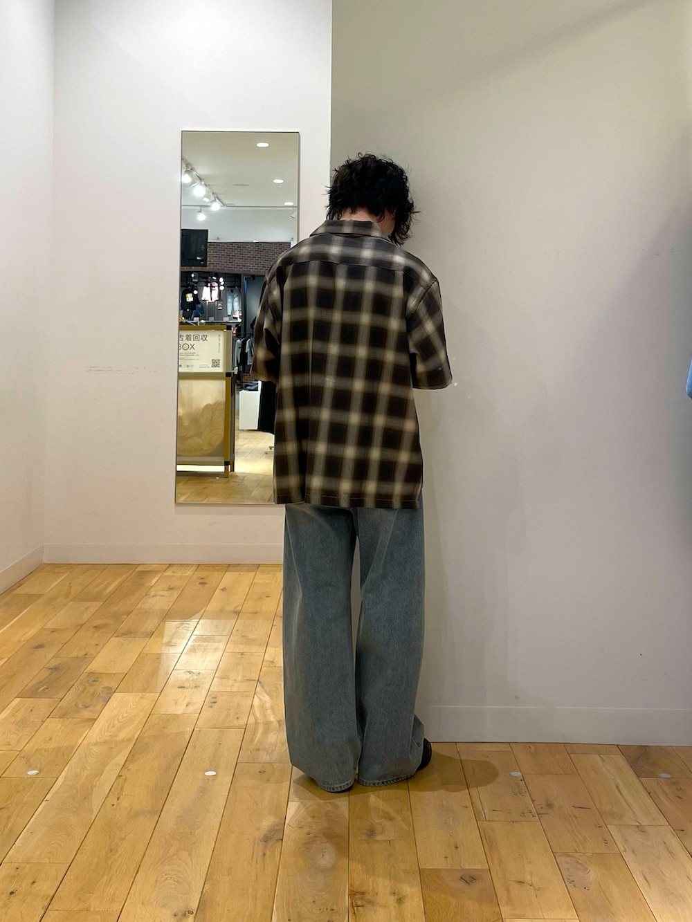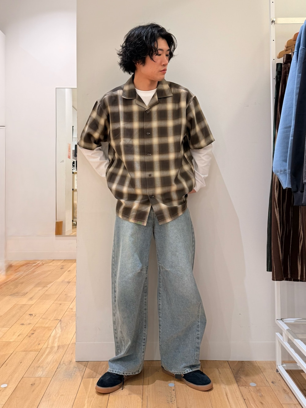 オンブレチェックにデニムのワンツースタイル。シルエットで遊びましょう。