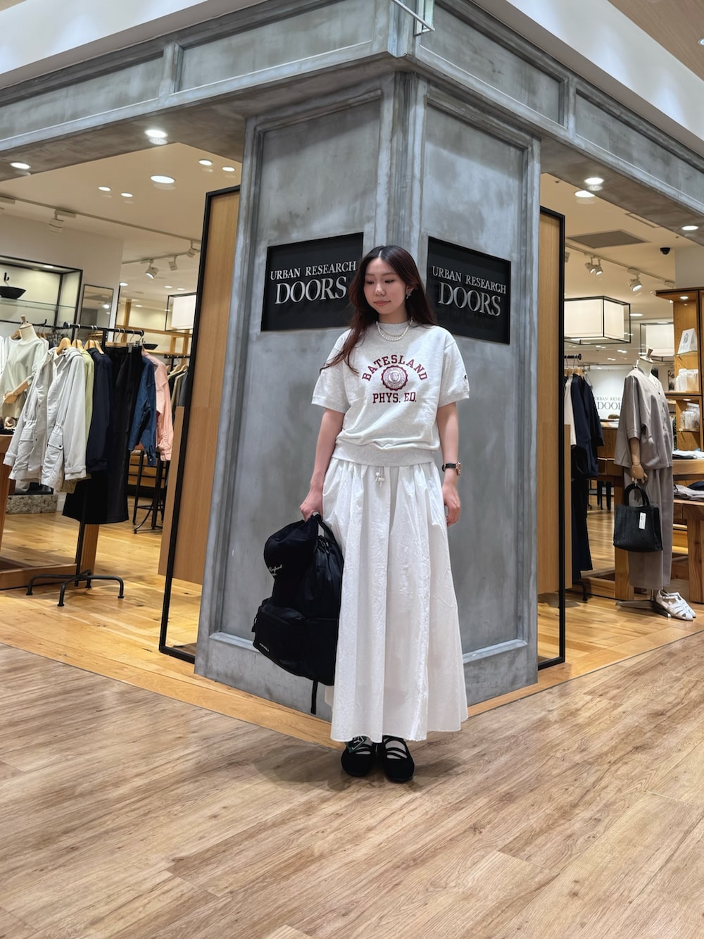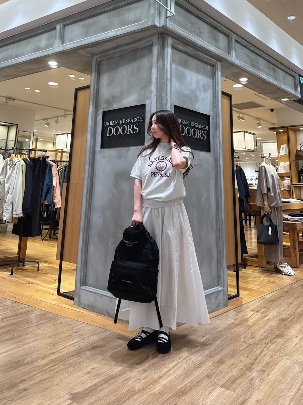 今回は、軽めなナイロン素材で仕立てたギャザースカートを合わせました!
