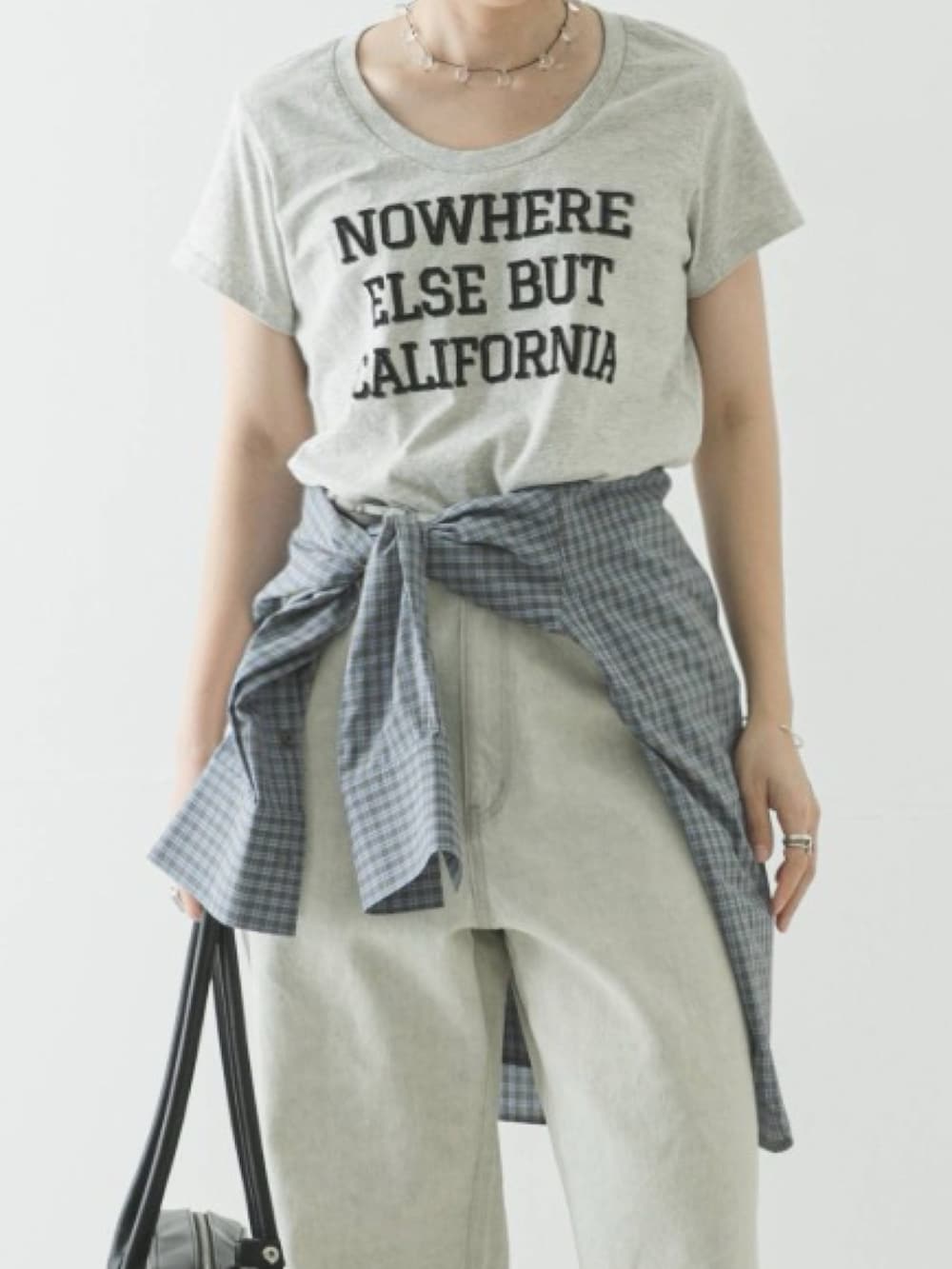 カジュアルなロゴTながら、少し広めに開いたネックラインがデコルテを綺麗に見せ、女性らしい抜け感を演出。
