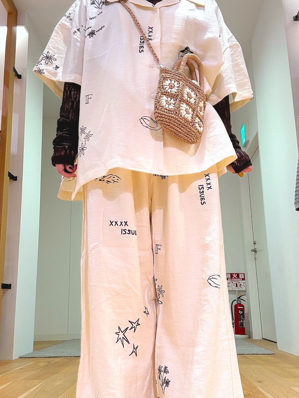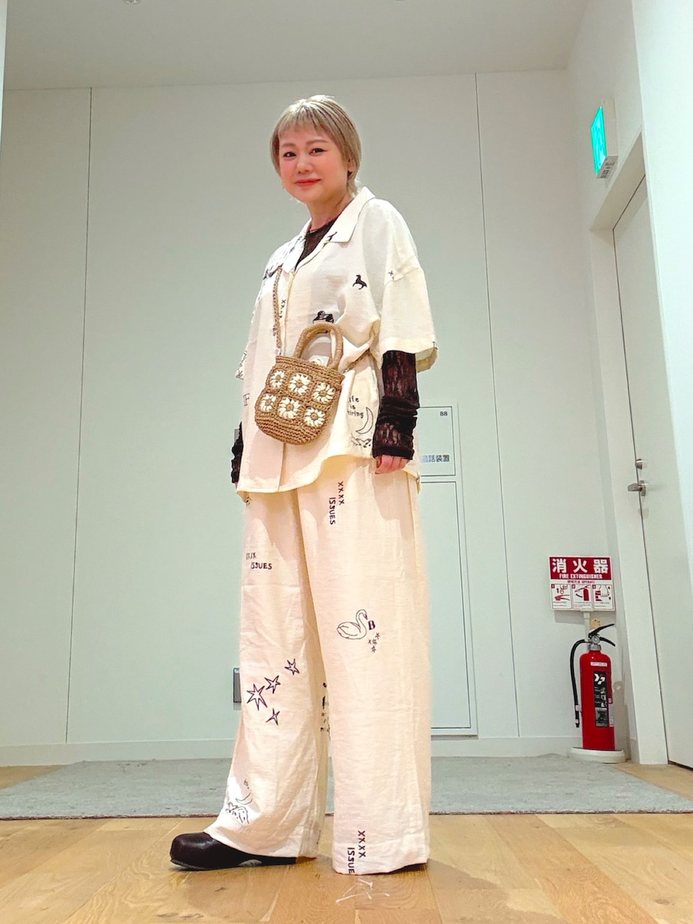 小物はナチュラルなバッグで軽さをプラスして、全体のバランスを意識。バッグはキッズのものを使用。