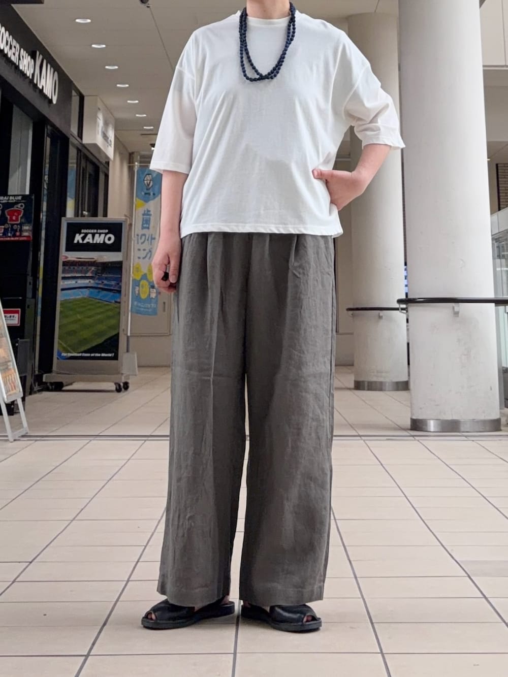 程よくゆったりしたシルエットは、下半身のラインを拾いにくく楽に着用いただけます。リネン特有の落ち感がスッキリとした印象に。