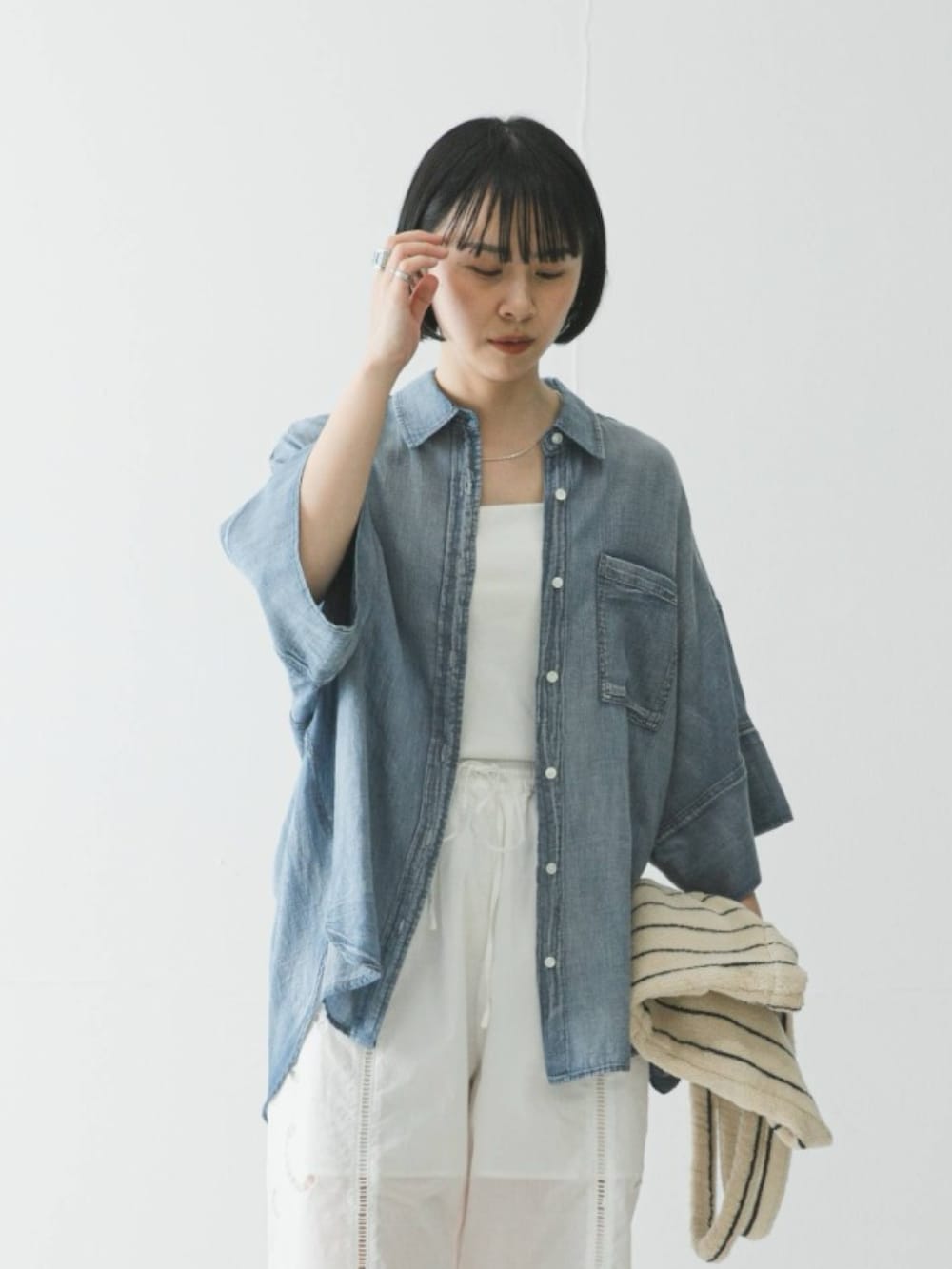 デニムの風合いをシアー素材で軽やかに纏う、ハーフスリーブシアーデニムシャツ。