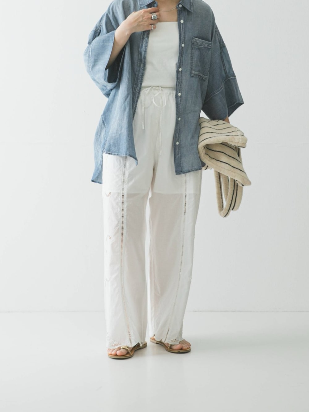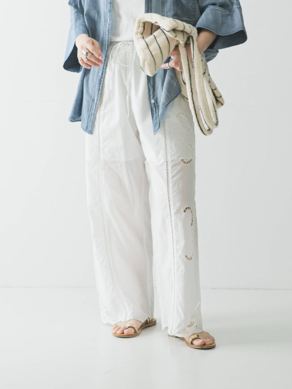 涼やかで快適な穿き心地、一枚で華やかに映えるカットワークレースイージーパンツ。