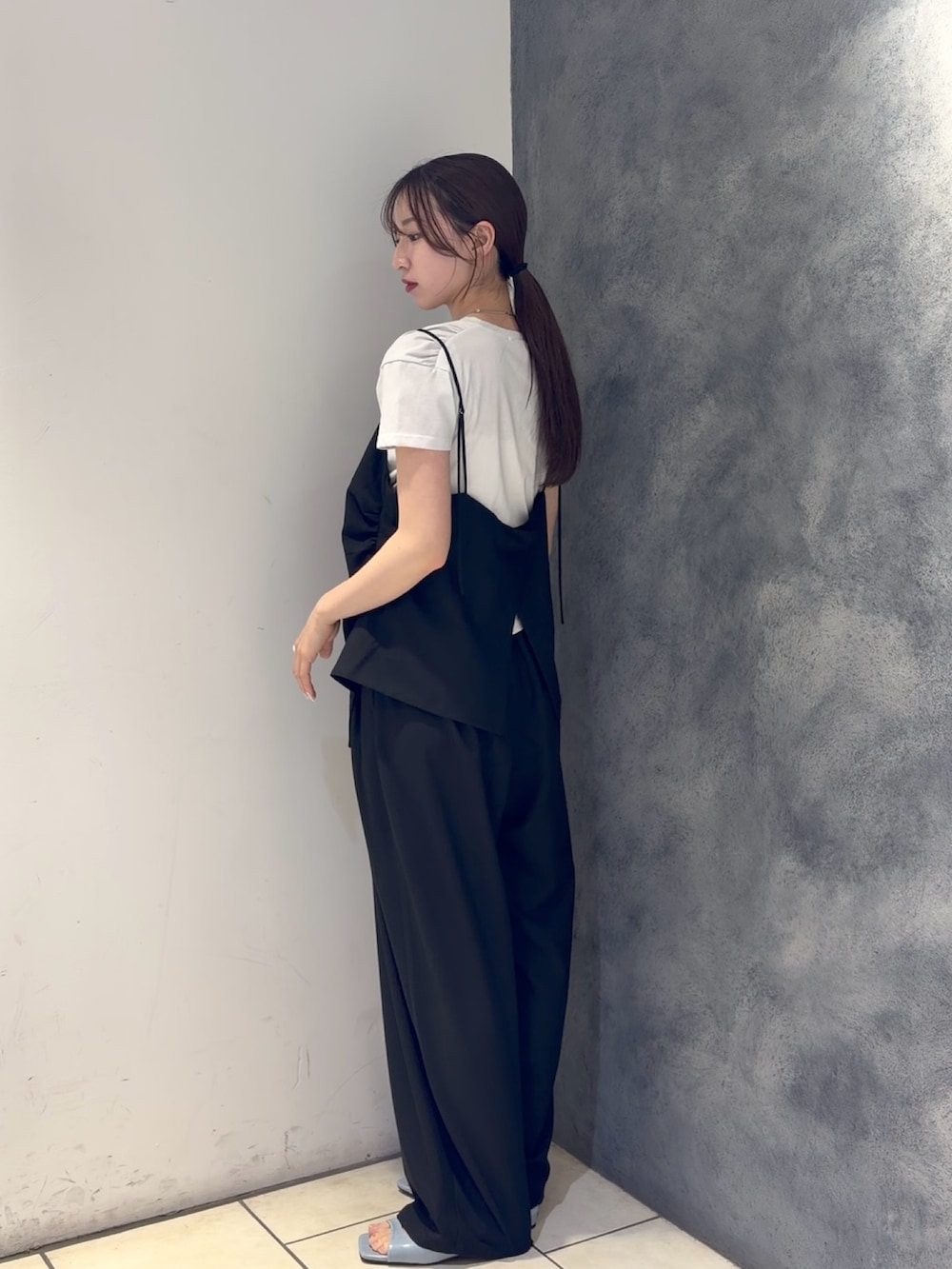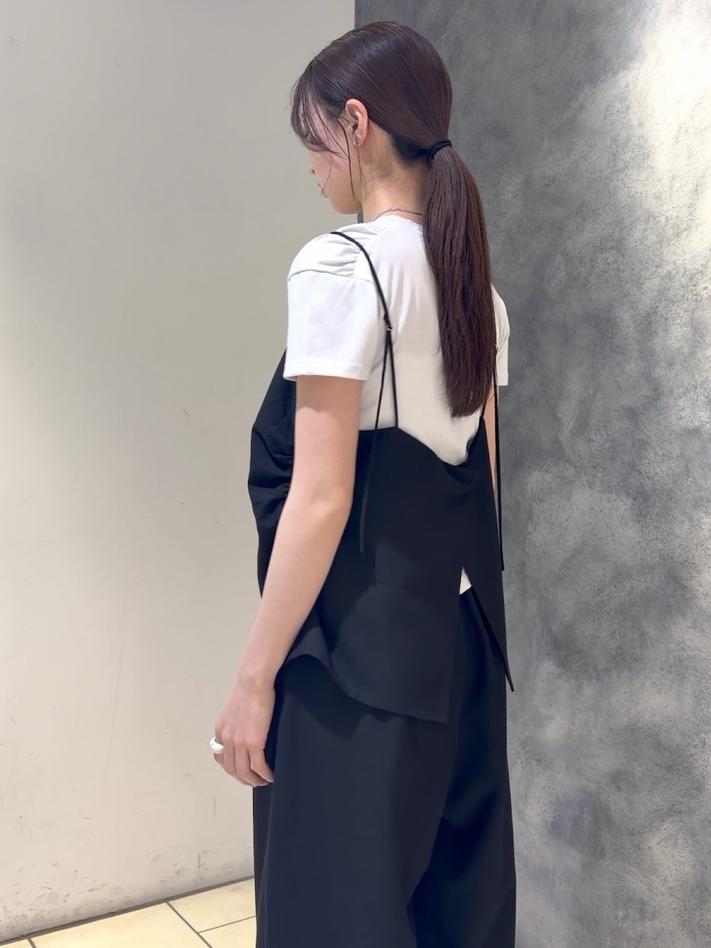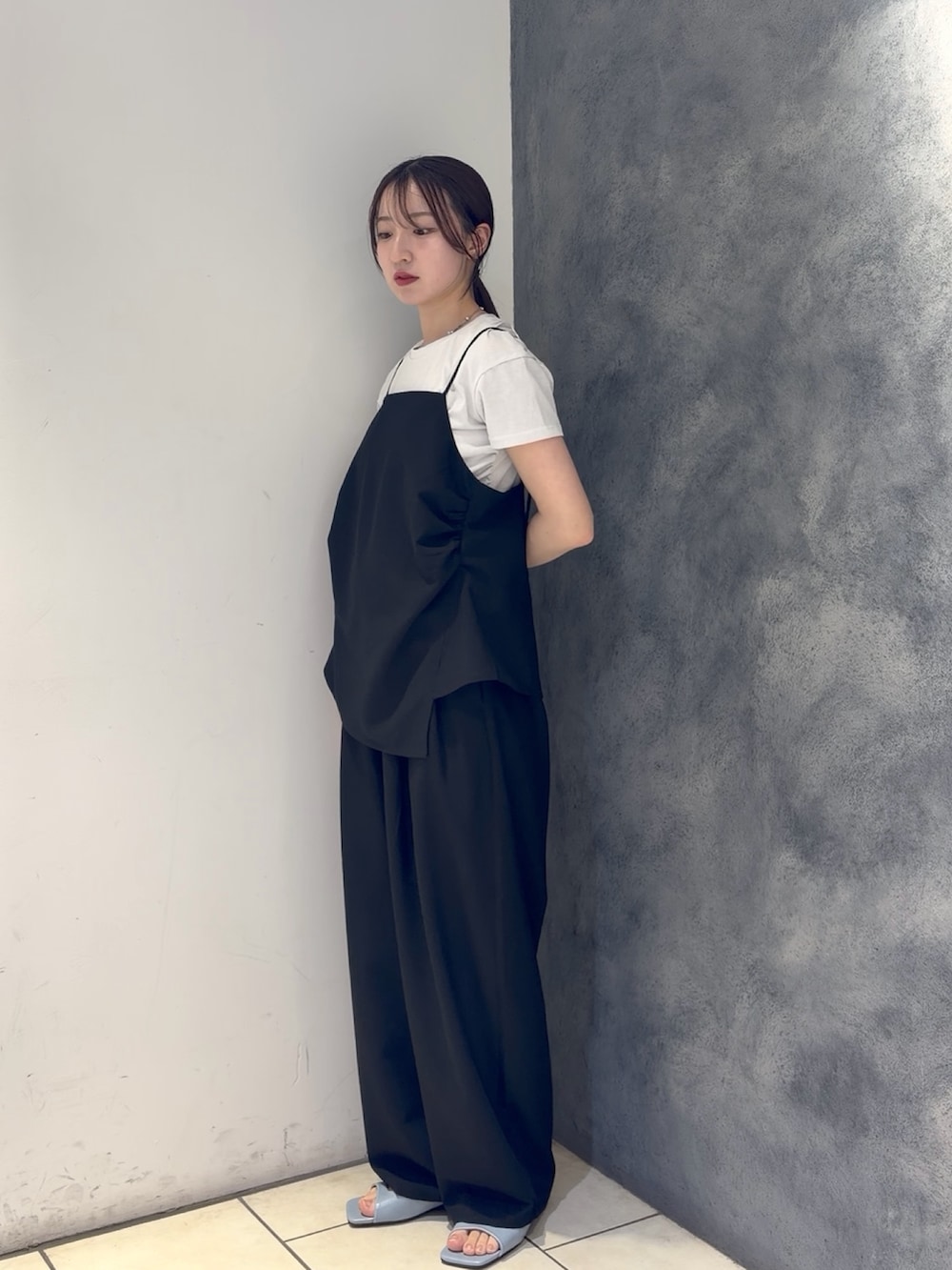 シンプルなTシャツにキャミトップスをレイヤードした、こなれ感のあるスタイリング🩶